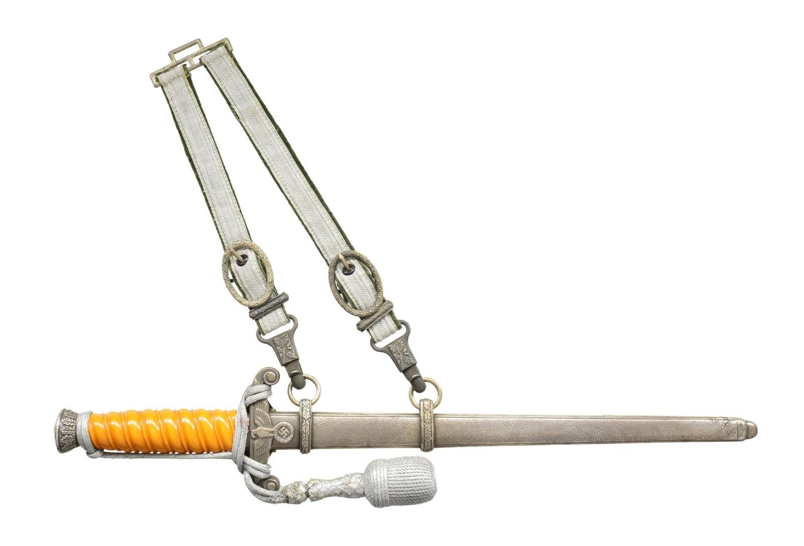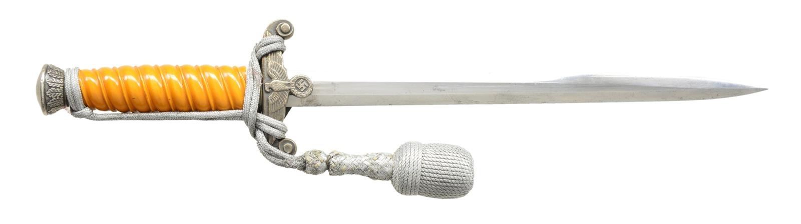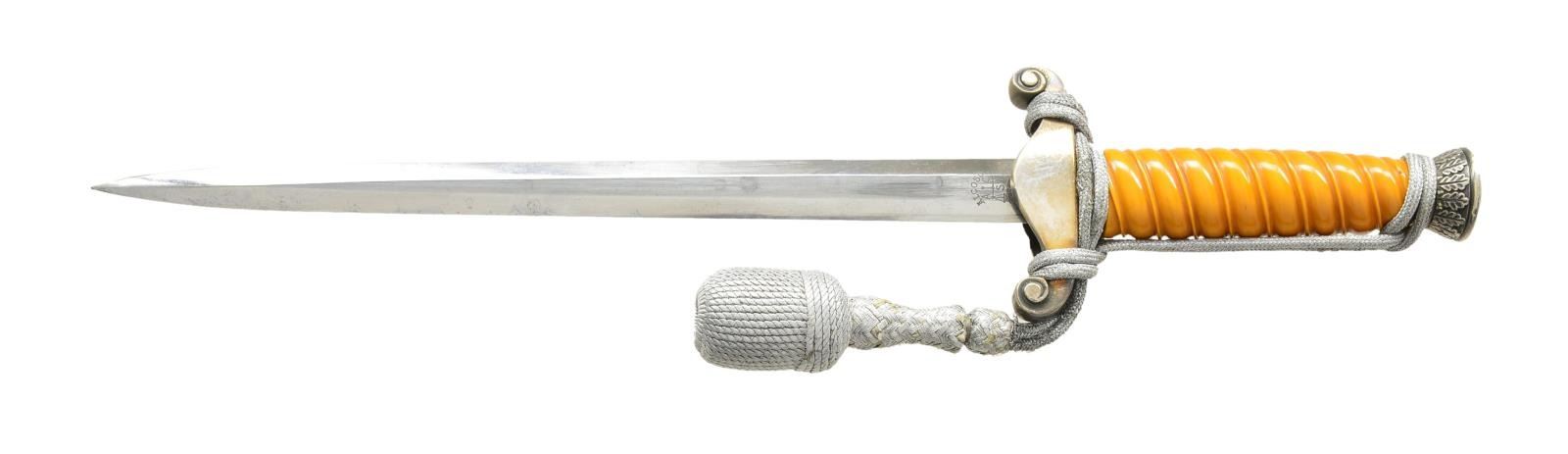 Overall length 15 3/4". Plain blade is marked on the reverse “ALCOSO A C S (with scale) SOLINGEN”. Silvered eagle cross guard with oak leaf decorated pommel & ferrule. Dark orange composite grip with correctly tied knot. Plated scabbard with correct original hanger attached. CONDITION: blade shows evidence of being buffed. Mounts have a pleasing tarnished finish. Grip is undamaged and knot shows light to moderate wear. Scabbard has an overall tarnished finish with an area of surface bubbling near the tip. Hanger shows very light wear. PROVENANCE: From the Lifelong Collection of Glen E. Mattox. (02-18206/BF). $400-600.