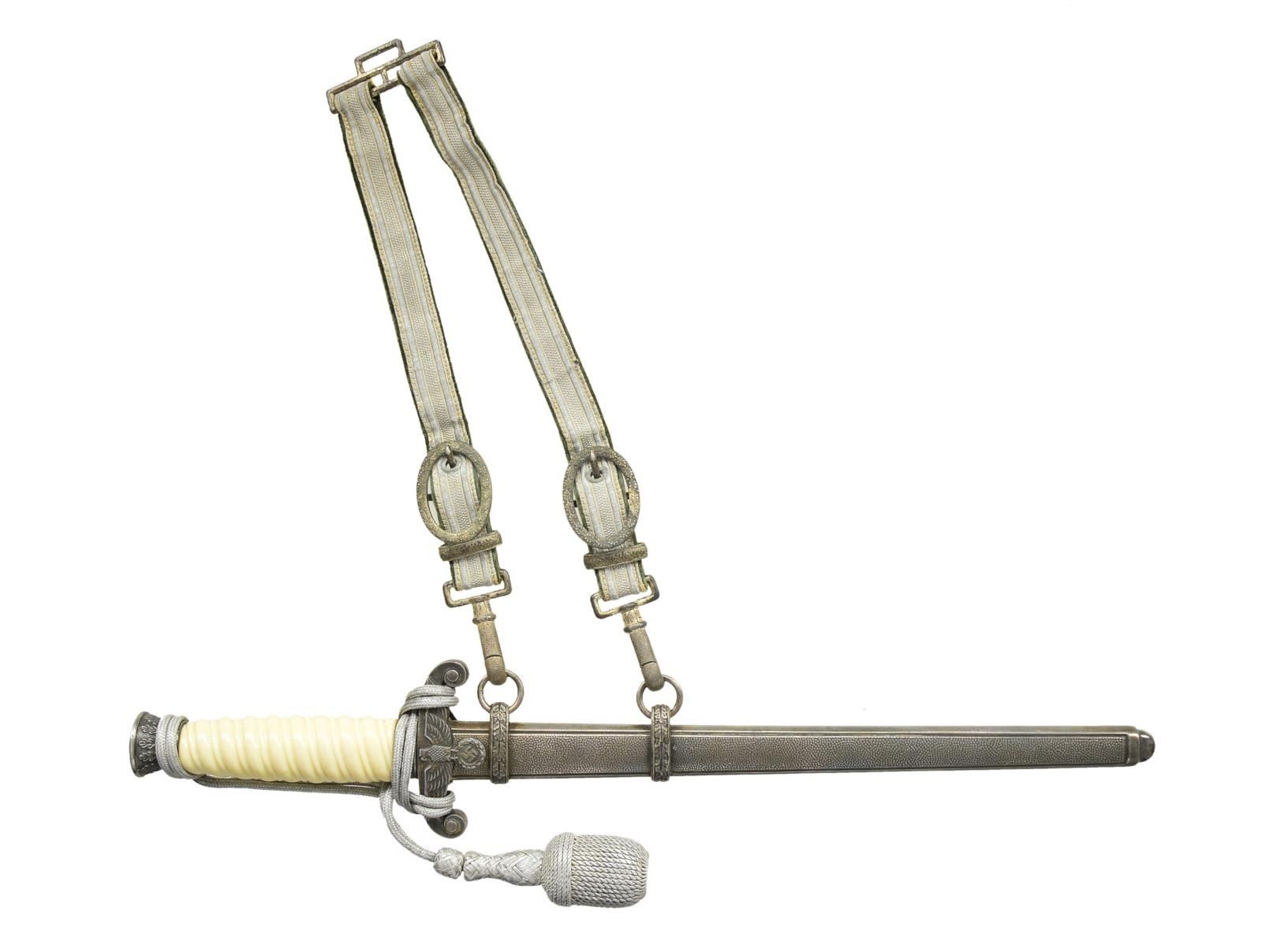 Overall length 15 3/4". Plain blade is marked on the reverse “F. W. HOLLER (logo) SOLINGEN”. Silvered eagle cross guard with oak leaf decorated pommel & ferrule. White composite grip with correctly tied knot. Plated scabbard with correct original hanger attached. CONDITION: blade shows scabbard wear. Mounts have a pleasing dark tarnished finish. Grip is undamaged and knot shows light wear. Scabbard has an overall dark tarnished finish. Hanger shows very light wear. PROVENANCE: From the Lifelong Collection of Glen E. Mattox. (02-18235/BF). $450-650.