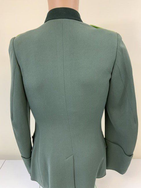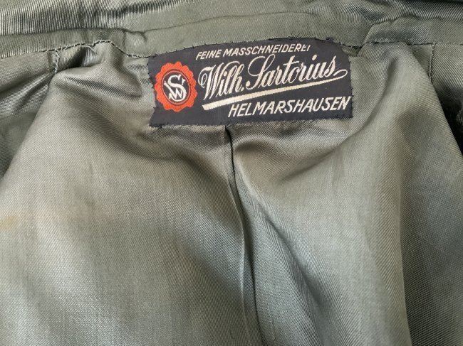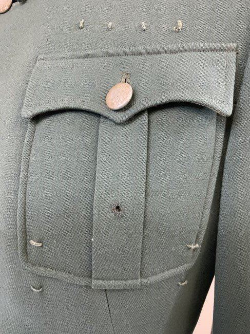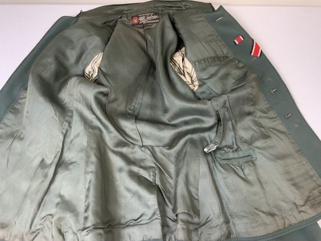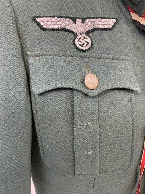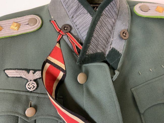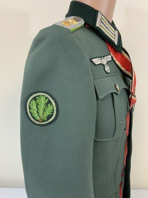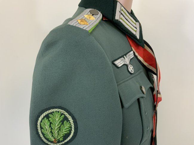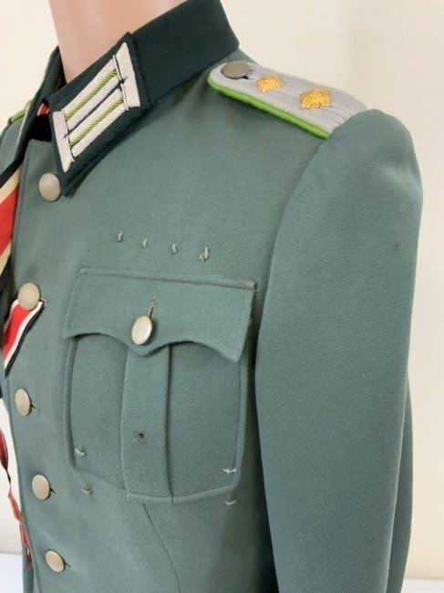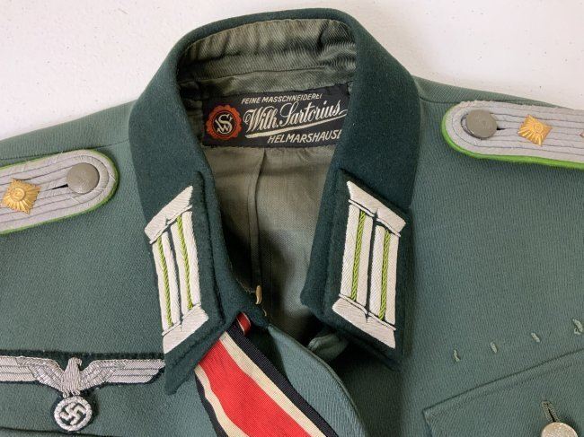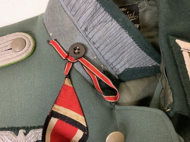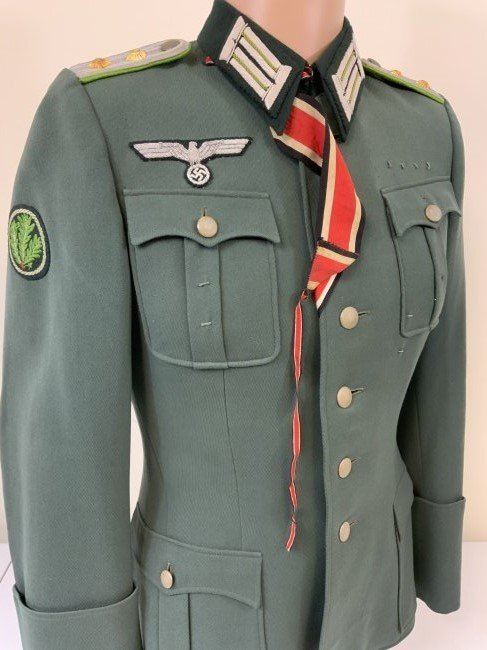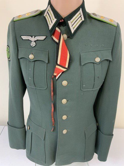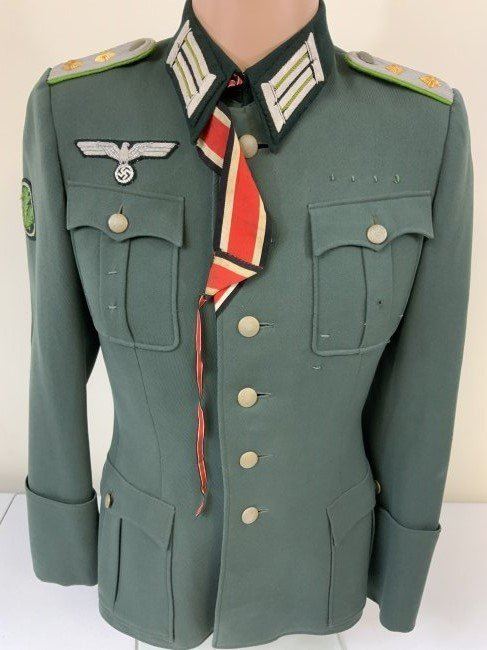 WWII GERMAN ARMY JAGER MOUNTAIN DIVISION OFFICER SERVICE UNIFORM TUNIC . MINT CONDITION HAUPTMANN RANK TUNIC. BEAUTIFUL TAYLOR MADE WITH NICE TAYLOR TAG INSIDE. JAGER SLEEVE PATCH . KNIGHT CROSS RIBBON AND ATTACHING BUTTONS UNDER COLLAR . MANY AWARD LOOPS INCLUDING FOR GERMAN CROSS IN GOLD ON THE RIGHT SIDE AND A FINISHED HOLE FOR A SCREW BACK AWARD. THIS IS A RARE FIND ESPECIALLY IN THIS FINE CONDITION.