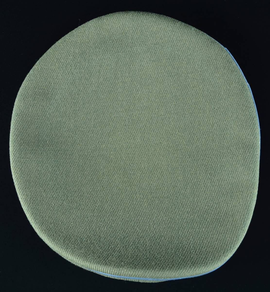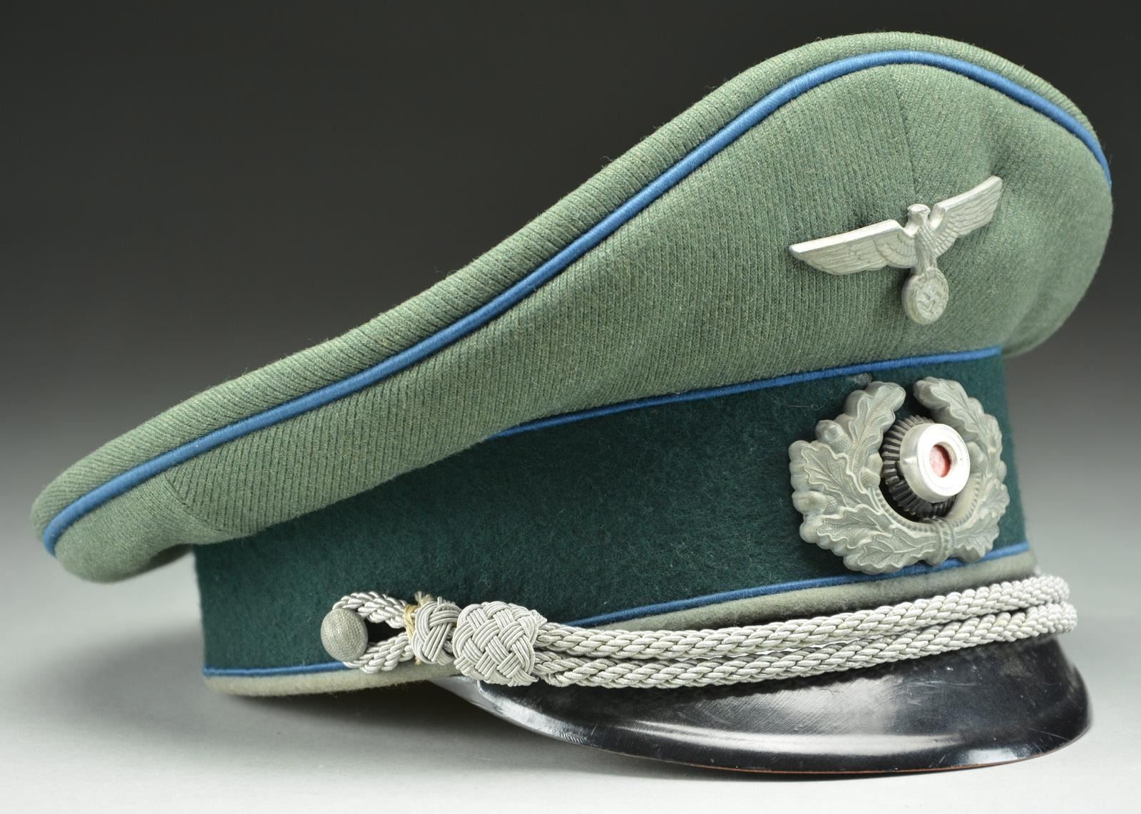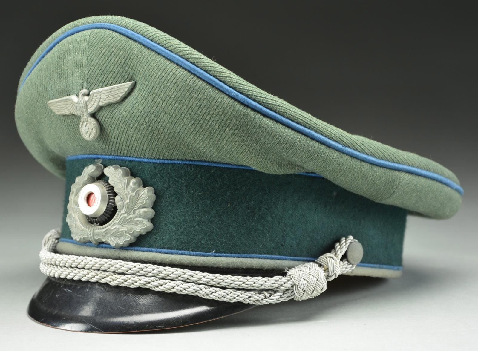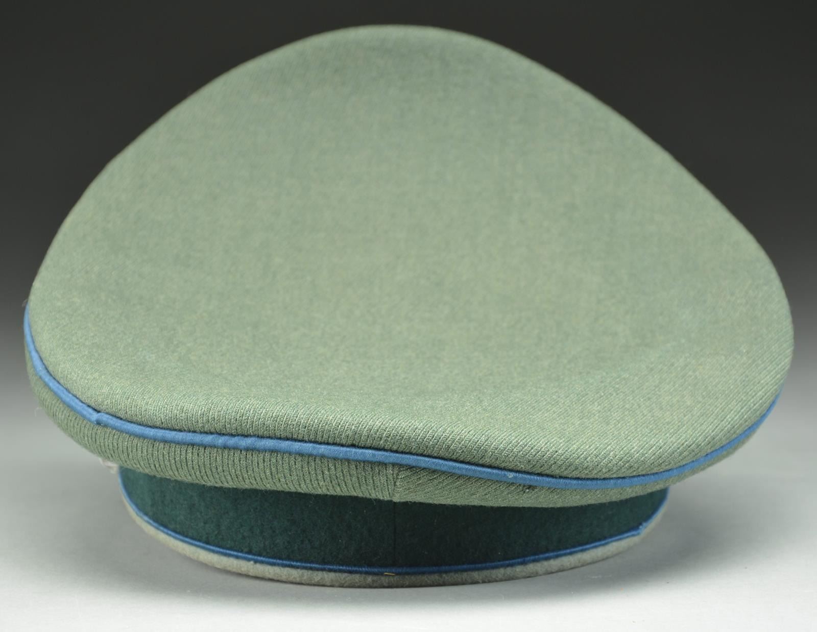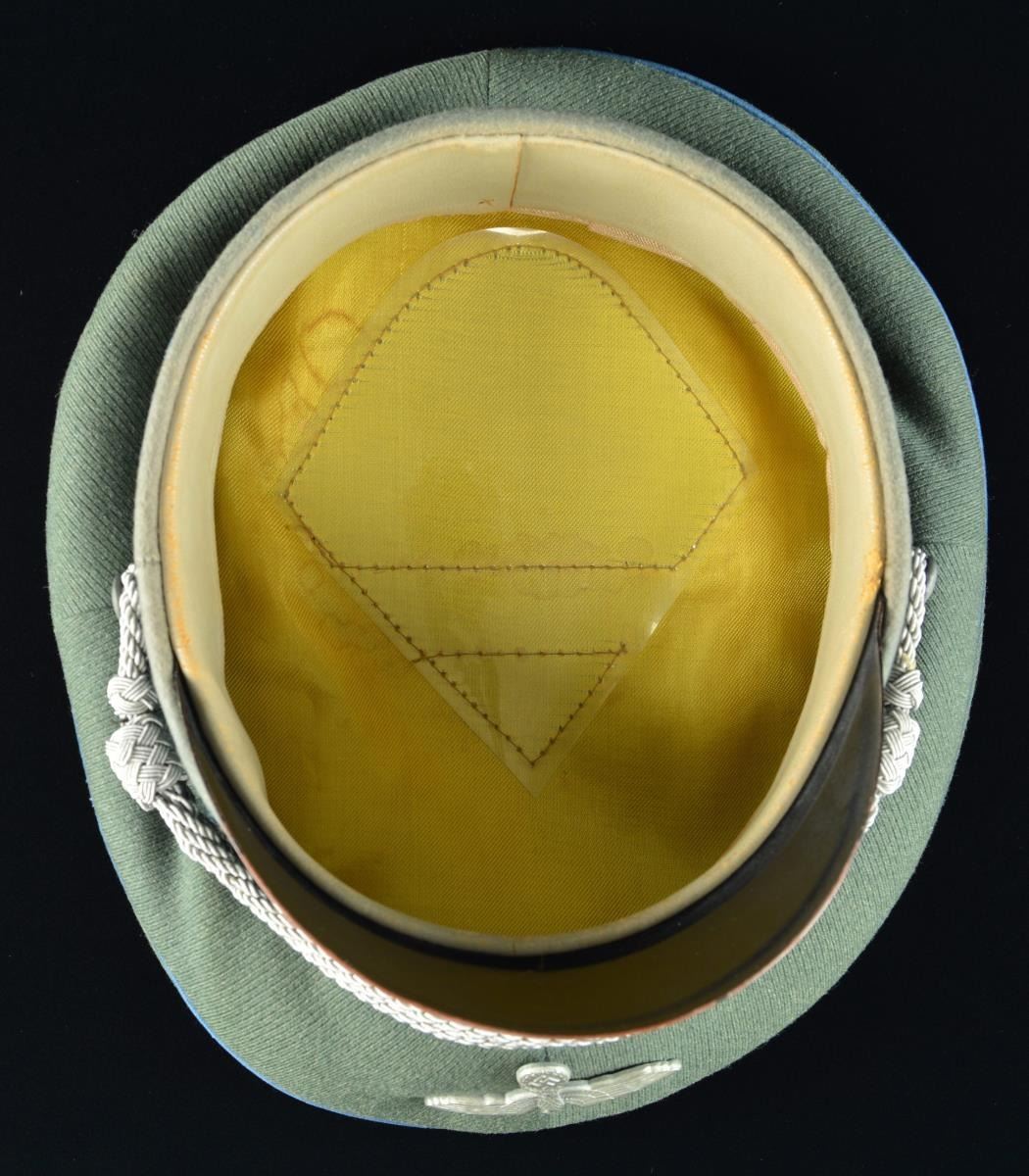 This cap features a sage green crown with a forest green band, all piped in cornflower blue. The crown has a zinc Army eagle on the front, and the band has a zinc oak leaf wreath surrounding a national cockade. Silver bullion chinstrap terminated by pebble finished buttons. The visor has a black exterior and a black interior. The sweatband is very light brown, and the interior lining is a gold rayon. The diamond shaped sweat shield has one rounded end with no label beneath. CONDITION: the cap remains quite nice with only 2 notable moth nips on the band. The sweat band shows wear around the base, and the lining shows a few sweat stains around the edges of the sweat shield. PROVENANCE: From the Lifelong Collection of Glen E. Mattox. (02-18240/BF). $400-700.