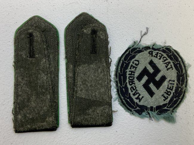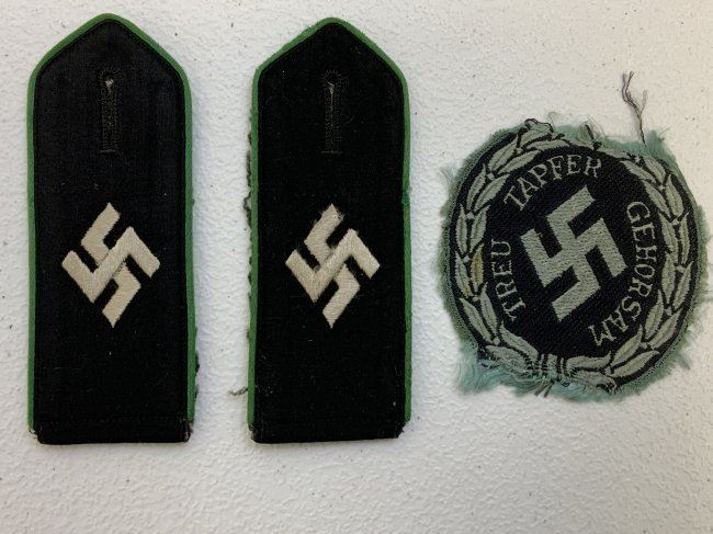 WWII GERMAN AUXILIARY & SECURITY POLICE SCHUMA INSIGNIAS SHOULDER BOARDS AND ARM PATCH . RARE.