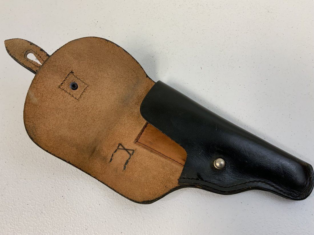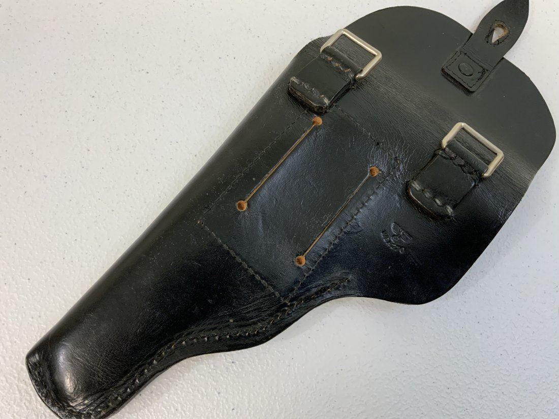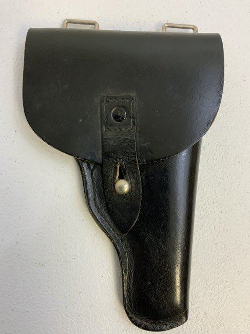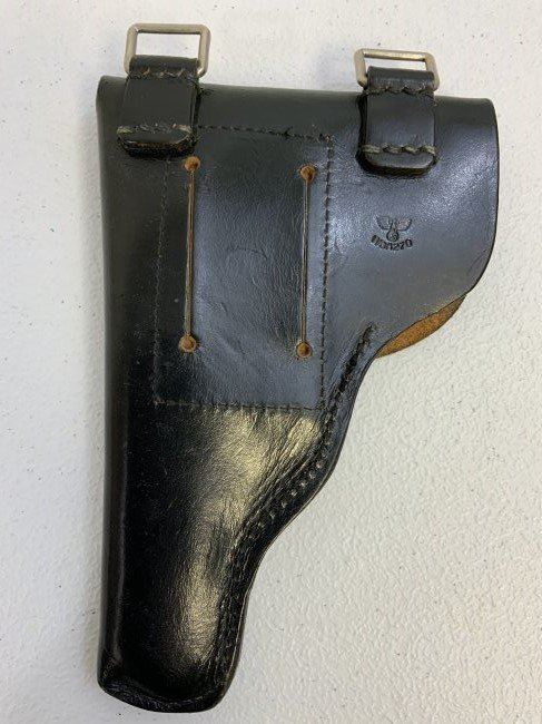WWII GERMAN BLACK LEATHER PISTOL HOLSTER WALTHER PP OR SIMILAR PISTOL SIZE . GREAT MINT CONDITION . STAMPED ON THE BACK WITH MILITARY ACCEPTANCE EAGLE STAMP.