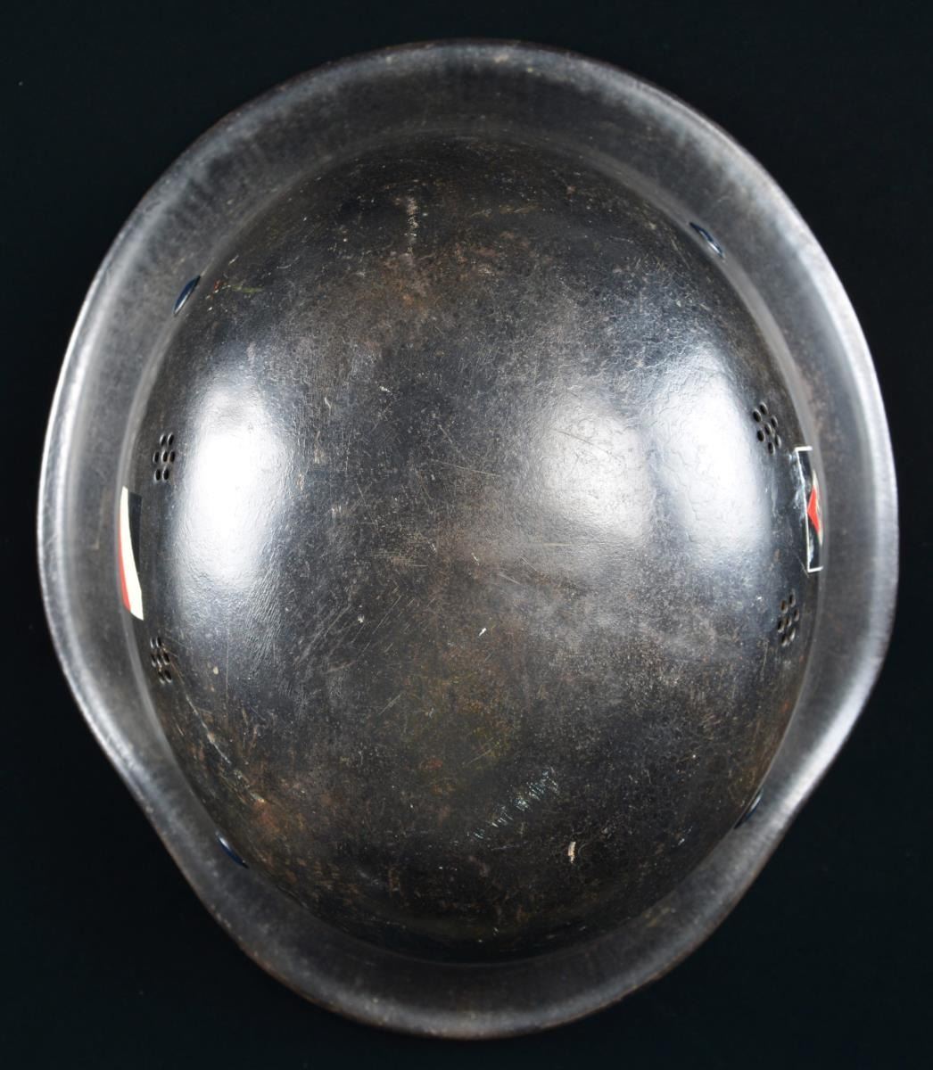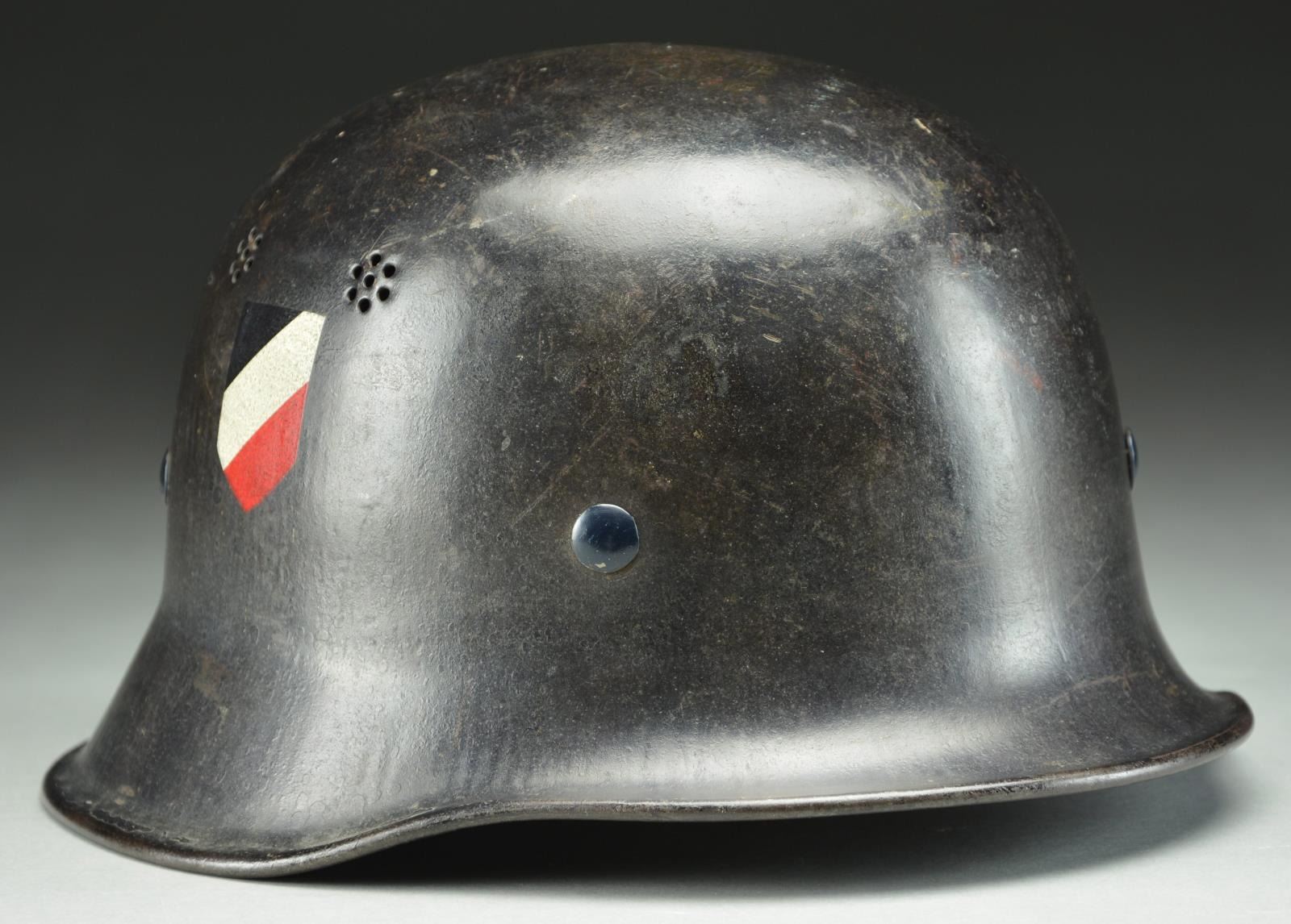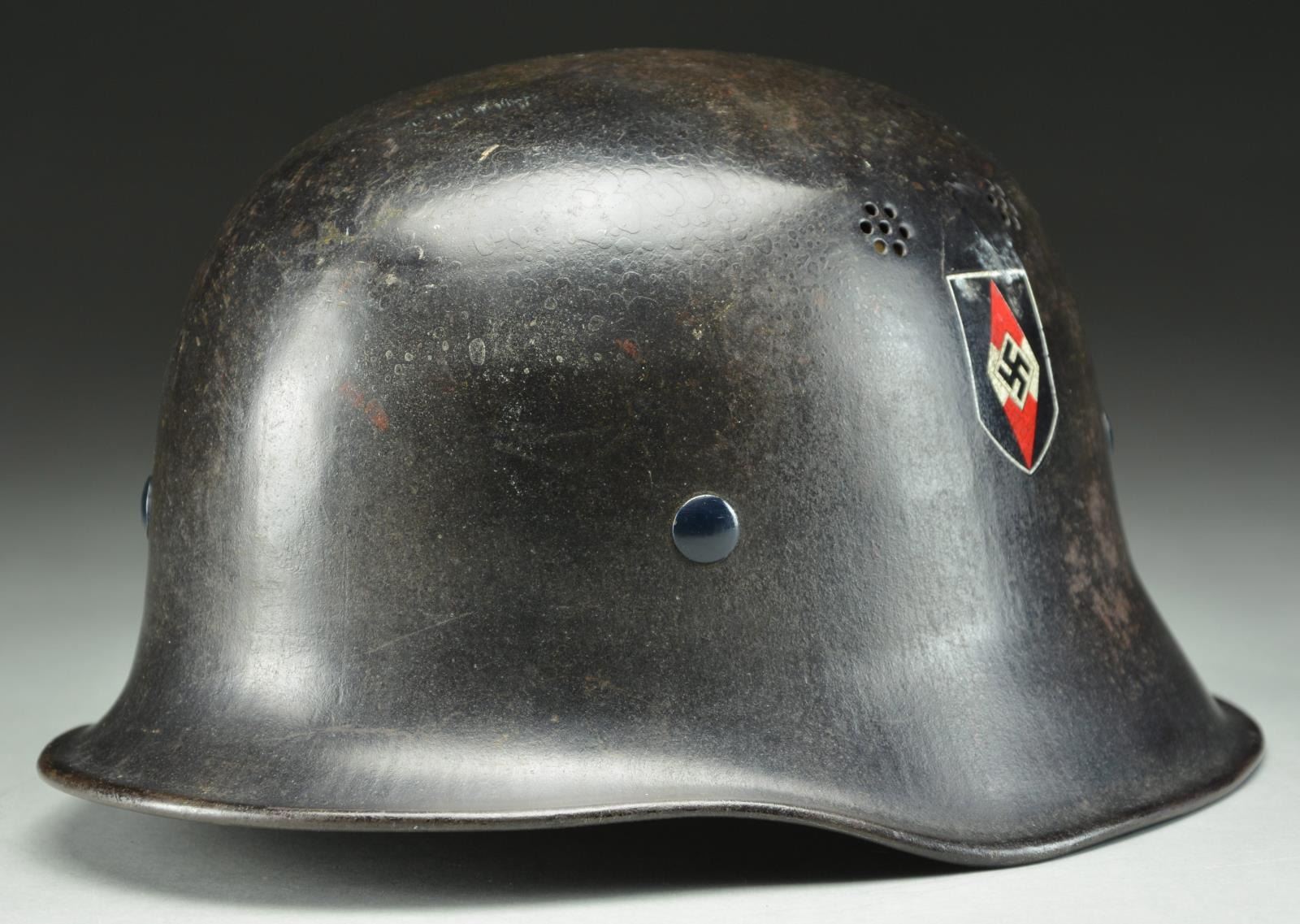 HJ FIRE POLICE. This scarce helmet has a black painted finish with two 7-hole vents on each side. The left side has an HJ diamond decal, and the right side has a national colors decal. There are no stampings on the interior. The helmet has a tan 7-finger lining and a tan pad in the crown. The chinstrap is made of black leather. CONDITION: helmet finish is approx. 95%. HJ decal is nearly complete, as is the national decal. Liner shows light wear, but the chinstrap shows moderate to heavy wear. PROVENANCE: From the Lifelong Collection of Glen E. Mattox. (02-18230/BF). $400-700.