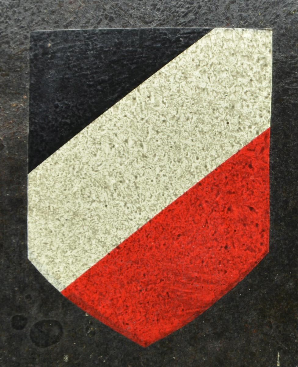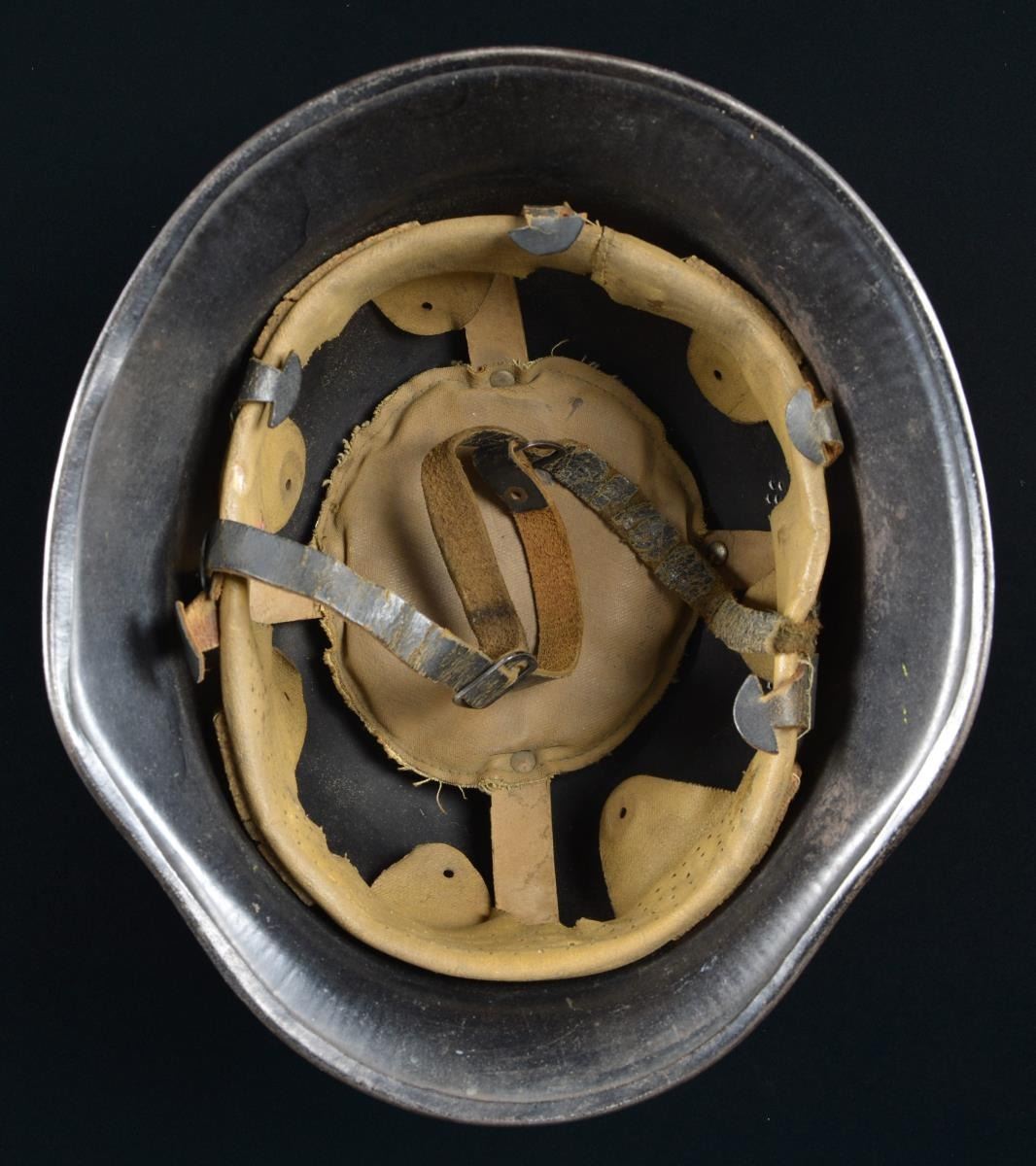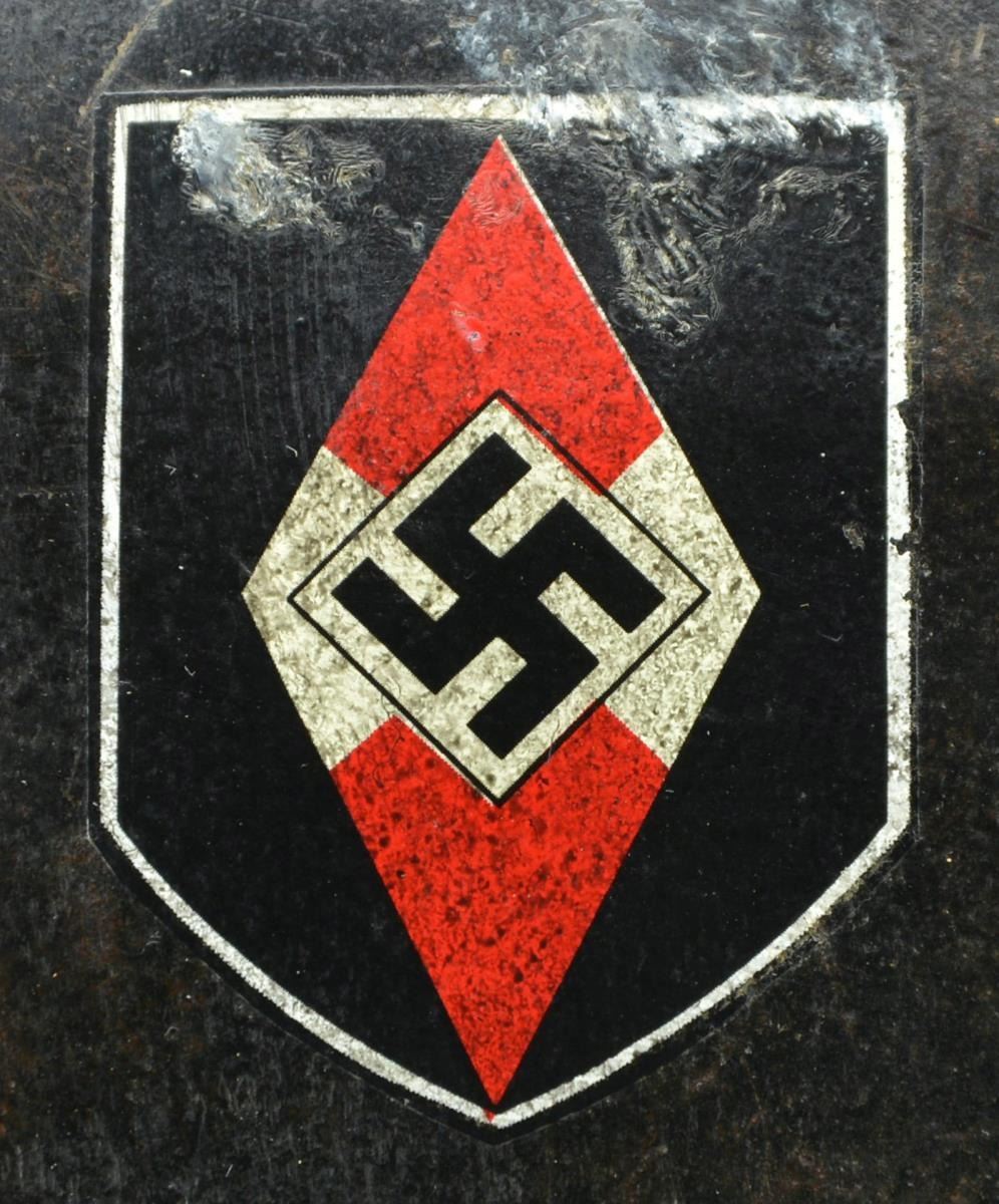 HJ FIRE POLICE. This scarce helmet has a black painted finish with two 7-hole vents on each side. The left side has an HJ diamond decal, and the right side has a national colors decal. There are no stampings on the interior. The helmet has a tan 7-finger lining and a tan pad in the crown. The chinstrap is made of black leather. CONDITION: helmet finish is approx. 95%. HJ decal is nearly complete, as is the national decal. Liner shows light wear, but the chinstrap shows moderate to heavy wear. PROVENANCE: From the Lifelong Collection of Glen E. Mattox. (02-18230/BF). $400-700.