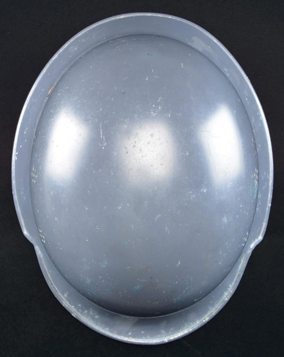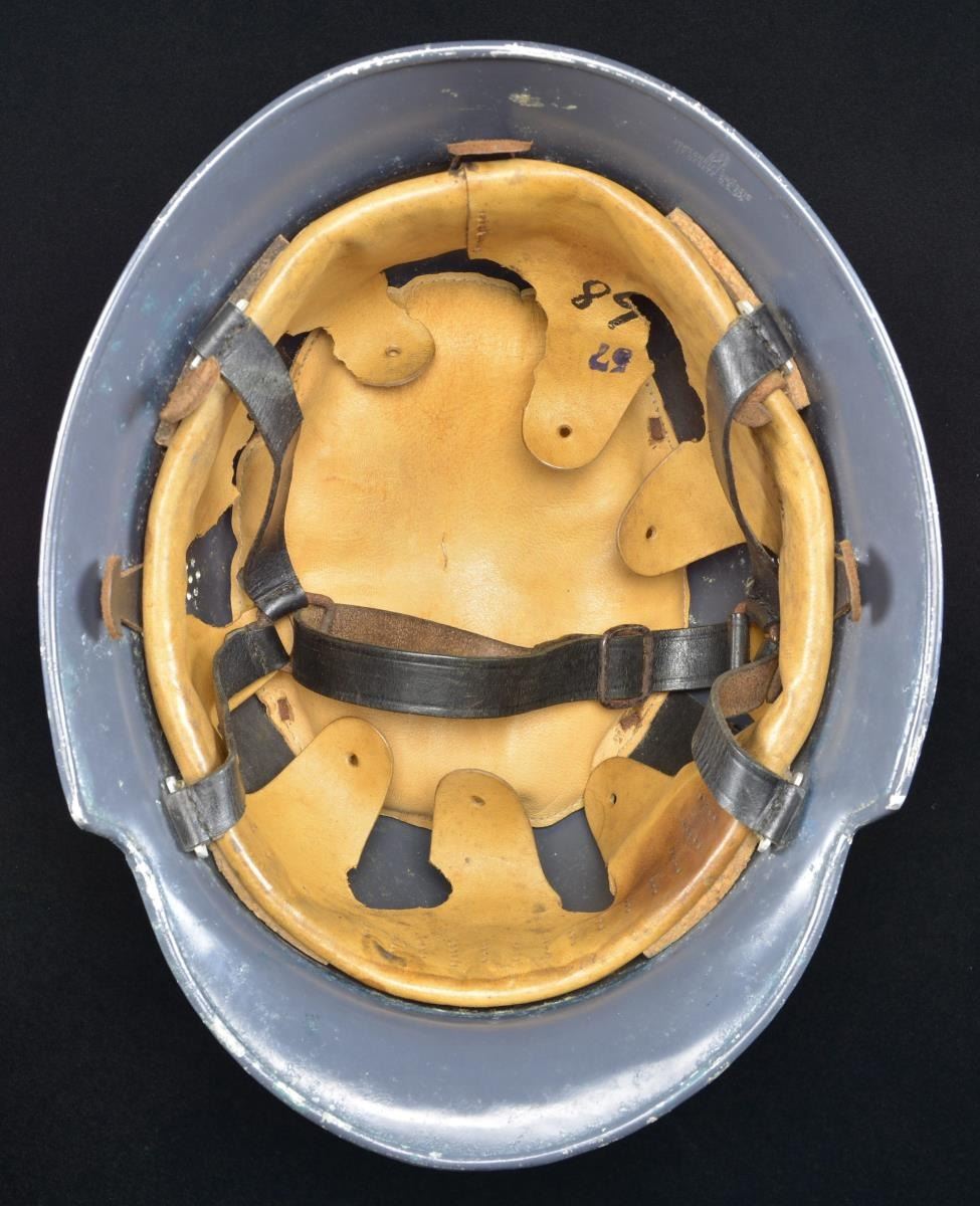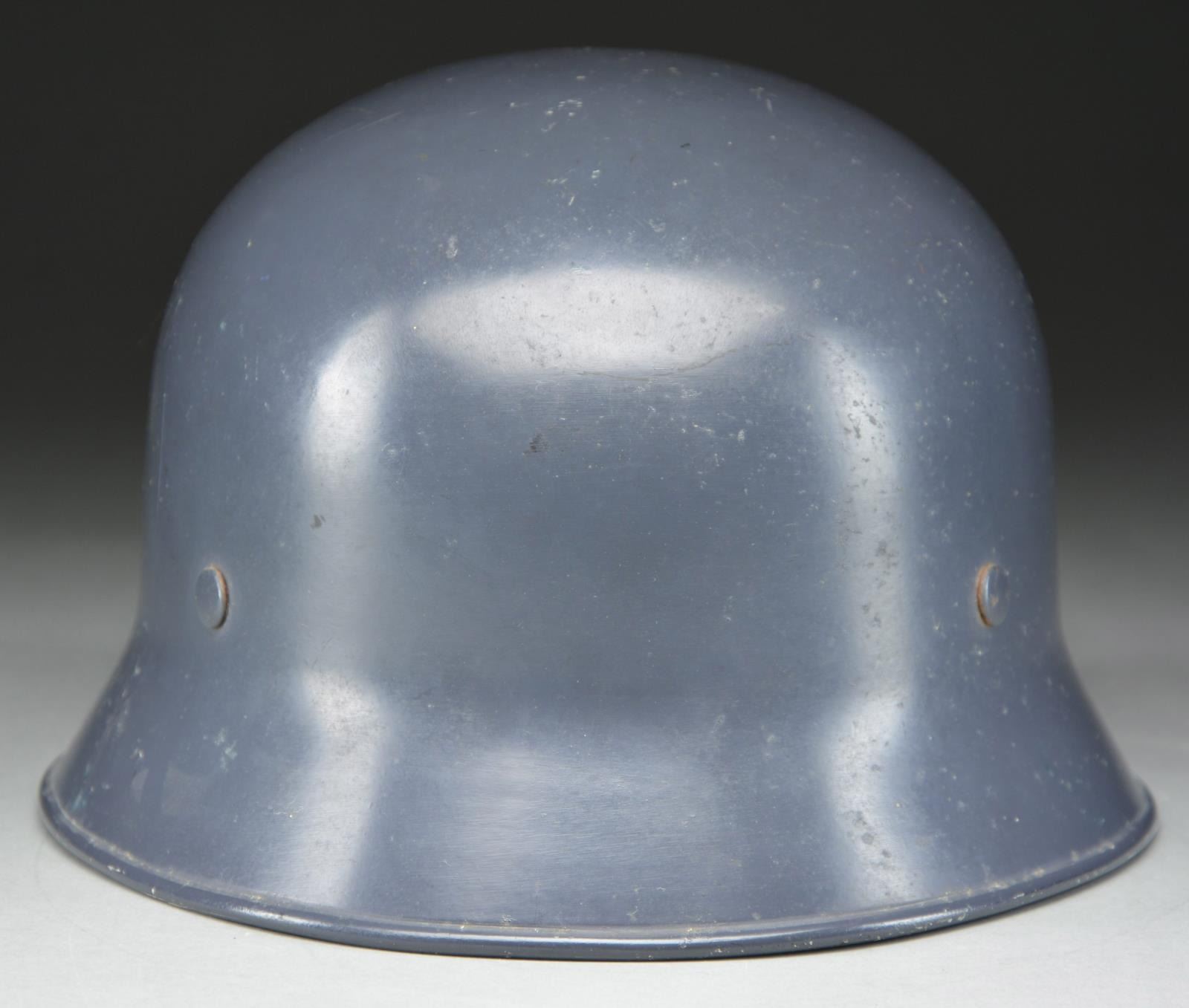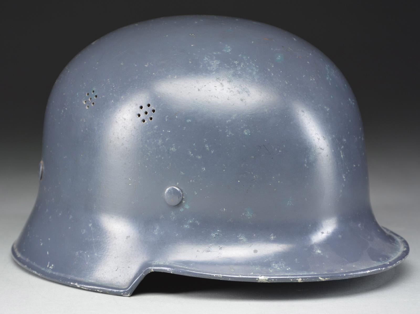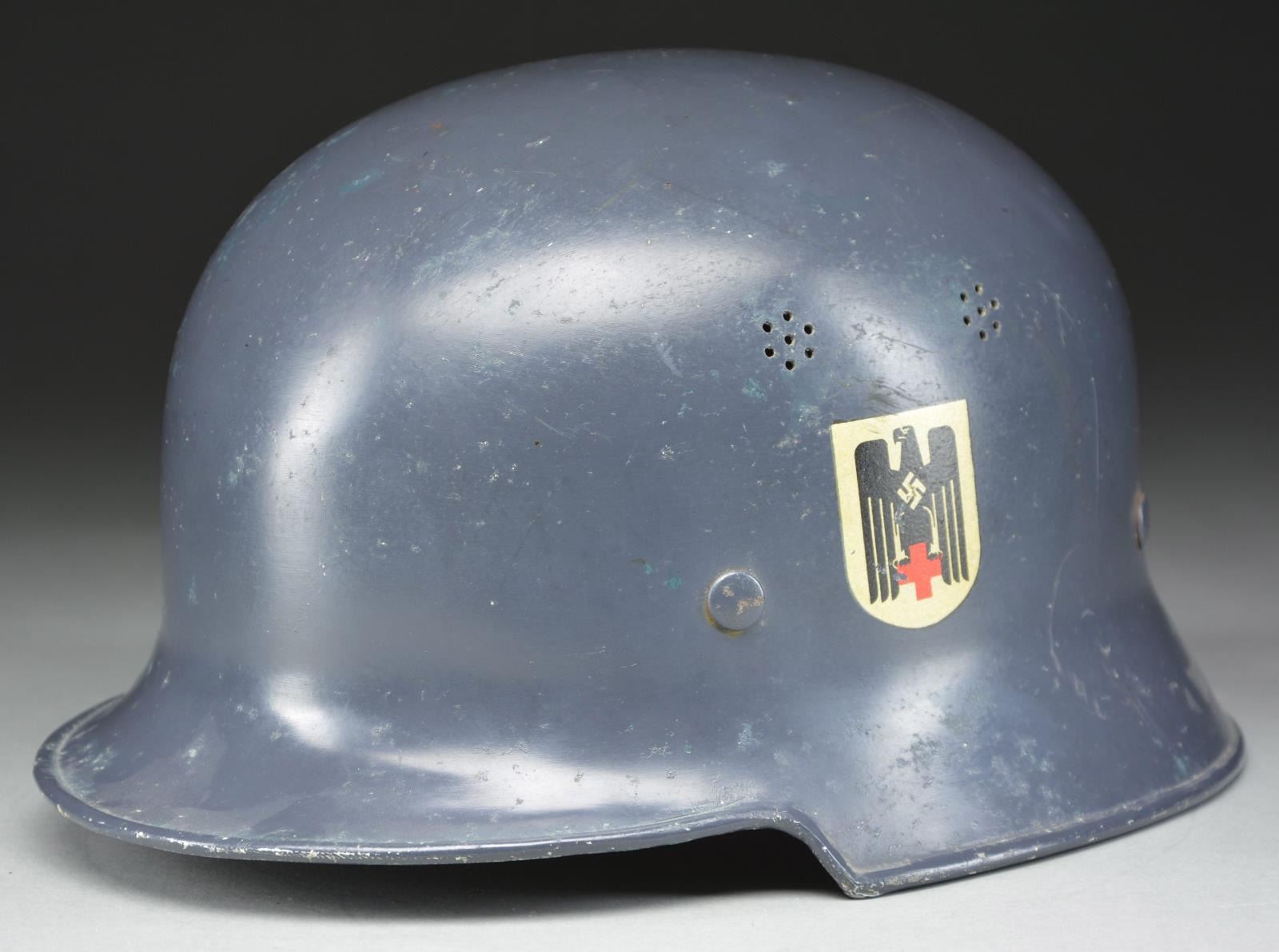 RED CROSS. This scarce helmet has a blue-gray painted finish with two 7-hole vents on each side. The left side has a black, white & red German Red Cross eagle, and the right side is blank. The inside rear is stamped “B (logo) BF VORSCHRIFTSMASSIG LT. GESETZ 3.5.34”. The 9-tongue liner is made of tan leather and has the name “Rirhl Ludwig” inscribed in ink. There is a tan leather pad in the crown, and the black leather chinstrap is a 4-point attachment type. CONDITION: helmet retains over 95% of its original finish. The decal is over 95% complete. Liner appears to have some rodent damage. Chinstrap shows light wear. PROVENANCE: From the Lifelong Collection of Glen E. Mattox. (02-18302/BF). $400-600.