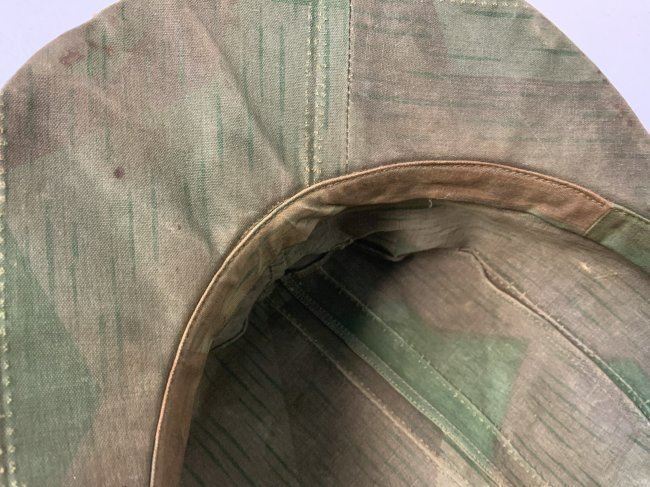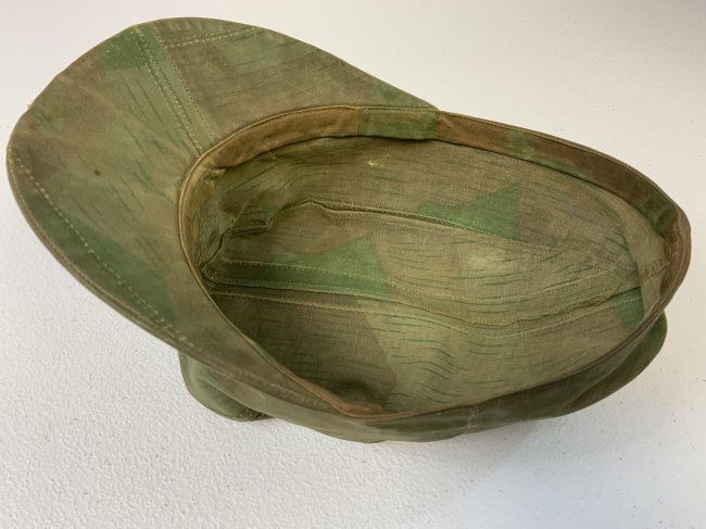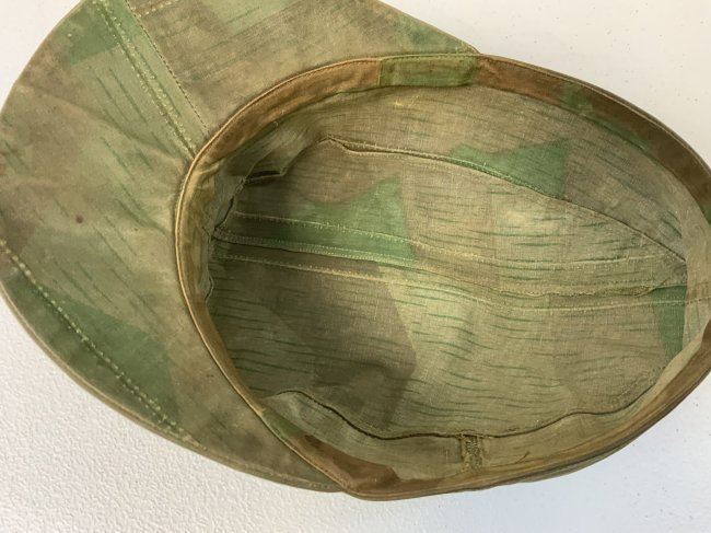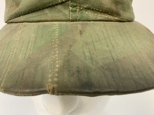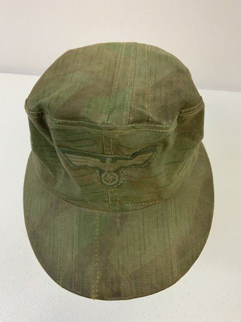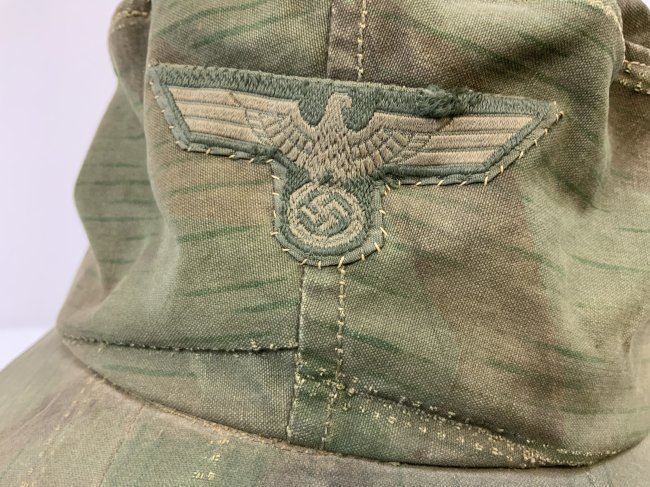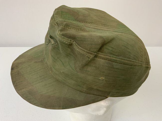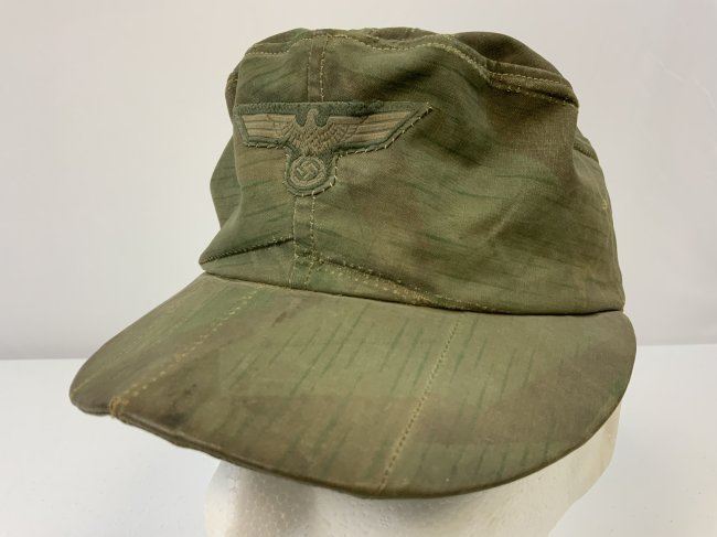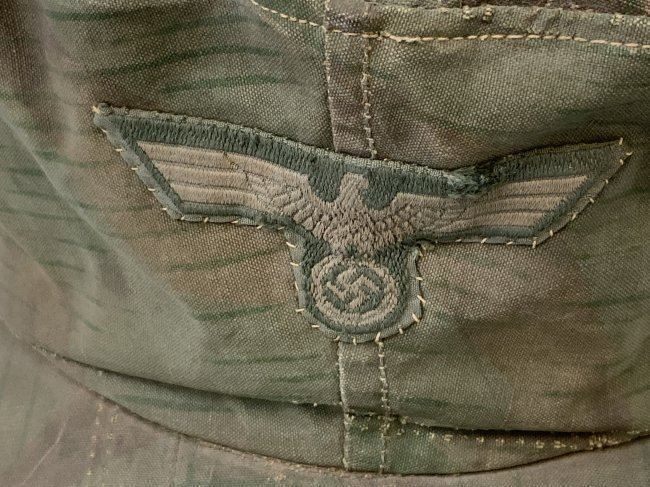 WWII GERMAN FIELD CAP MADE FROM SPLINTER CAMOUFLAGE ZELTBAHN MATERIAL . GREAT RARE EXAMPLE. WELL WORN AND USED CONDITION . ARMY EAGLE SEWN TO THE FRONT.