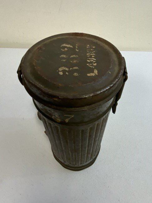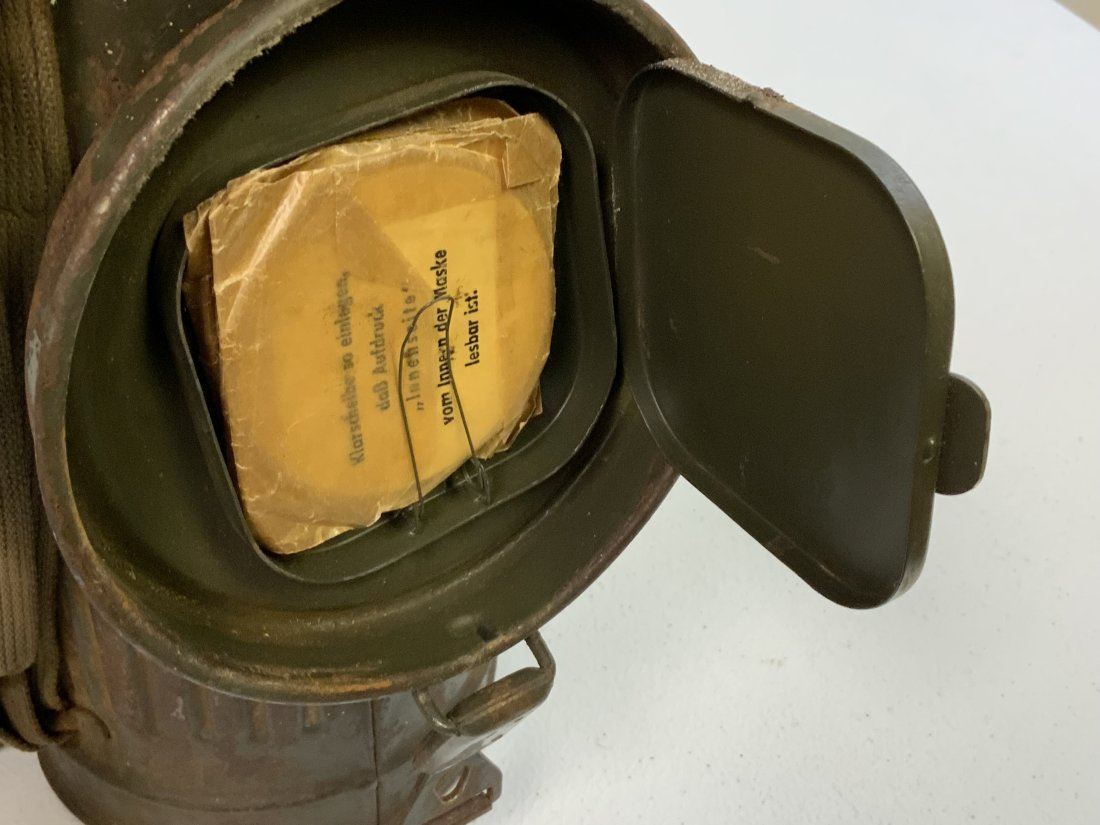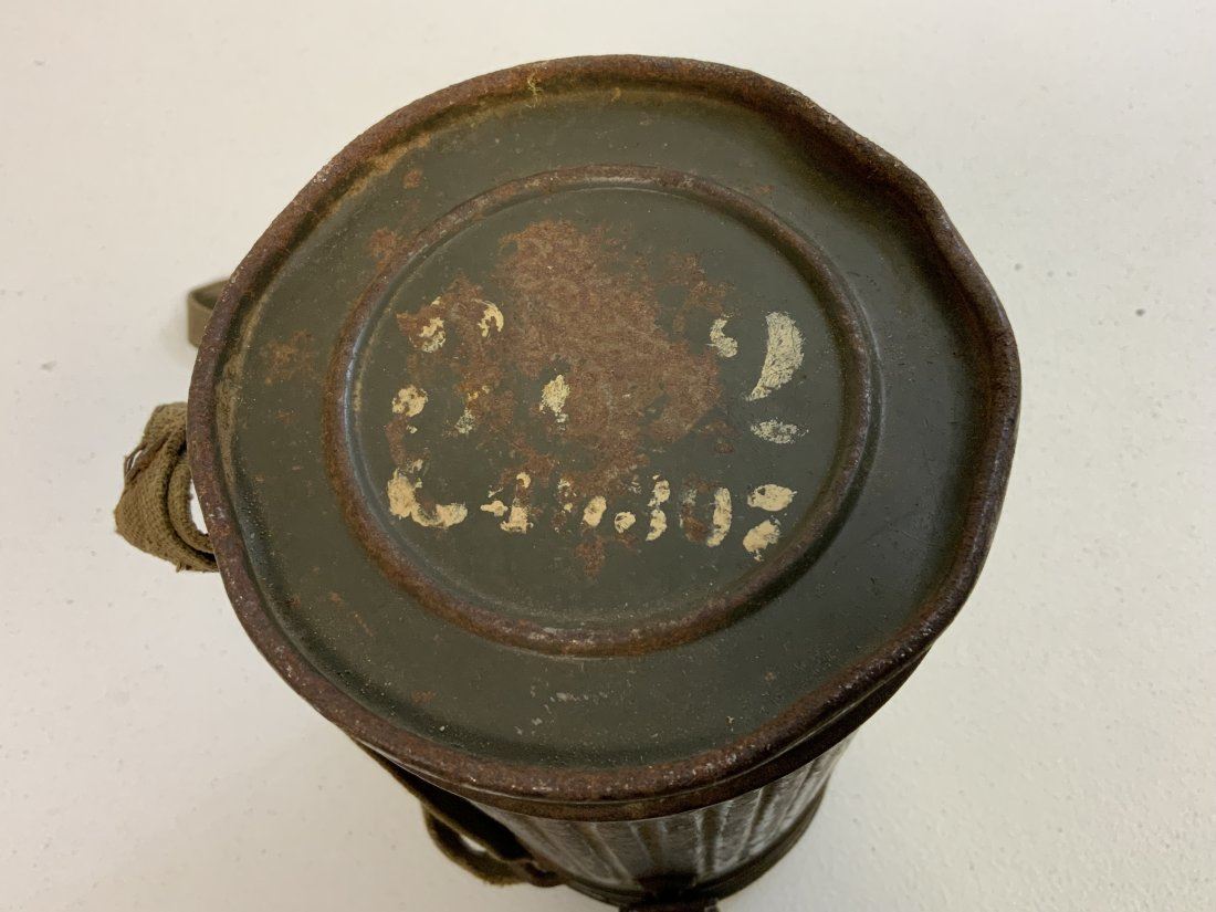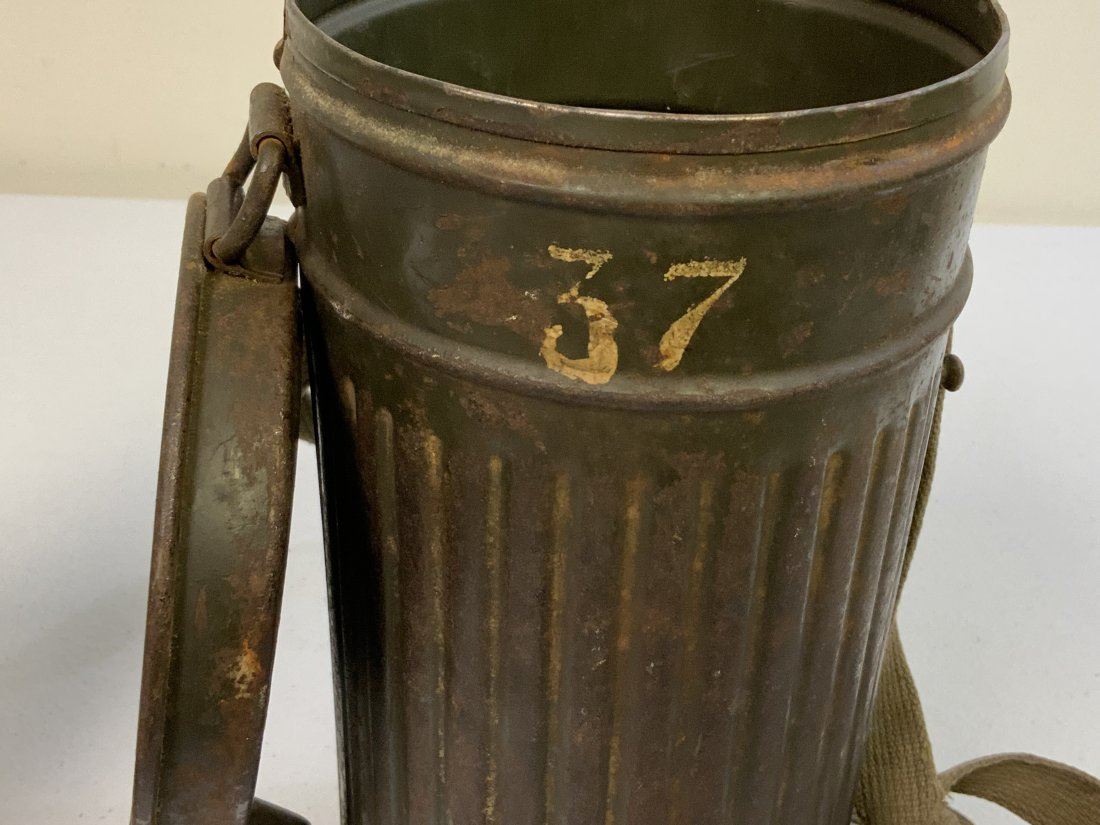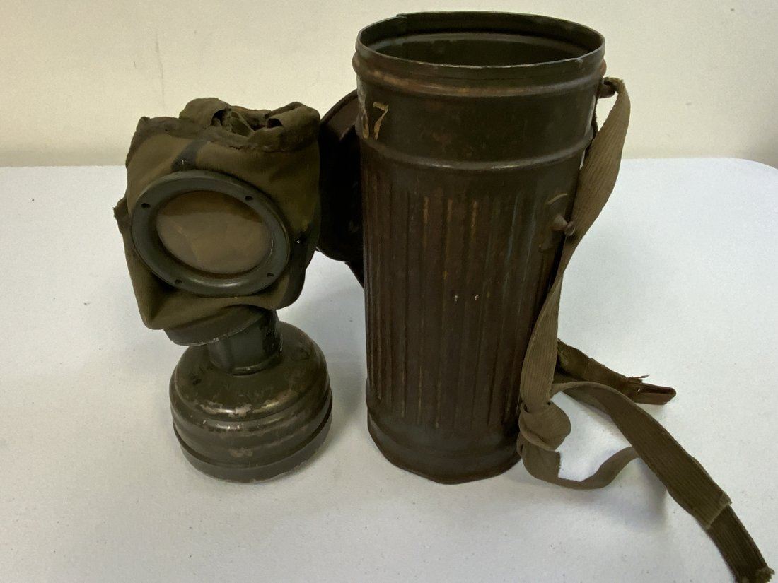 WWII GERMAN GAS MASK AND FILTER WITH CANISTER . GREAT EXAMPLE WITH NUMBERS MATCHING 37 ON THE MASK AND CANISTER. THE MASK IS VERY STIFF . COMPLETE WITH FILTER DATED 1941 . CANISTER 1940 DATED WITH EXTRA LENSES AND CANVAS CARRY STRAPS . SOME NUMBERS IN WHITE PAINT ON TOP AND BOTTOM. ORIGINAL PAINT.