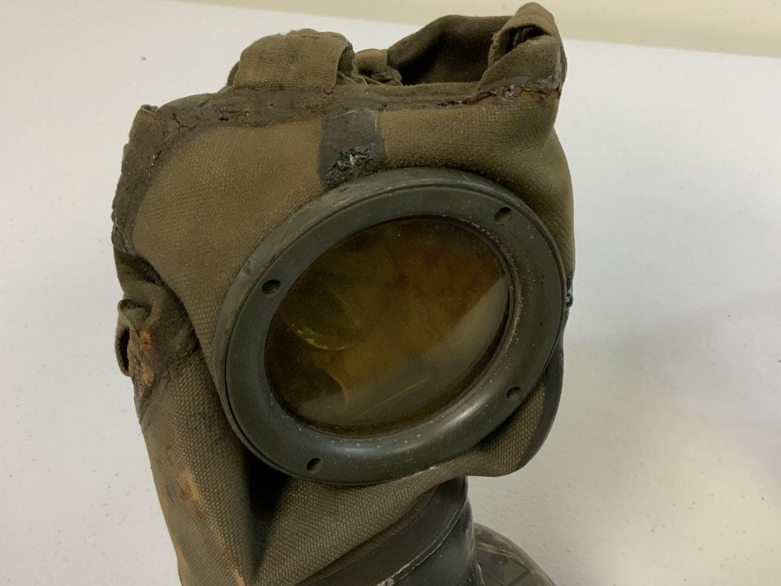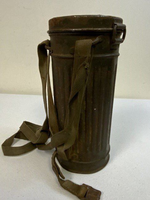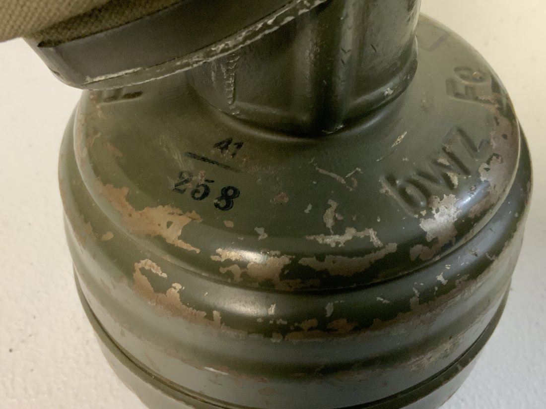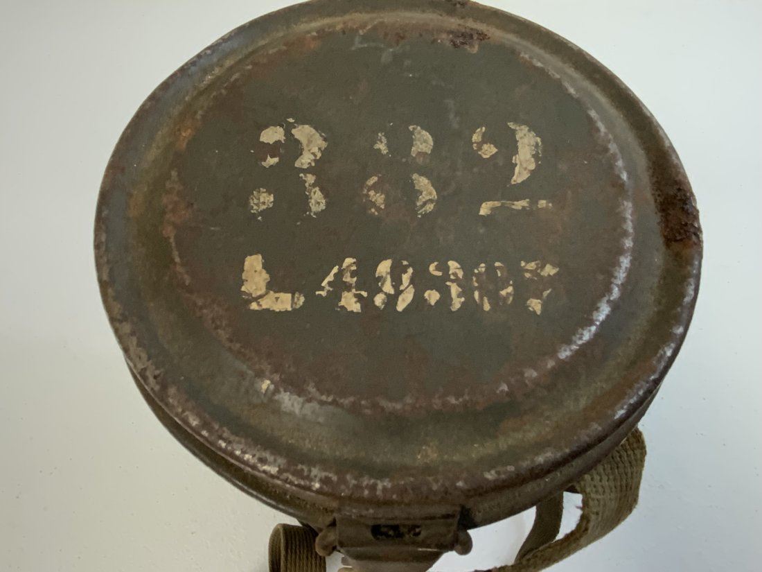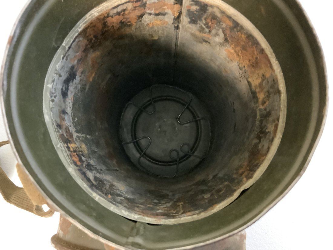 WWII GERMAN GAS MASK AND FILTER WITH CANISTER . GREAT EXAMPLE WITH NUMBERS MATCHING 37 ON THE MASK AND CANISTER. THE MASK IS VERY STIFF . COMPLETE WITH FILTER DATED 1941 . CANISTER 1940 DATED WITH EXTRA LENSES AND CANVAS CARRY STRAPS . SOME NUMBERS IN WHITE PAINT ON TOP AND BOTTOM. ORIGINAL PAINT.