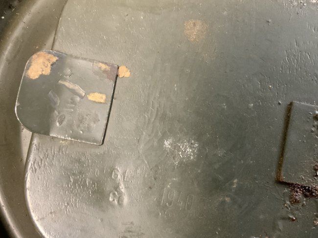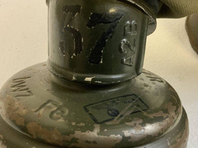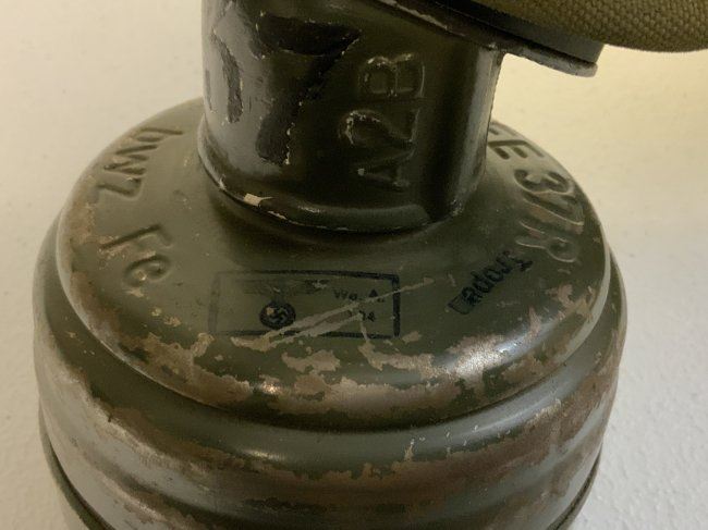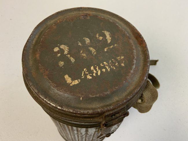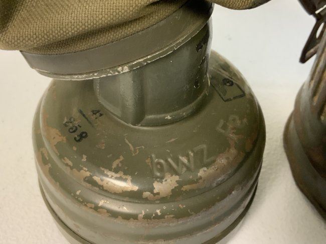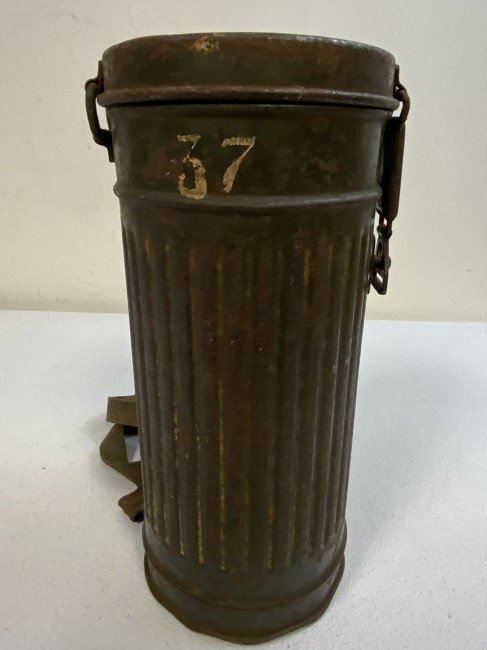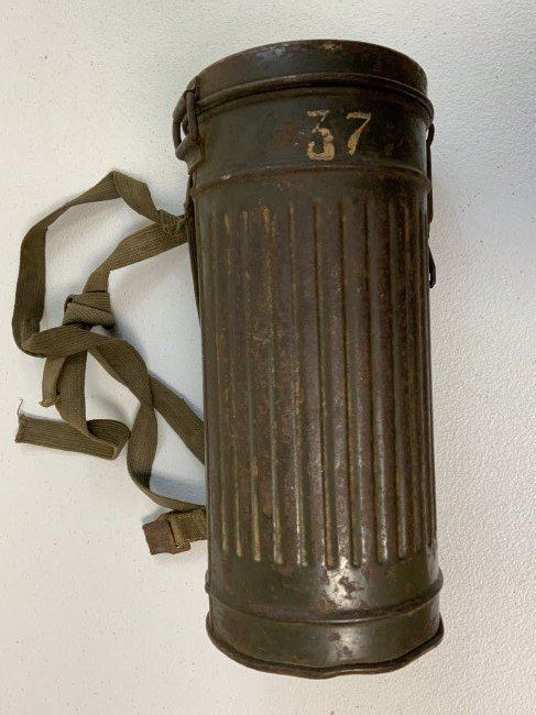 WWII GERMAN GAS MASK AND FILTER WITH CANISTER . GREAT EXAMPLE WITH NUMBERS MATCHING 37 ON THE MASK AND CANISTER. THE MASK IS VERY STIFF . COMPLETE WITH FILTER DATED 1941 . CANISTER 1940 DATED WITH EXTRA LENSES AND CANVAS CARRY STRAPS . SOME NUMBERS IN WHITE PAINT ON TOP AND BOTTOM. ORIGINAL PAINT.