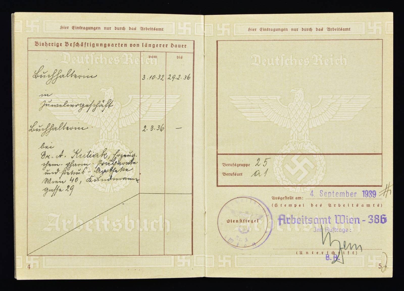 This interesting group consists of 7 standard red, white & black HJ armbands with the center diamond & party symbol. / 4 Unissued HJ scarf knots, 2 of which have RZM tags attached. / 1 Pair of HJ red piped black shoulder straps with “AH/S” on the top. / 1 RAD aluminum belt buckle in poor condition. / 1 Deutsches Reich Arbeitsbuch. / 2 Gold finished political leader’s cap eagles, one with no pin. CONDITION: all items show light wear, unless noted otherwise. One armband is badly stained & shows paint residue. (02-19775/BF). $350-500.