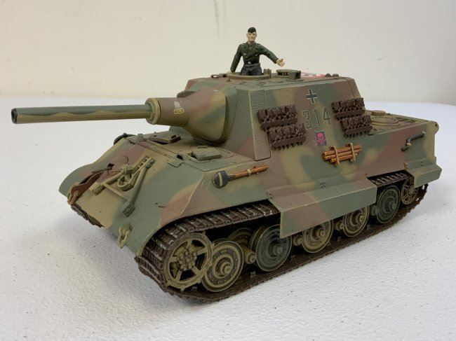 WWII GERMAN JAGTIGER TANK DESTROYER IN LATE WAR CAMMO PAINT METAL 1:32 MODEL. HIGHLY DETAILED . GREAT DISPLAY PIECE . 9" LONG BODY , 10" TOTAL LENGTH WITH BARREL .