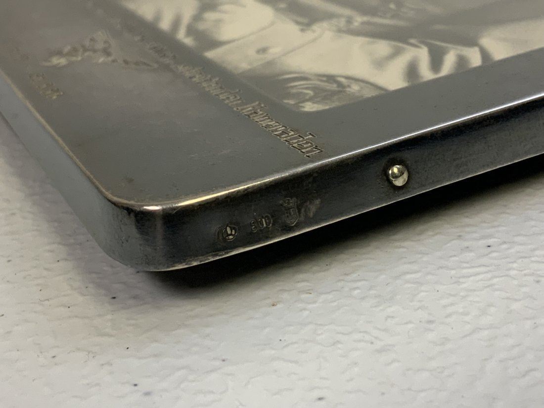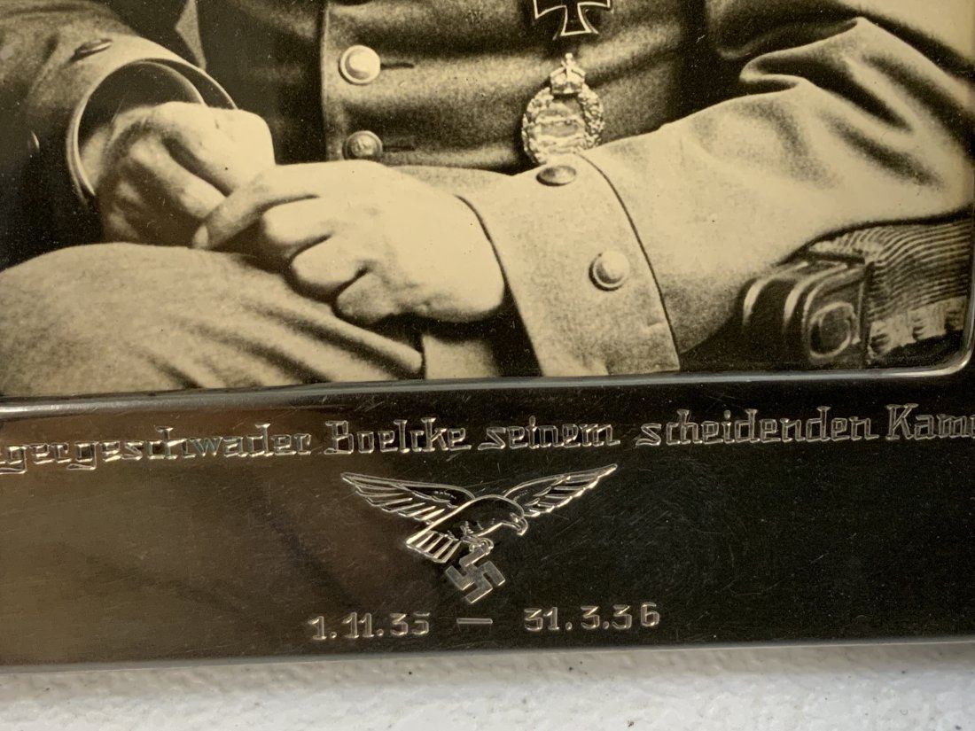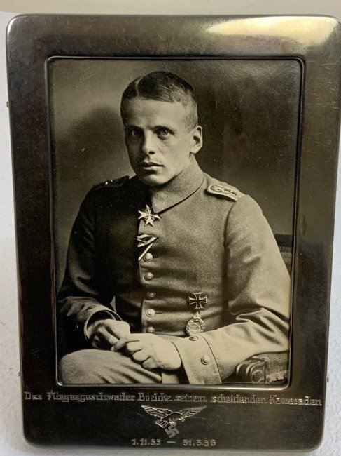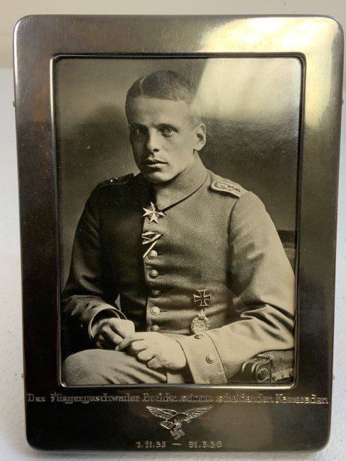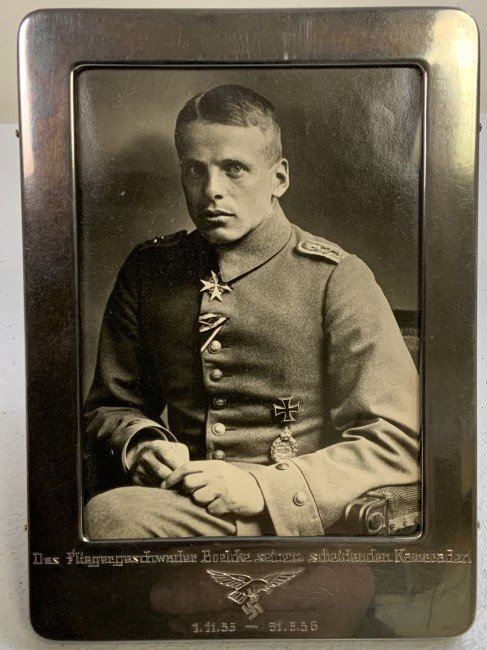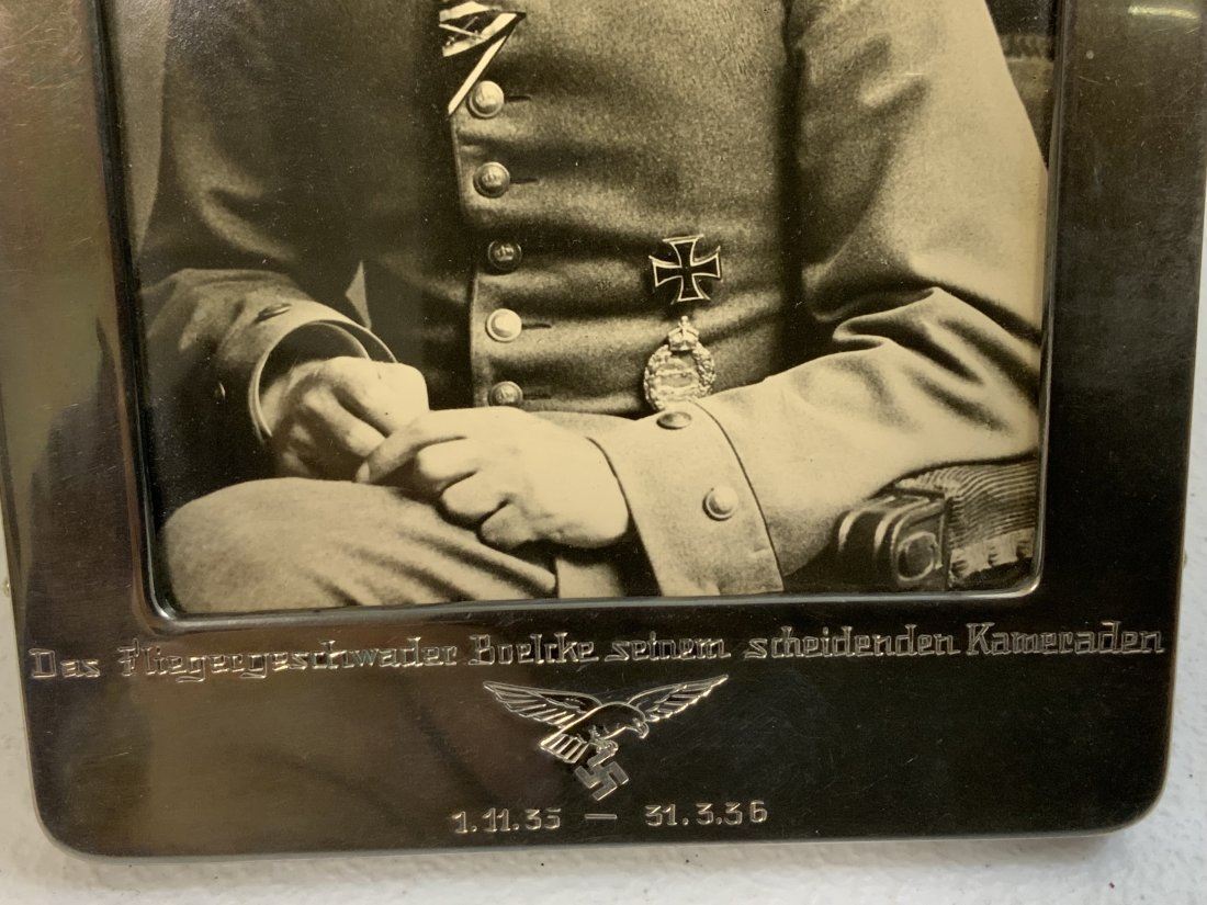 WWII GERMAN LUFTWAFFE 800 SILVER FRAME WITH DEDICATION PICTURE OF RECIPIENT IN WWI UNIFORM . VERY NICE PICTURE OF A YOUNG PERSON IN WWI PILOT OFFICER UNIFORM WITH AWARDS. FRAMED IN 800 SILVER FRAME WITH DATES 1935-36 . HALLMARKED . 7 x 5 .