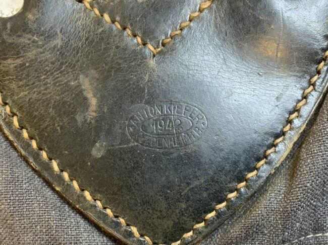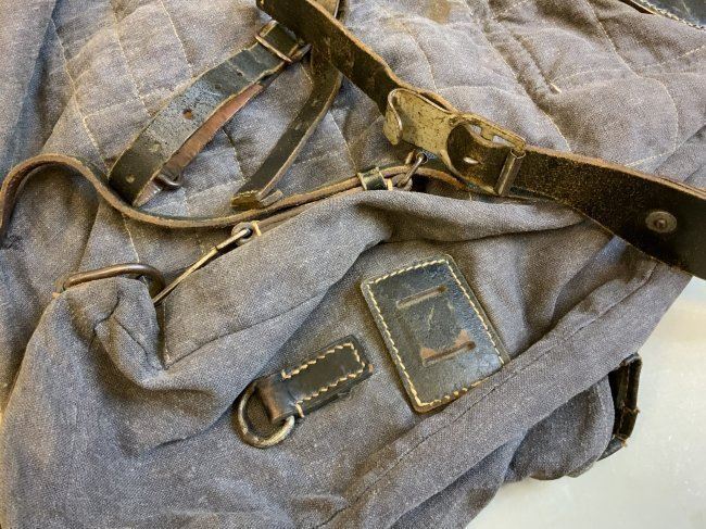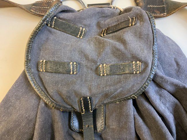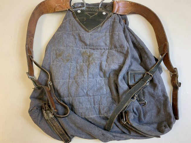 German WWII Luftwaffe Blue Rucksack With Shoulder Straps . Great condition with all leather straps present and still can be used. 1942 dated and maker stamped.