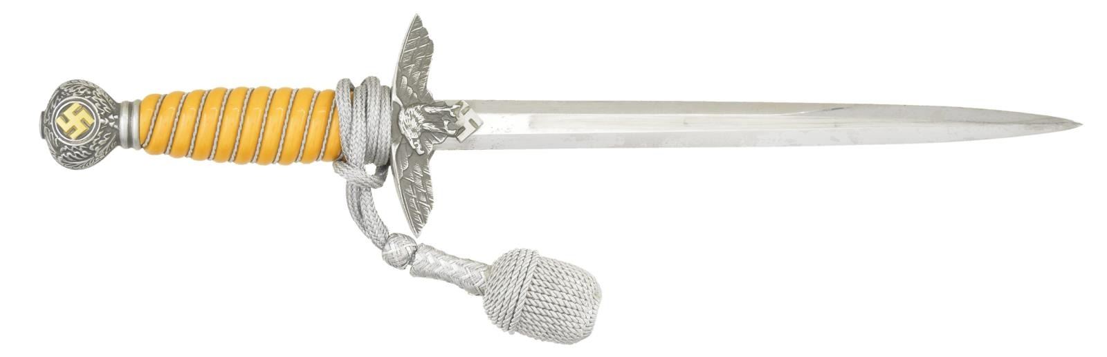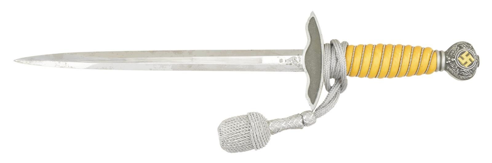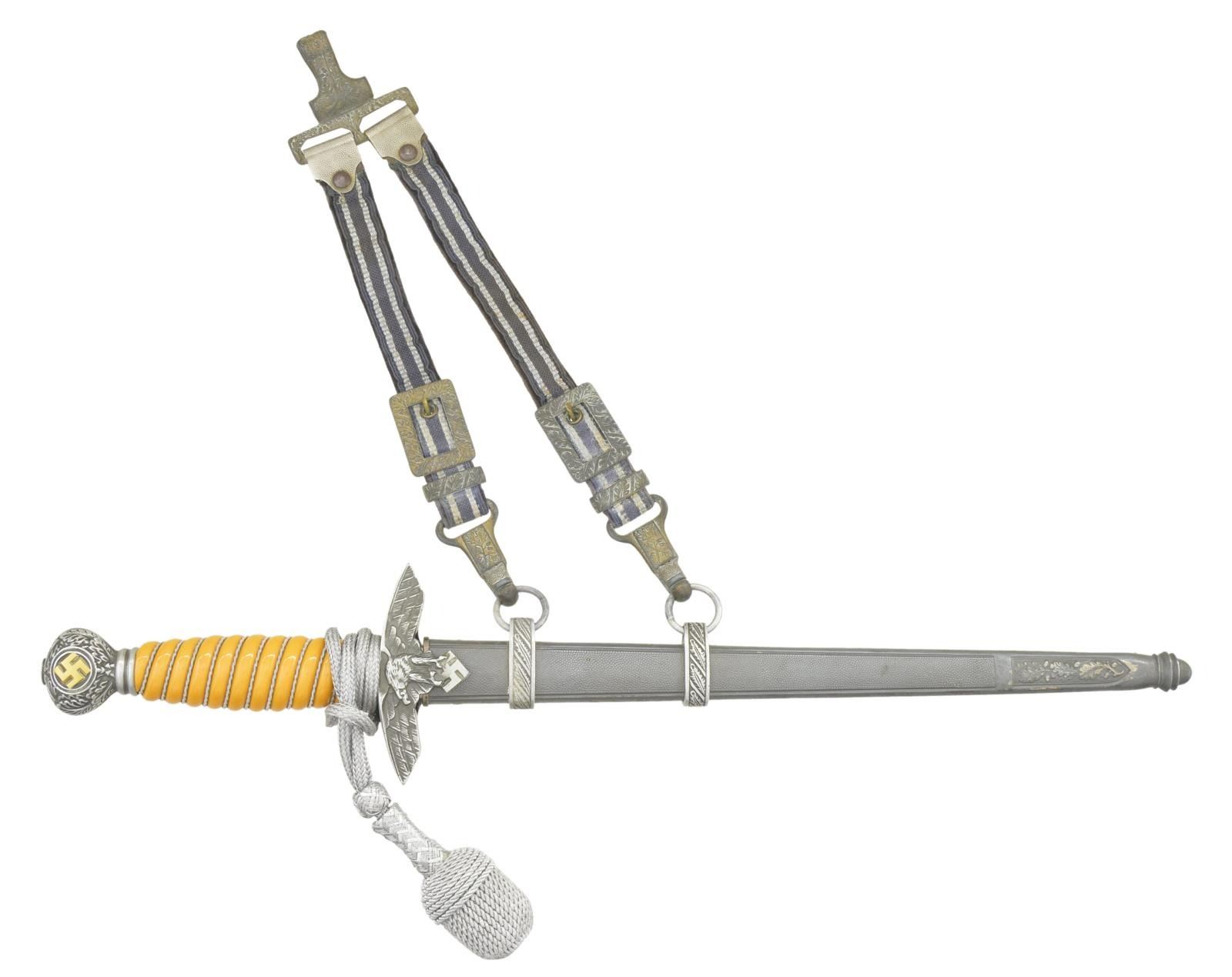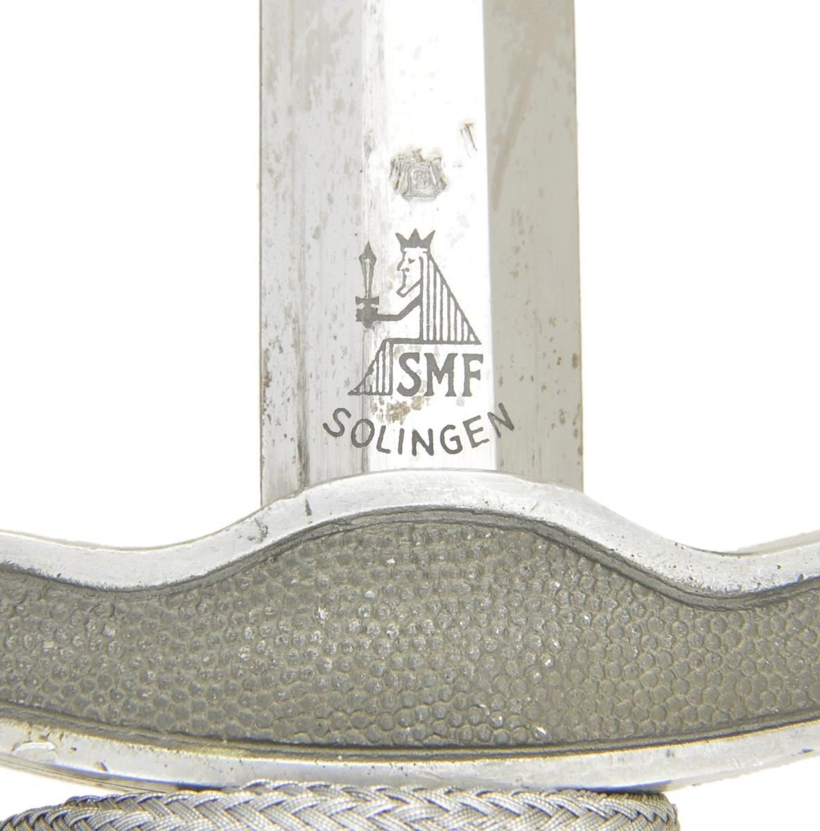 Overall length: 17". Plain blade stamped near the hilt “(king) SMF SOLINGEN”. There is a small waffenamt “5” above the maker’s mark. Aluminum eagle cross guard with oak leaf & gold party symbol decorated pommel. Aluminum wire-wrapped dark yellow grip with silver bullion knot attached. Plated scabbard with aluminum suspension bands. Correct deluxe hanger attached. CONDITION: blade has substantial original factory polish. Hilt shows light overall wear. Knot also shows light wear. Scabbard has a dark patina with a few areas of oxidation between the bands. Hangers show light wear. PROVENANCE: From the Lifelong Collection of Glen E. Mattox. (02-18297/BF). $400-700.