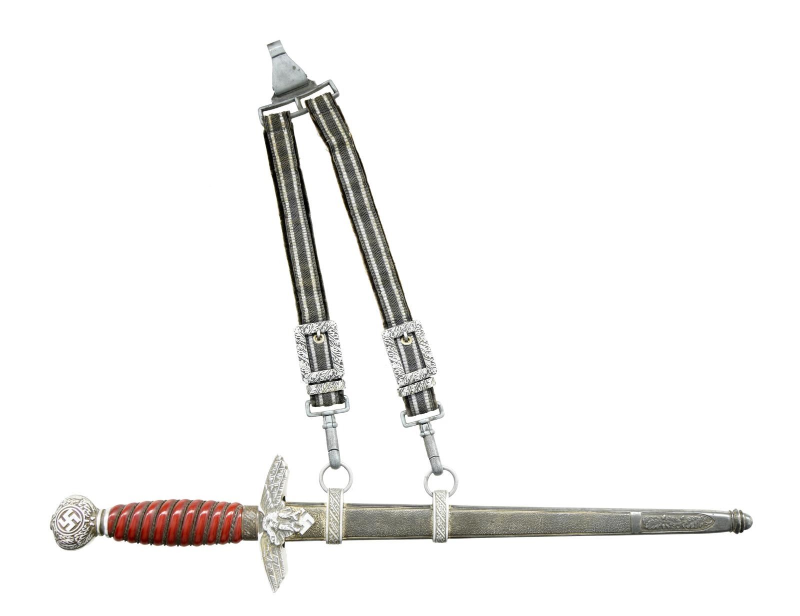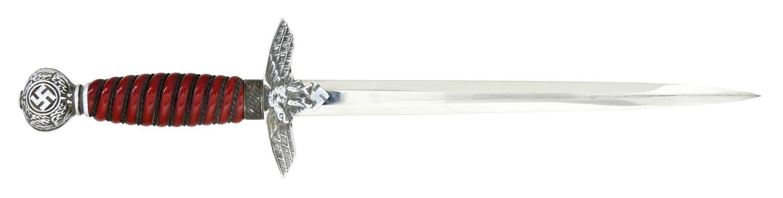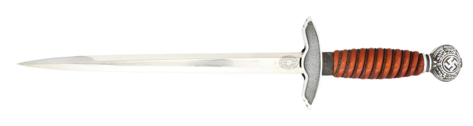 Overall length: 16 7/8". Plain blade stamped near the hilt “PAUL WEYERSBERG & CO. (logo) SOLINGEN”. There is a small waffenamt “5” above the maker’s mark. Aluminum eagle cross guard with oak leaf & party symbol decorated pommel. Wire-wrapped very dark amber-colored grip. Plated scabbard with aluminum suspension bands. Correct hanger attached. CONDITION: blade has original factory polish with minor scabbard wear. Hilt shows light overall wear. Scabbard shows light wear and is quite tarnished. Hanger shows light wear with minor rubbing to the edges. PROVENANCE: From the Lifelong Collection of Glen E. Mattox. (02-18215/BF). $500-800.