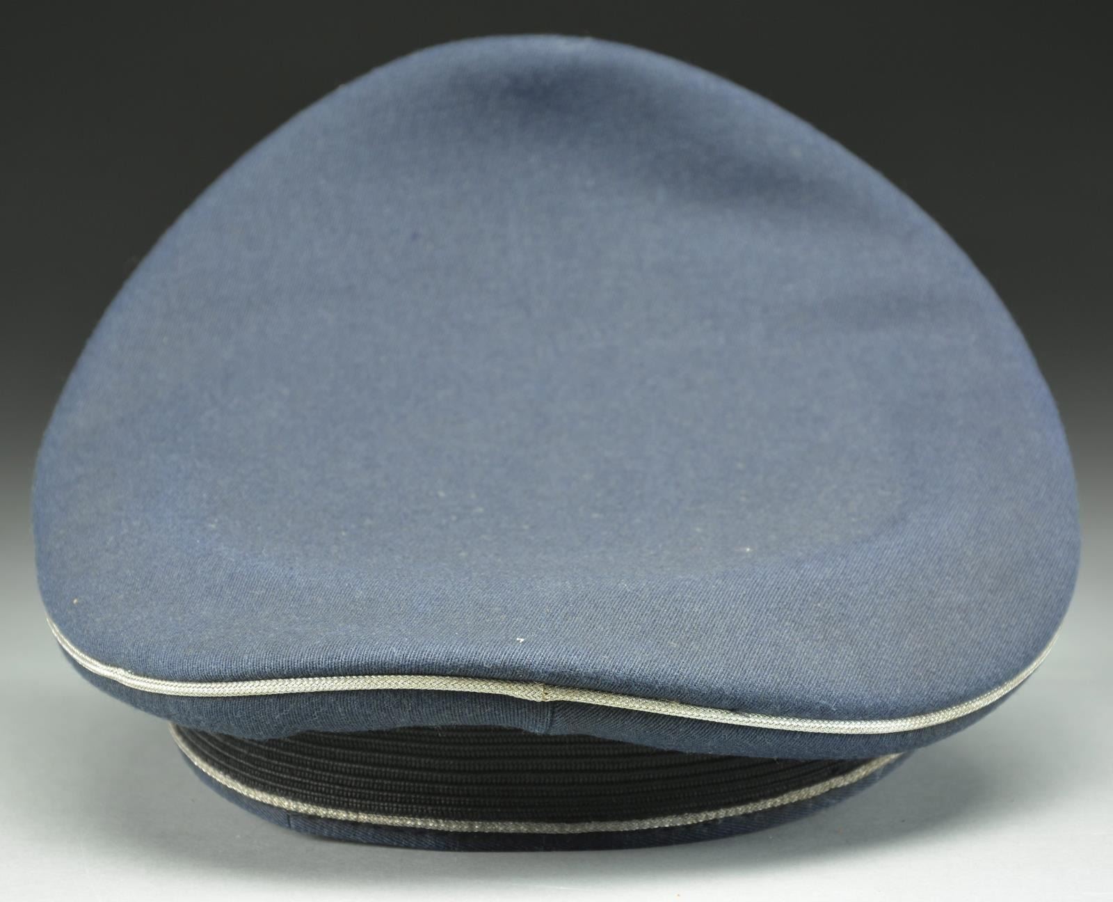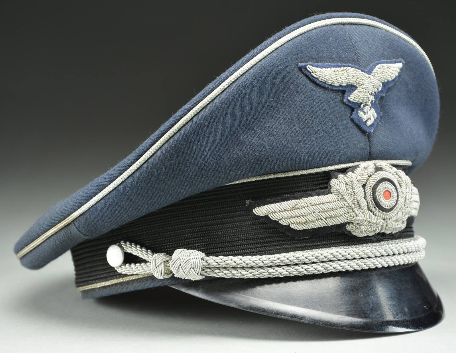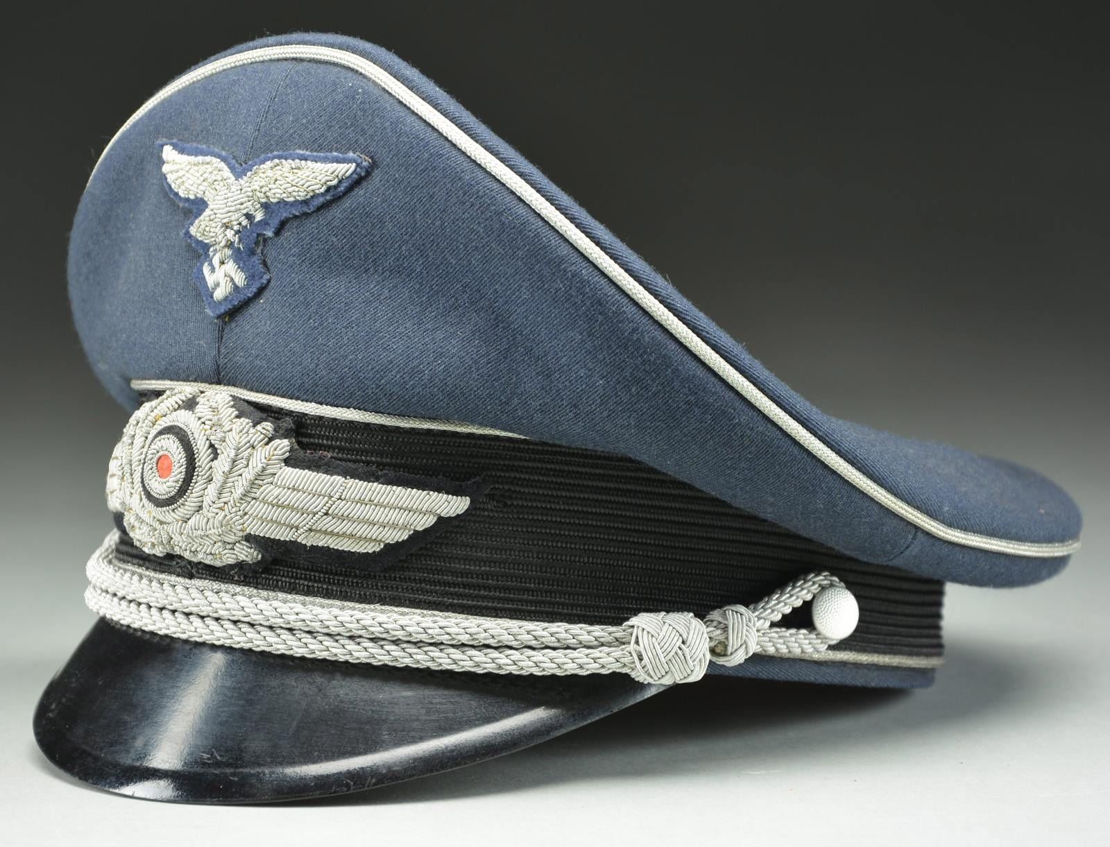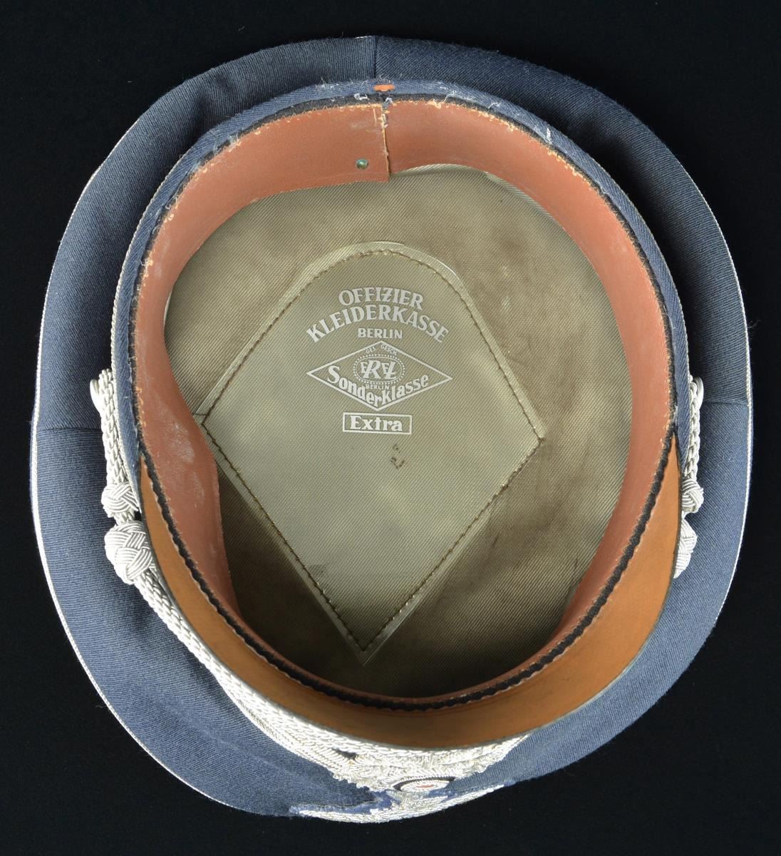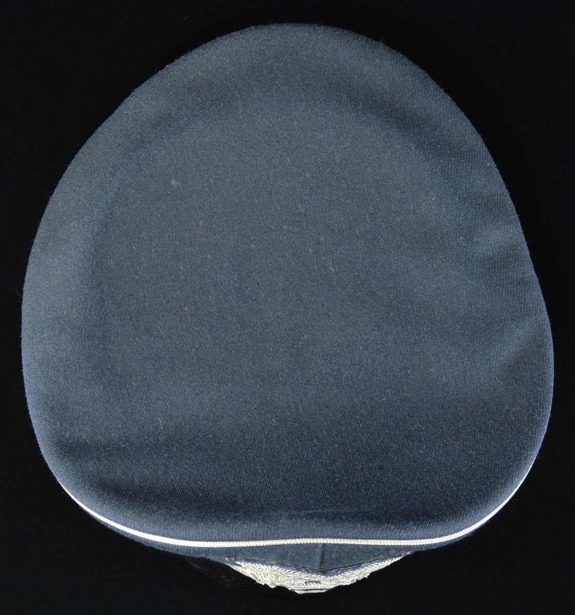 This cap features a steel blue crown with a black mohair band, all piped with silver bullion. The crown has a bullion Luftwaffe eagle on the front, and the band has a bullion winged wreath surrounding a national cockade. Silver bullion chinstrap terminated by pebble finished buttons. The visor has a black exterior and a brown underside. The sweatband is brown, and the interior lining is a silver/gray rayon. The diamond shaped sweat shield has one rounded end and is marked in silver ink on the inside “OFFIZIER KLEIDERKASSE BERLIN GES. GESCH. EREL Sonderklasse Extra”. CONDITION: cap generally shows light wear, but is a bit soiled. The sweatband shows wear at the lower edge. The interior lining has some sweat stains. PROVENANCE: From the Lifelong Collection of Glen E. Mattox. (02-18287/BF). $500-750.