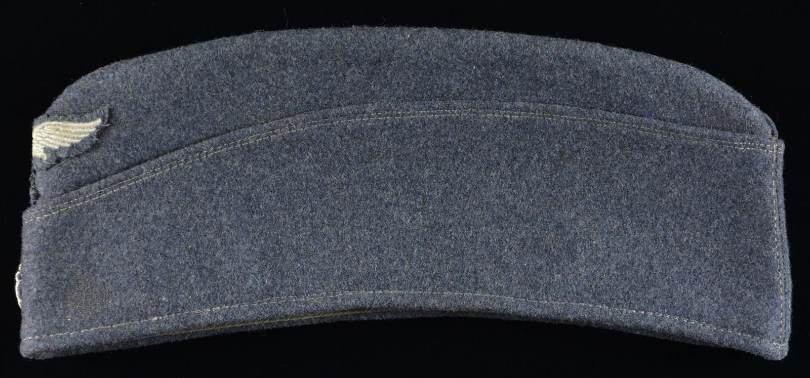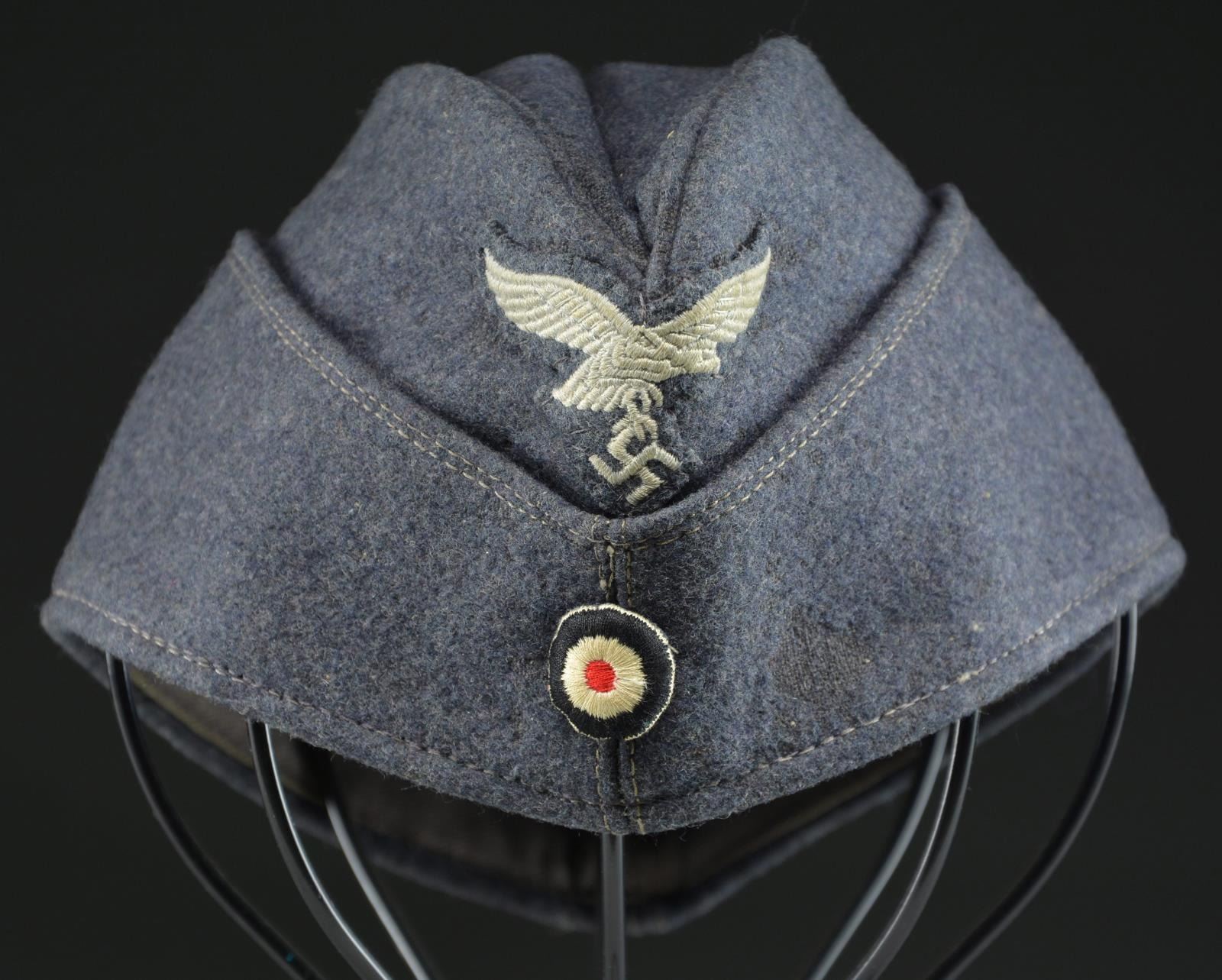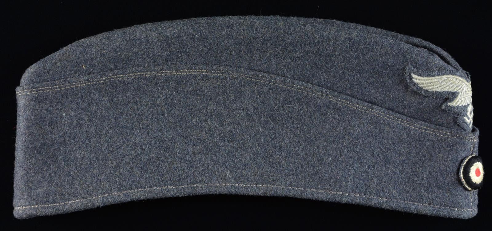 A good example of an early war Luftwaffe side cap in blue-gray wool with a sewn Luftwaffe eagle at the top front and a sewn national cockade at the lower front. The interior is lined with gray polished cotton and is stamped “Lago West Koln 1941”. The hat is also stamped size “54”. CONDITION: cap shows overall light wear with minimal staining & soiling. PROVENANCE: From the Lifelong Collection of Glen E. Mattox. (02-18288/BF). $200-300.