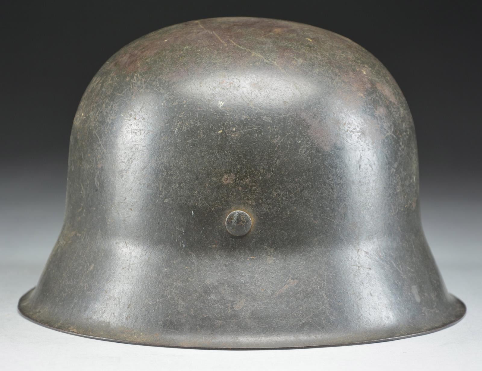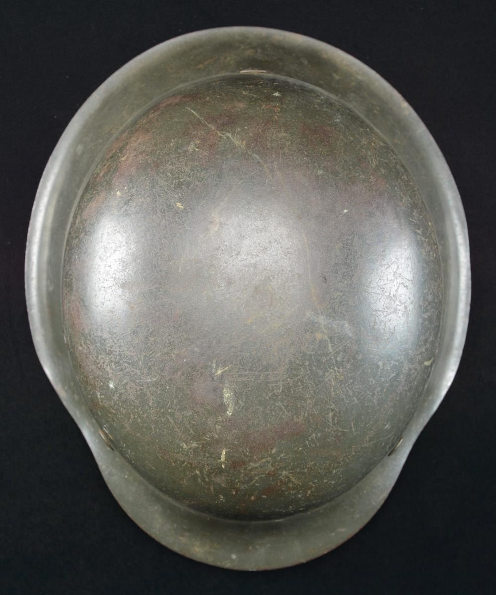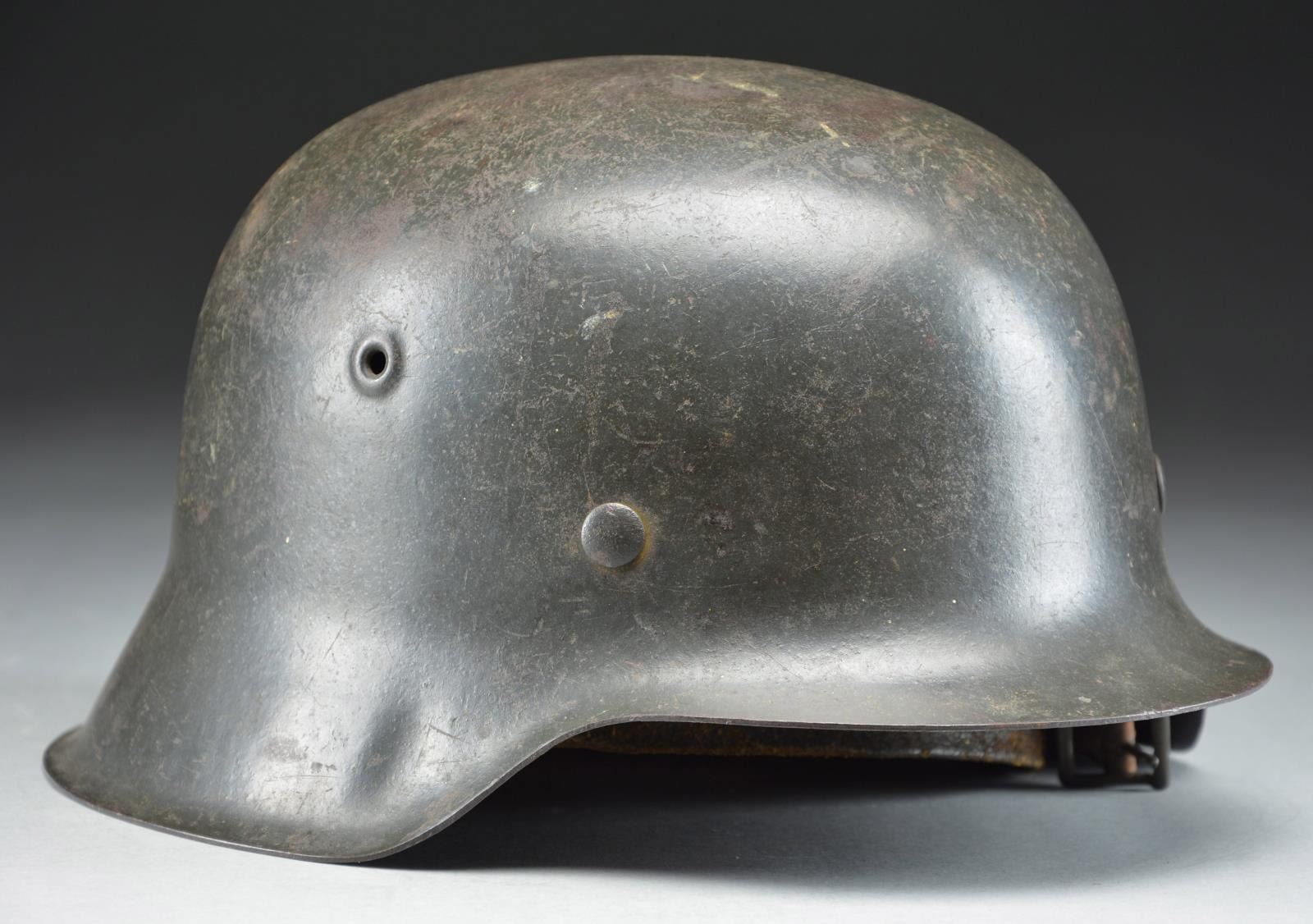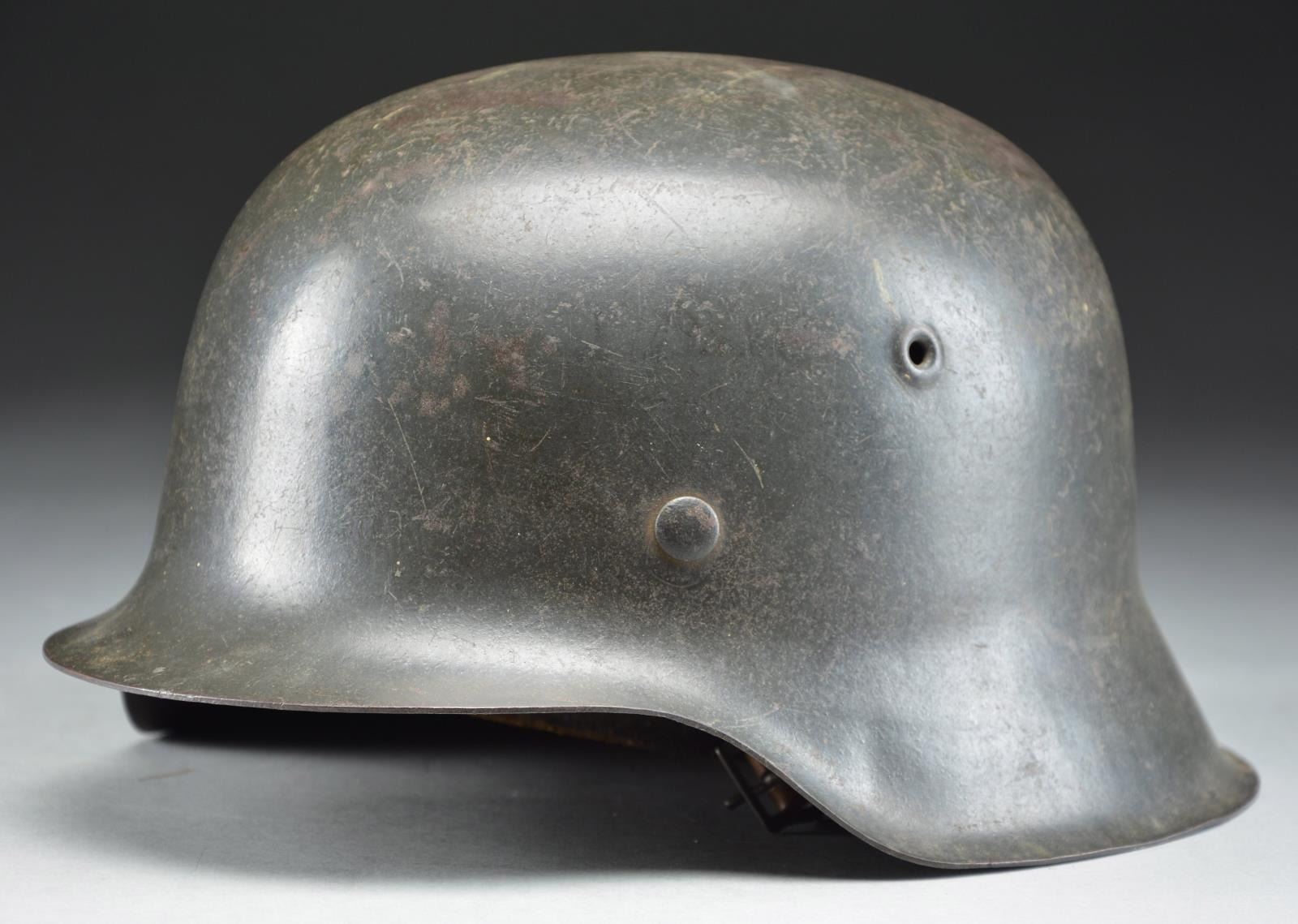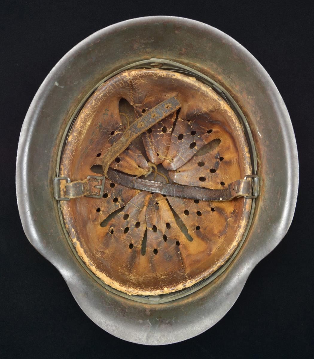 This M1942 helmet has a very dark green painted finish and no decals on the outside. The inside left has no stamping, but the inside rear is stamped “2569”. Brown leather 8-tongue liner with the name “W. KLOCKER” written in faded black ink. Brown leather chinstrap. CONDITION: helmet finish is better than 95%. Liner & chinstrap show moderate wear but are complete. (02-19778/BF). $250-400.
