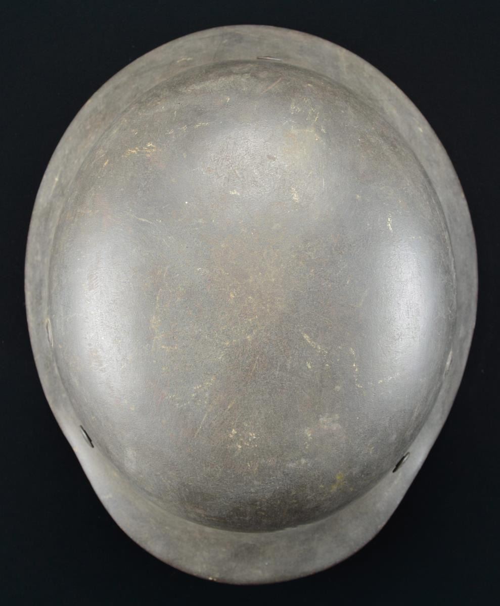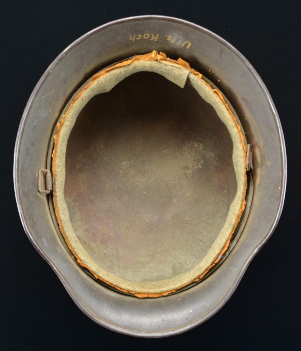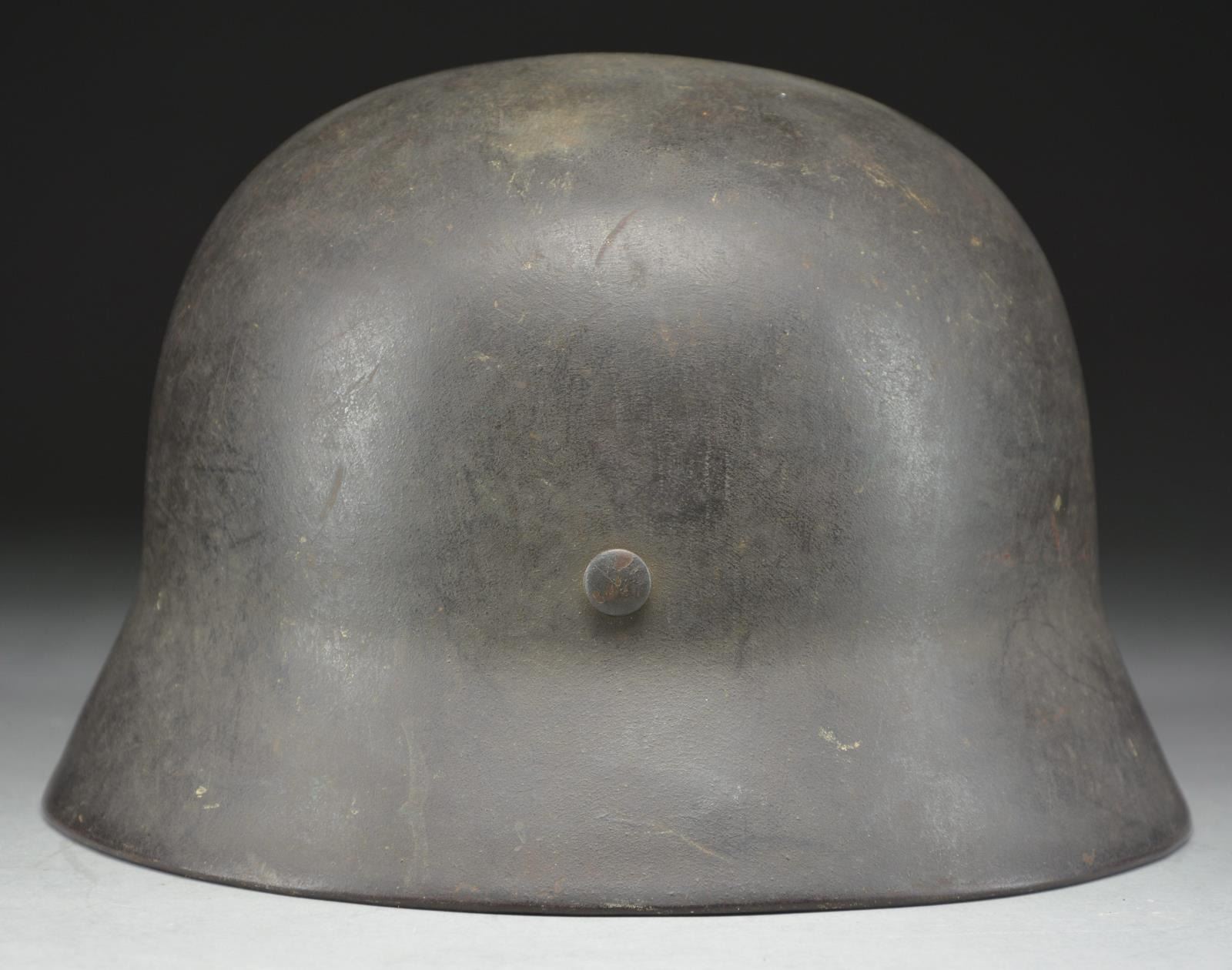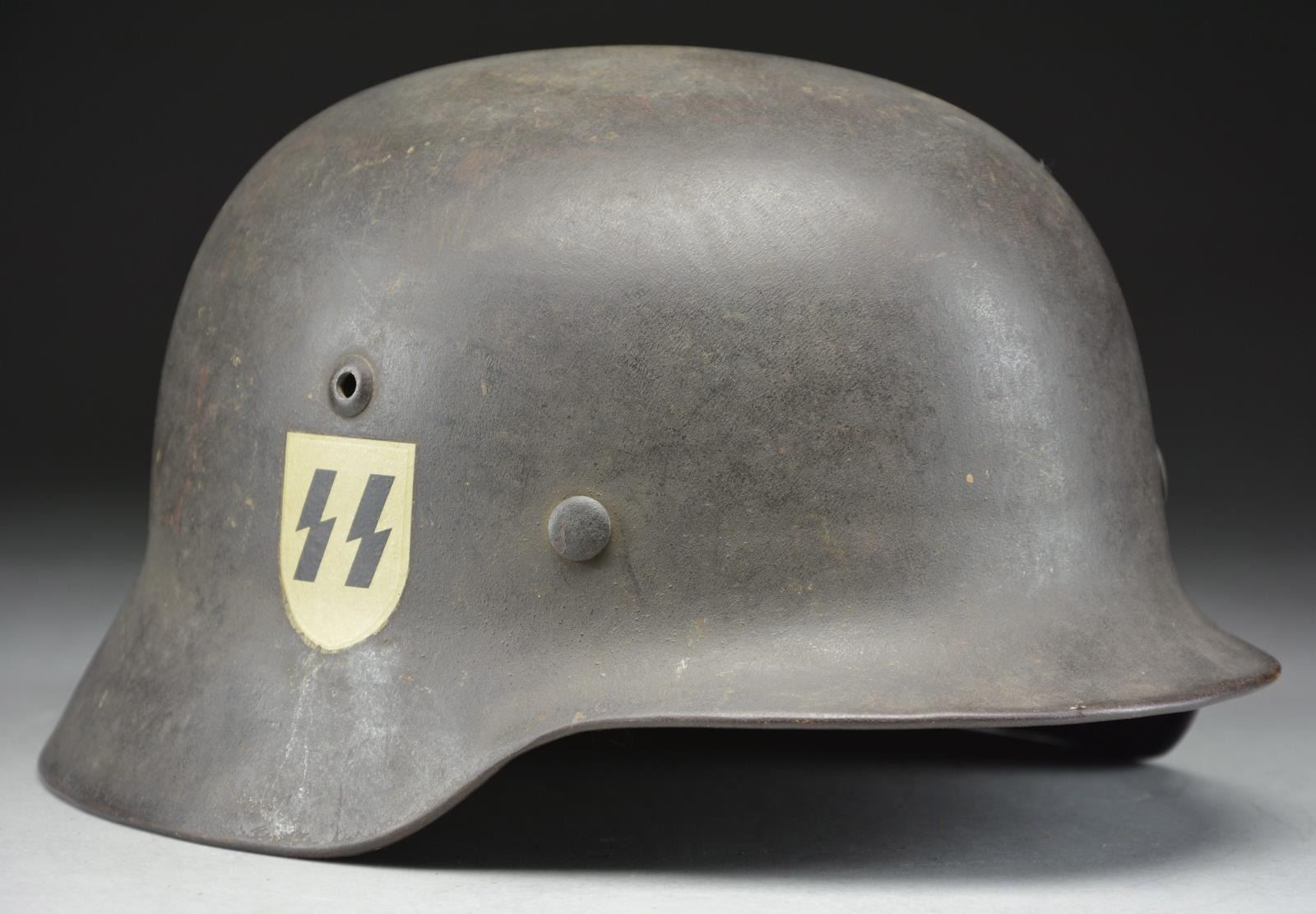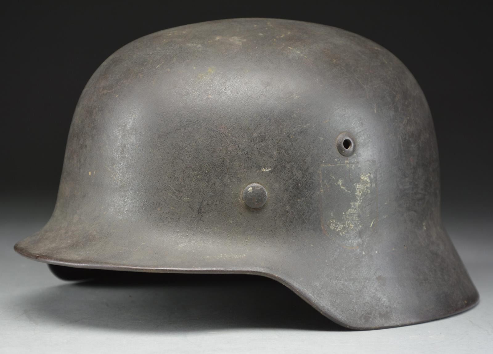 This helmet is quite interesting in that it has a dark gray, nearly black, painted finish, and the ghost of a shield shaped decal on the left side, which is quite possibly a SS shield. Unfortunately, a reproduction SS shield has been added to the right side for display purposes. The interior left of the helmet is stamped “NS66”, and the interior rear is stamped “E 106”. The interior rear of the helmet is also painted in white “Uffz. Koch”. There is no liner or chinstrap remaining. However, the band & felt covering are present. An interesting helmet. CONDITION: finish is approx. 80%. (02-19638/BF). $200-400.