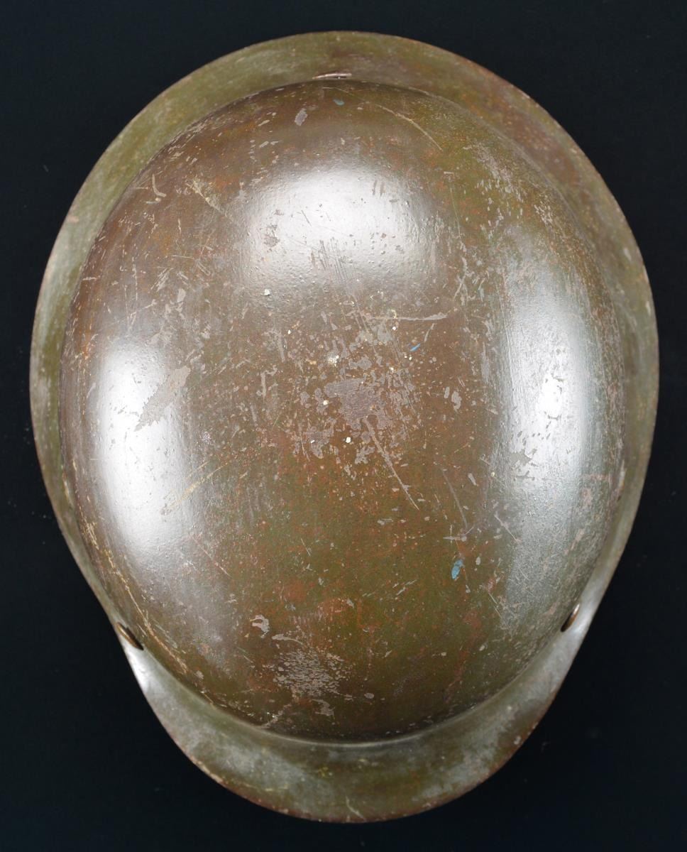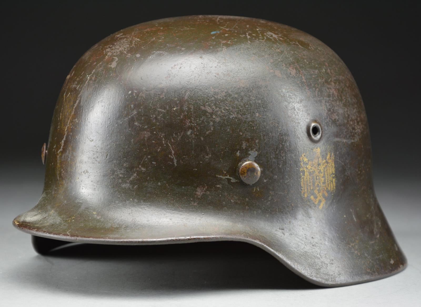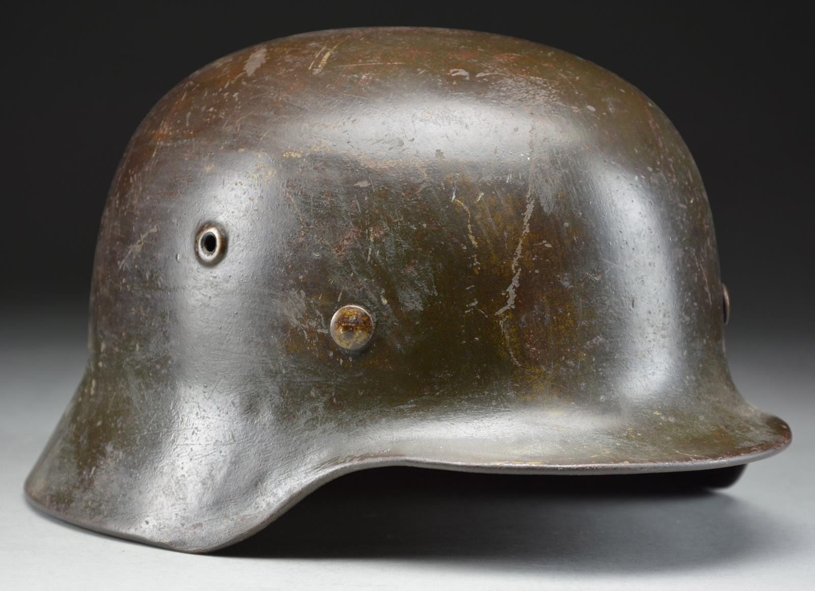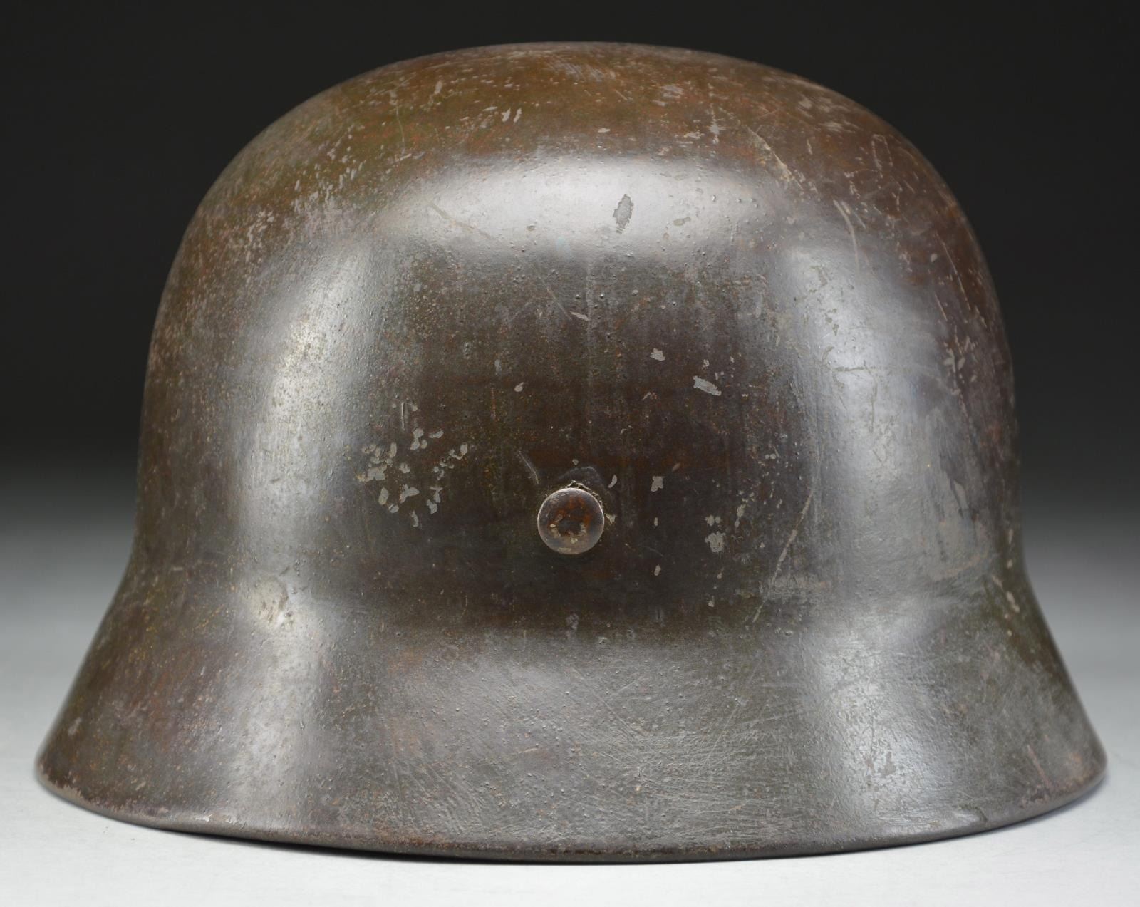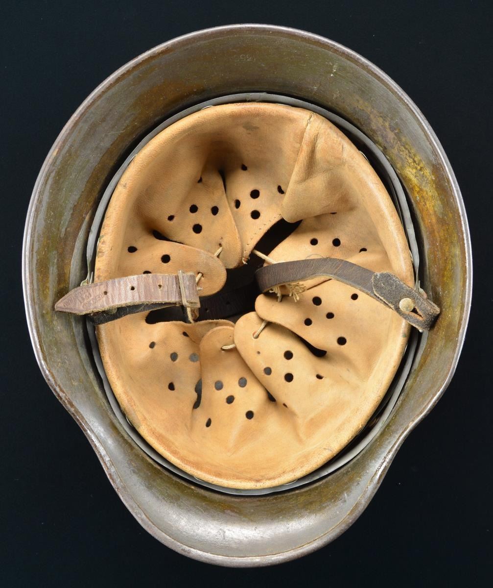 This helmet has a very dark green painted finish with a Wehrmacht style eagle in gold on the left side denoting Kriegsmarine use likely by the Coast Artillery. Inside left of the helmet is stamped “SE66” and the inside rear is stamped “1355”. Tan 8-tongue liner stamped size “56”. Dark brown chinstrap. CONDITION: helmet retains approx. 95% original finish. Decal is approx. 75%. Liner & chinstrap show light to moderate wear. (02-19009/BF). $500-800.
