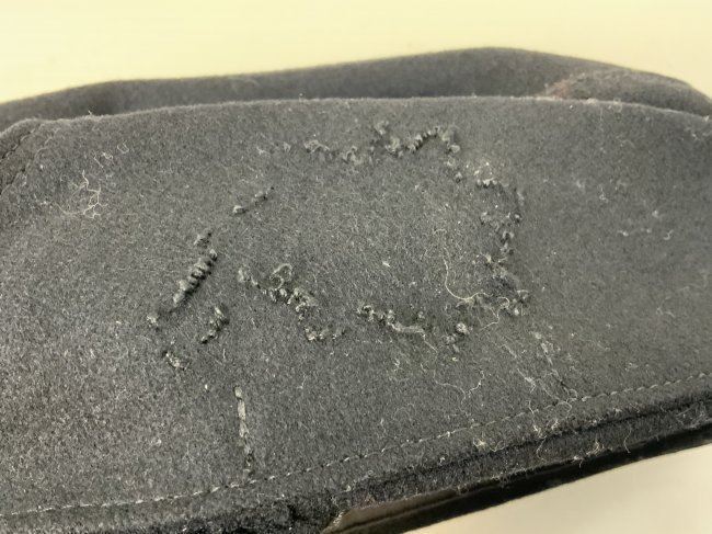 WWII GERMAN M43 BLACK PANZER SS FIELD CAP HAT . WELL USED BUT STILL IN GOOD CONDITION . LATE WAR STYLE EMBROIDERED INSIGNIA. EVIDENCE OF THE EDELWEISS PATCH TO THE SIDE THAT WAS REMOVED AT SOME POINT . GRAY MATERIAL LINING WITH NORMAL WEAR . SIZE ABOUT 57