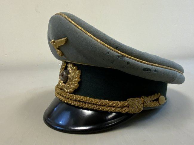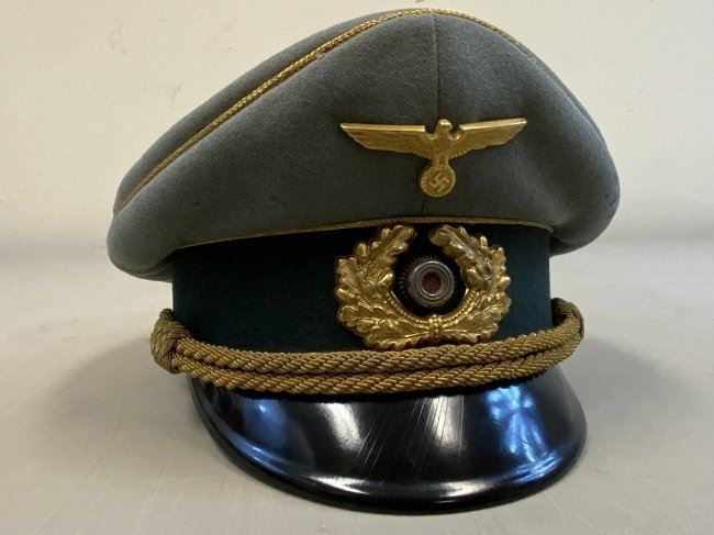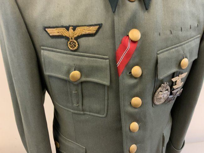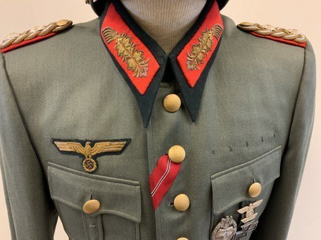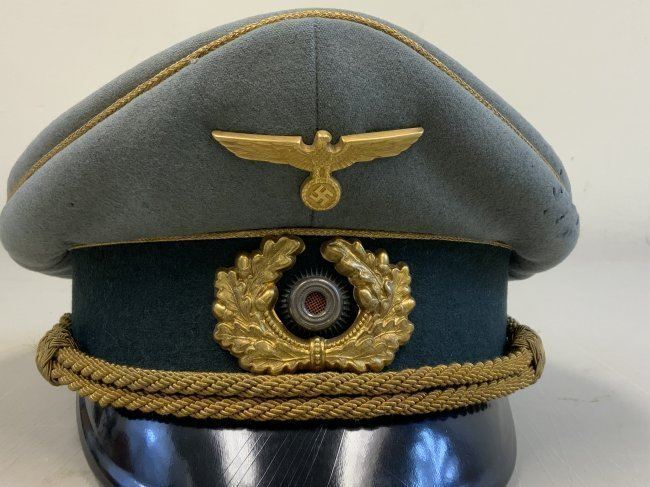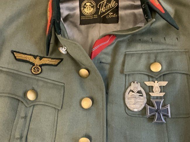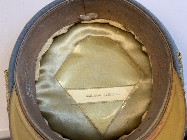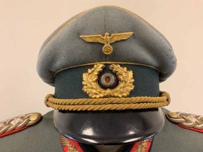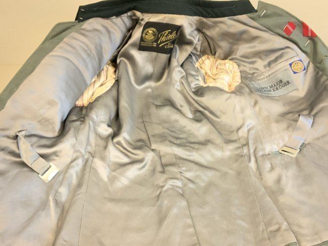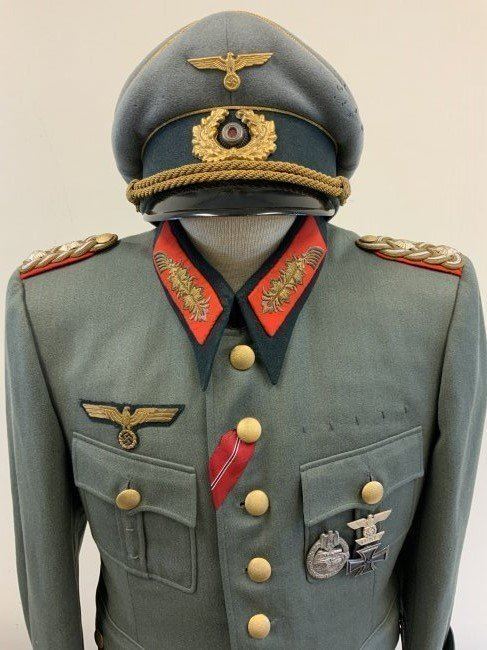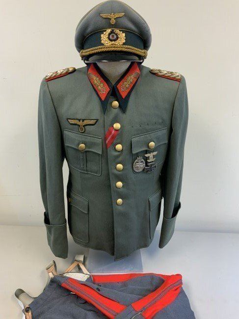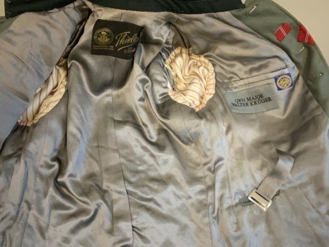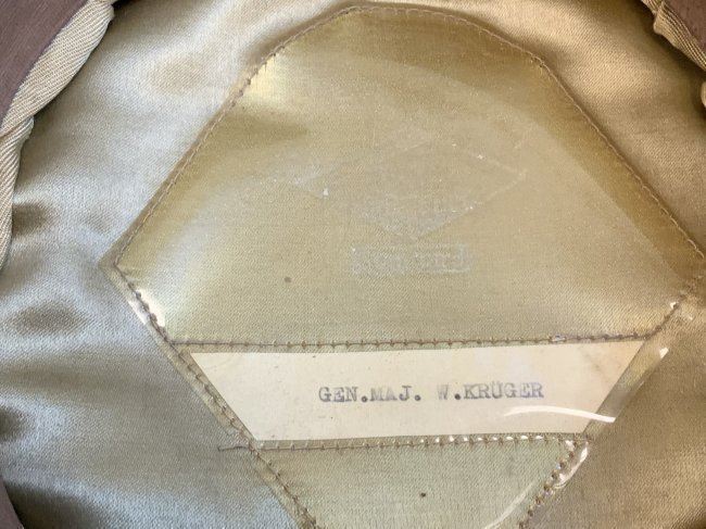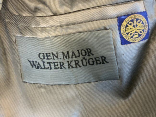 WWII GERMAN GENERAL OFFICER UNIFORM COMPLETE WITH TUNIC, PANTS AND VISOR HAT . NAMED TO GENERAL DER PANZERTRUPPE WALTHER KRUGER . BEAUTIFUL HIGH QUALITY TAILORED TUNIC WITH TAYLOR LABEL AND NICE NAME LABEL . MATCHING HAD BY EREL AND NAMED INSIDE. SOME MOTH NIPS TO THE SIDE BRIM . VERY NICE GENERALS PANTS WITH SUSPENDERS. GREAT HISTORICAL SET . Eugen Walter Kr?ger (23 March 1892 ? 11 July 1973) was a German general during World War II who commanded the LVIII Panzer Corps. He was a recipient of the Knight's Cross of the Iron Cross of Nazi Germany.Awards and decorationsIron Cross (1914) 2nd Class (9 October 1914) & 1st Class (29 July 1916)[1]Knight's Cross of the Military Order of St. Henry (29 April 1918)Clasp to the Iron Cross (1939) 2nd Class (12 May 1940) & 1st Class (13 May 1940)[1]German Cross in Gold on 27 August 1942 as Generalmajor and commander of 1. Panzer-Division[2]Knight's Cross of the Iron Cross with Oak Leaves Knight's Cross on 15 July 1941 as Generalmajor and commander of 1. Sch?tzen-Brigade[3] 373rd Oak Leaves on 5 June 1944 as Generalleutnant and commander of 1. Panzer-Division