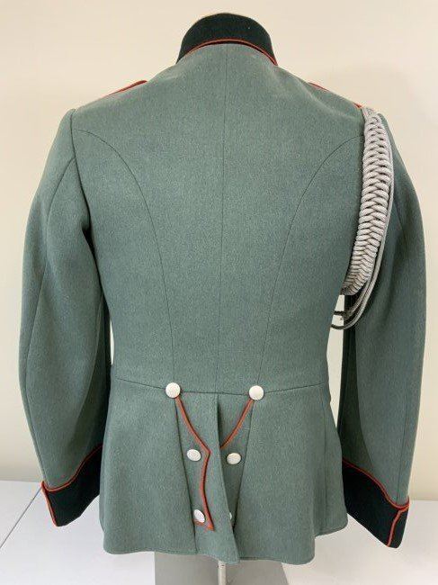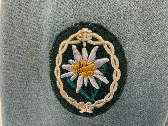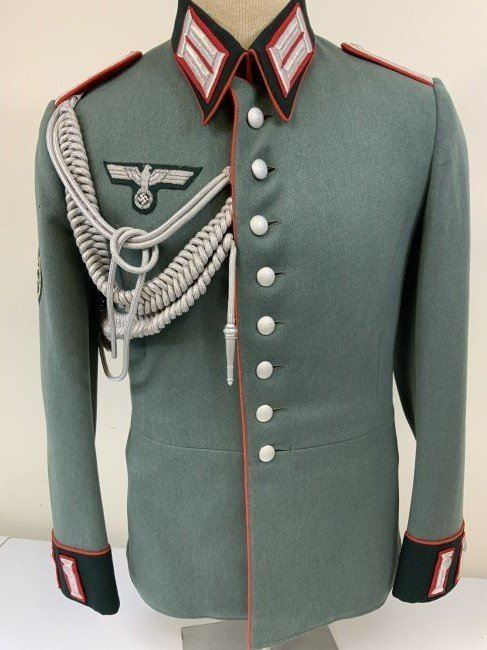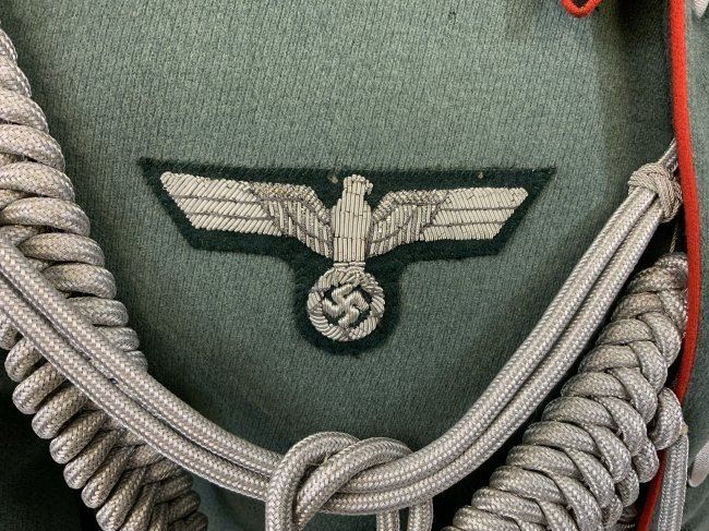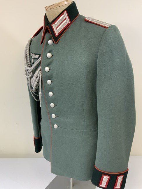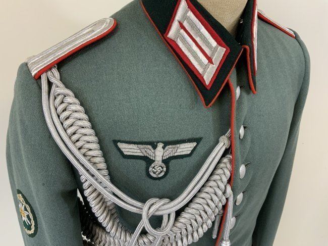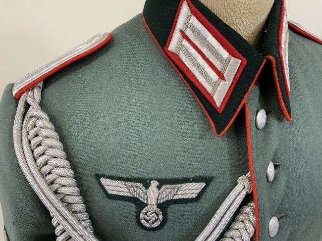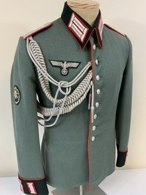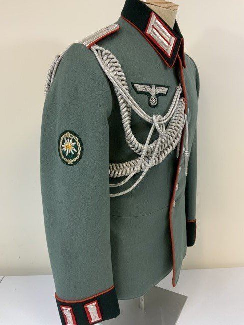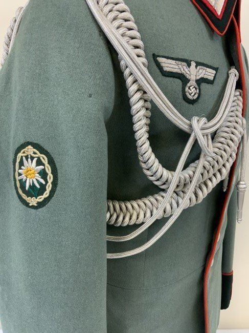WWII GERMAN MOUNTAIN ARTILLERY TROOPS OFFICER DRESS UNIFORM TUNIC WAFFENROCK . EXTREMELY RARE TUNIC. BEAUTIFUL HIGH QUALITY MATERIAL . NAMED TO AN OFFICER ON THE TAYLOR LABEL INSIDE POCKET. EDELWEISS MOUNTAIN SLEEVE PATCH . COMPLETE WITH DRESS SILVER ARTILLERY OFFICER'S AIGUILLETTES .SUPERB EXAMPLE READY TO DISPLAY .