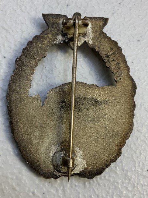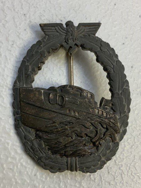 WWII GERMAN NAVY KRIEGSMARINE E BOAT BADGE TYPE I BADGE. ZINK BASE .MOST OF THE FINISH IS GONE. UNMARKED EXAMPLE WITH VERTICAL PIN.