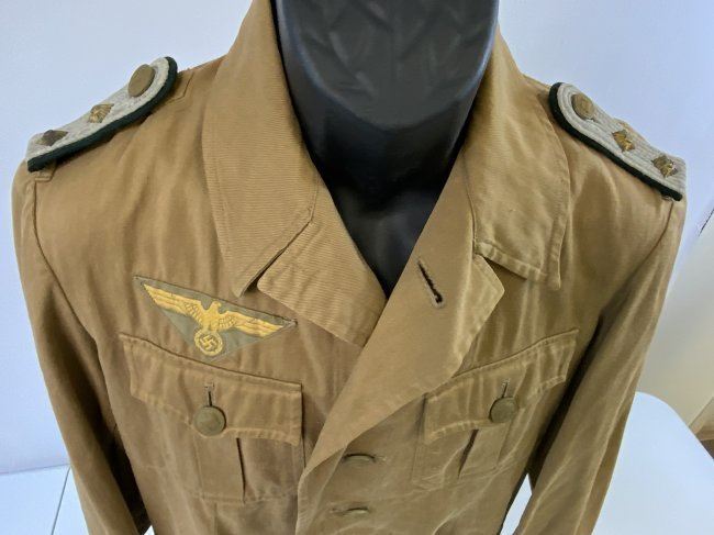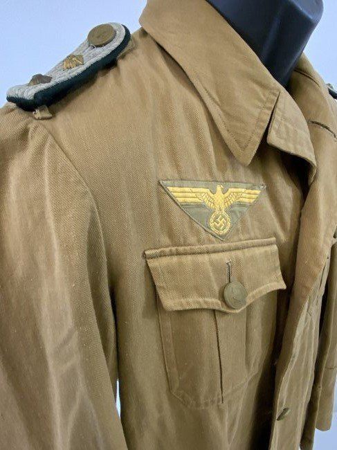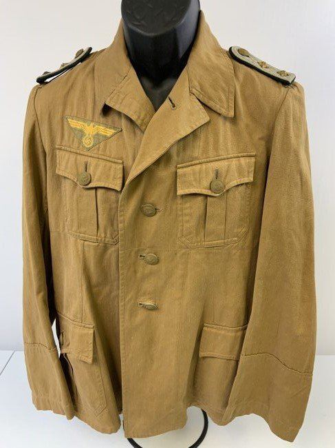 WWII GERMAN NAVY KRIEGSMARINE TROPICAL TUNIC. NAMED TO GUNTER PRIEN INSIDE WITH INK PEN . GUNTER PRIEN WAS A FAMOUS U-BOAT COMMANDER . GREAT CONDITION RARE TUNIC WITH TAN COLOR PAINTED BUTTONS . REMOVABLE IBOARDS AND BUTTONS . VENTED UNDER ARMS . INK STAMPED INSIDE . KAPITANLEUTNANT SHOULDER BOARDS. MACHINE SEWN NAVY TROPICAL EAGLE. VERY RARE TUNIC AND ESPECIALLY NAMED TO A FAMOUS GERMAN U-BOAT COMMANDER