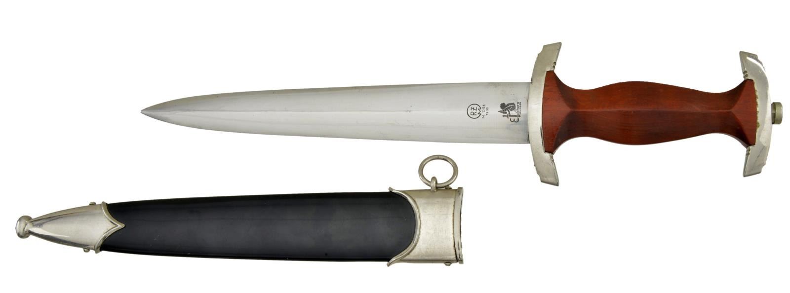 Overall length: 14 3/4". Blade is etched “Alles fur Deutschland” and is marked near the hilt “RZM M 7/66 1938” & “(squirrel) Eickhorn SOLINGEN”. Plated cross guard & top guard. Brown wood grip with brown enameled SA button and nickel silver eagle. Scabbard has a black enameled finish with plated mounts. CONDITION: blade shows light scabbard wear only. Hilt & scabbard show light wear. PROVENANCE: From the Lifelong Collection of Glen E. Mattox. (02-18284/BF). $550-750.