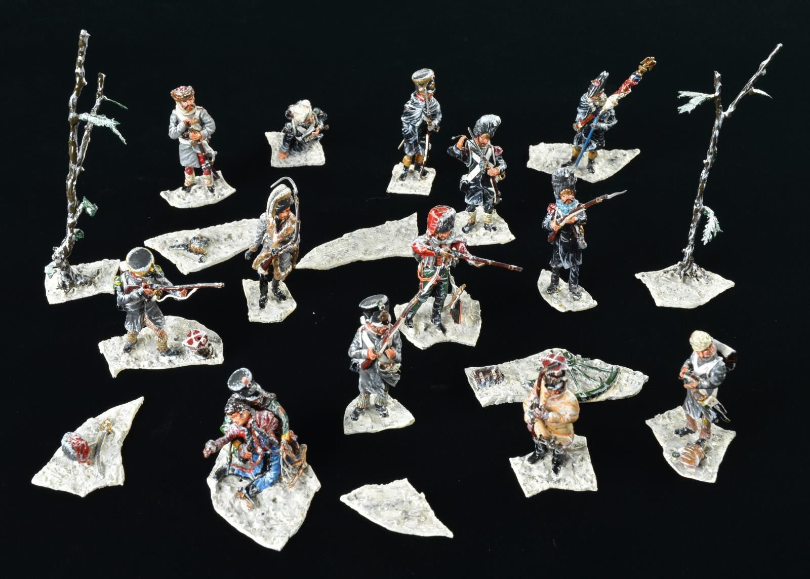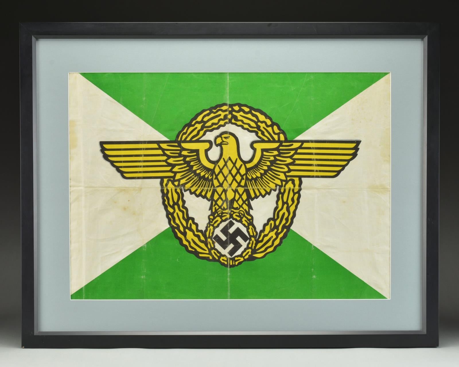 This group includes items that we feel could be of post WWII mfg. or assembled after the close of hostilities in 1945. We do not guarantee the below items to be of pre 1945 vintage although some elements of the pieces may be original. 1) WWII STYLE GERMAN POLICE FLAG. A printed green, white & yellow German Police flag measuring approx. 20" x 28" in a frame measuring 36" x 28". Flag depicts a yellow & black central police eagle on an alternating green & white diagonal field. Flag has not been examined out of frame. CONDITION: flag shows soiling & wear to folded edges. 2) TOY SOLDIERS. A contemporary selection of 13 painted metal Napoleonic soldiers, 2 trees & 5 landscape pieces all on a wooden display platform. Soldiers are carefully & realistically painted to depict the rear guard of Marshall Ney’s Army during the retreat from Moscow. Wooden base measures approx. 7 1/2" x 10" & has a brass plaque on the front, “NAPOLEON’S 1812 GREAT RETREAT FROM MOSCOW MARSHALL NEY’S THE REAR GUARD”. CONDITION: soldiers show light wear w/ various minor bends to rifles & accoutrements. (02-16035/BF) $200-400.