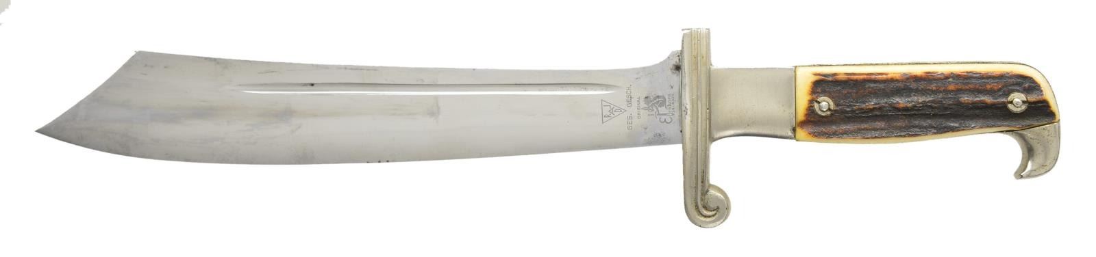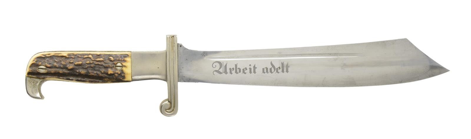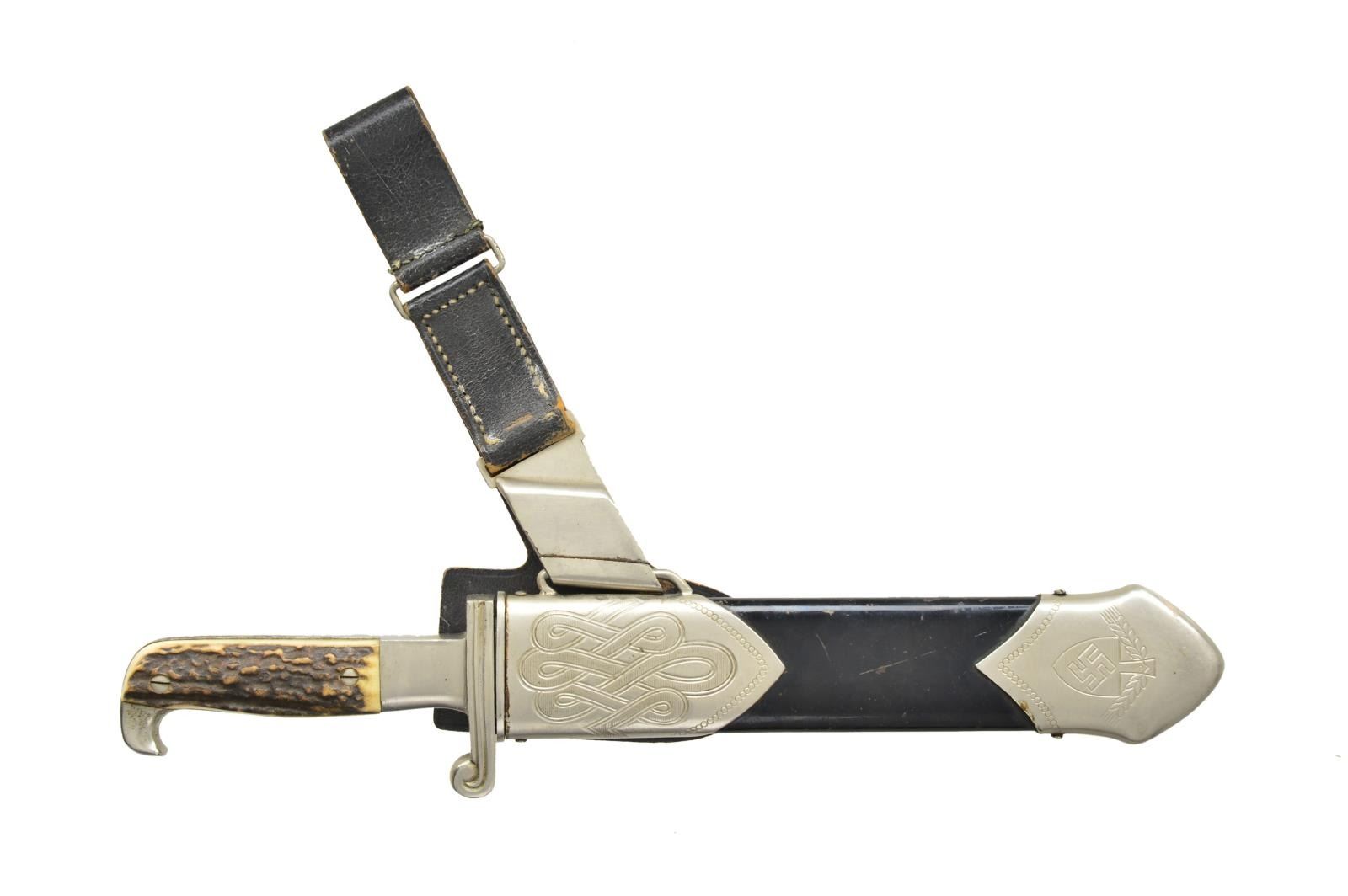 Overall length 15 5/8". Blade is etched “Arbeit Adelt”. The opposite side is marked at the ricasso “R L A D” in triangle and “GES. GESCH. ORIGINAL (squirrel) EICKHORN SOLINGEN”. Plated iron scross guard and eagle beak pommel. 2 Piece staghorn grips. Black enameled painted scabbard with plated mounts. Original hanger with leather protector. CONDITION: blade shows scabbard wear with some very minor discoloration. Hilt has some loss of finish, primarily on the backstrap. Grips are undamaged. Scabbard & hanger show light overall wear. PROVENANCE: From the Lifelong Collection of Glen E. Mattox. (02-18223/BF). $600-900.