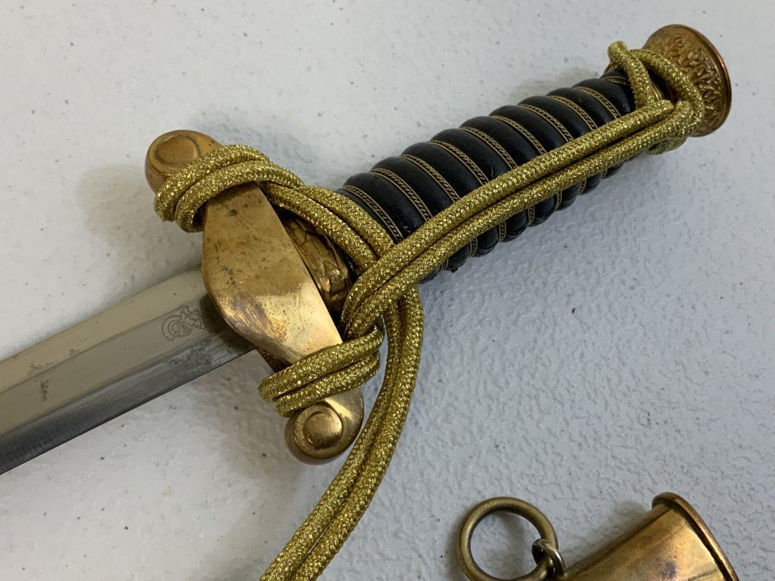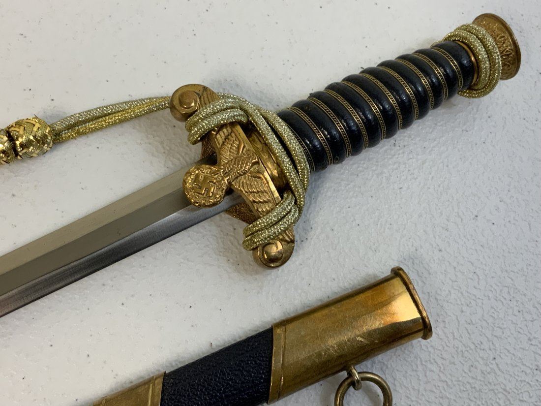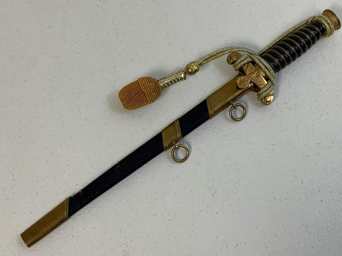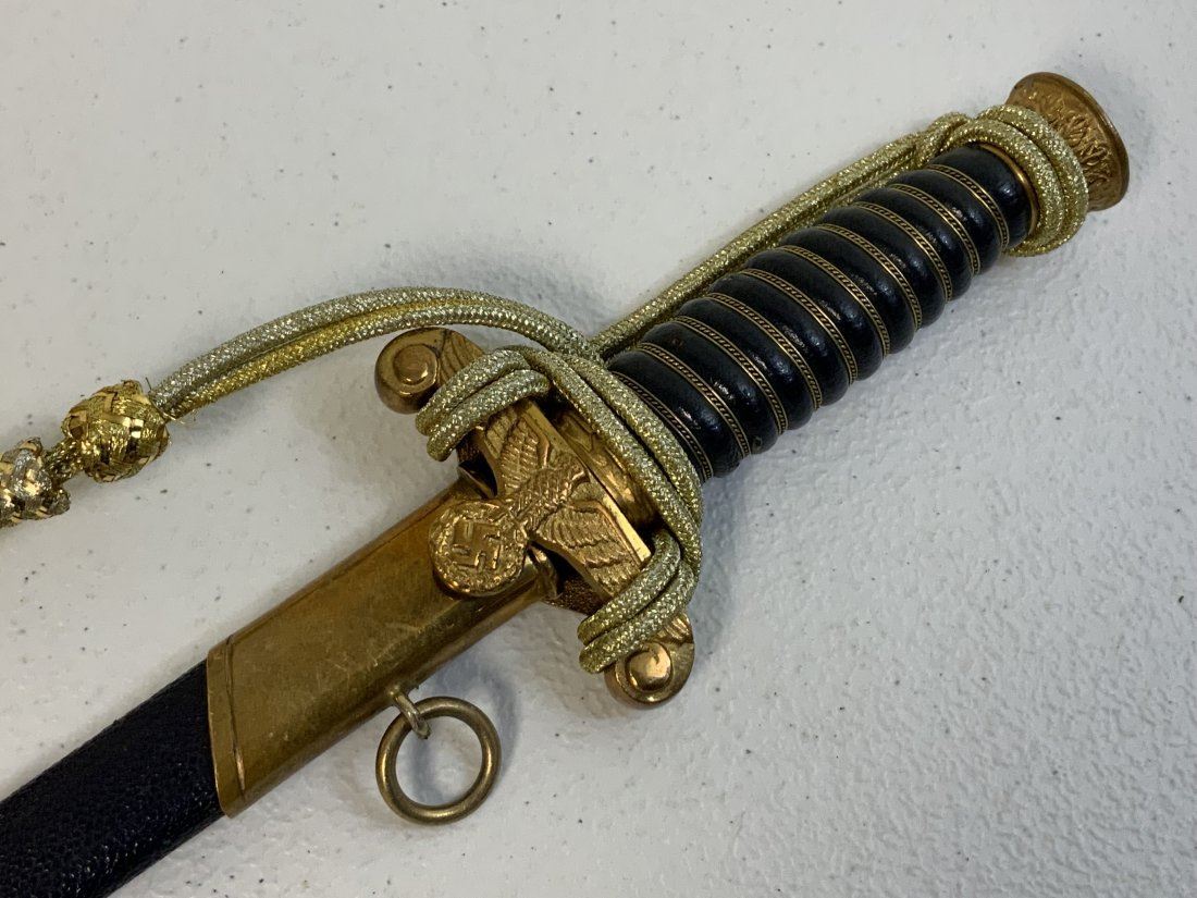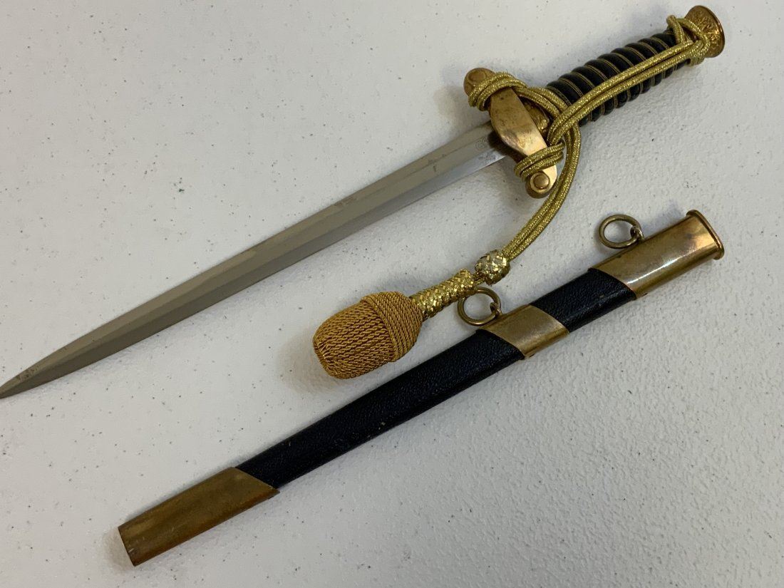 WWII GERMAN REICH WATER CUSTOMS OFFICIAL DAGGER . POSTWAR MADE COPY OF THIS EXTRA RARE DAGGER . GOOD CONDITION WITH NICE BLUE COLOR LEATHER WRAPPED GRIP AND SCABBARD . GILDED FITTINGS AND GOLD THREAD DAGGER KNOT. VERY HIGH QUALITY MADE . W.K.C.LOGO ON THE BLADE. GOOD FILLER FOR YOUR COLLECTION UNTIL UPI FIND AN ORIGINAL WWII PIECE .