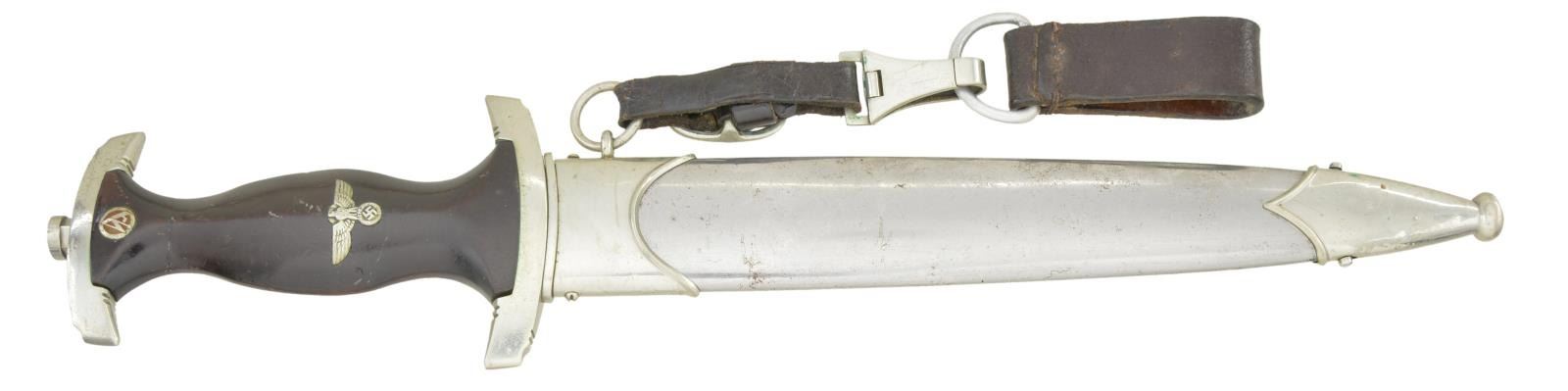 Overall length: 14 3/4". Blade is etched “Alles fur Deutschland” and is marked near the hilt “(crossed keys) F.HERDER R.S. SOLINGEN”. Nickel silver cross guard is stamped on the reverse “Nnh”. The top guard is also nickel silver. Dark brown wood grip with brown enameled SA button and nickel silver eagle. Scabbard has had the anodized or enameled finish removed down to the raw steel. Nickel silver mounts with brown leather hanger & belt loop. CONDITION: blade shows light overall wear. Cross guards generally show light wear. Grip is exceptionally dark and appears to have been coated with a lacquer. Scabbard has no finish, as stated. Hanger shows moderate wear. (02-19552/BF). $250-400.