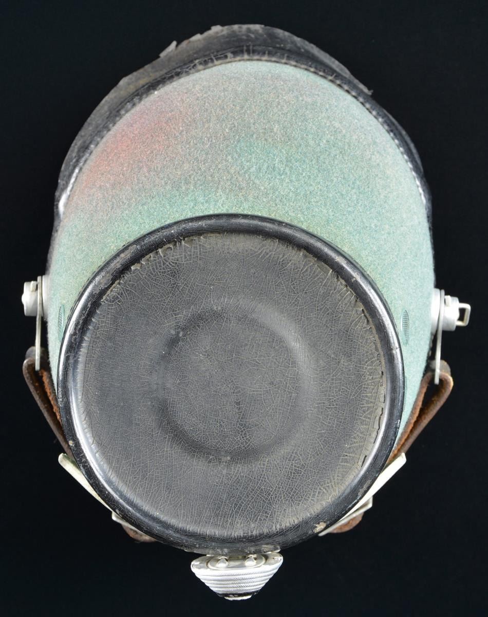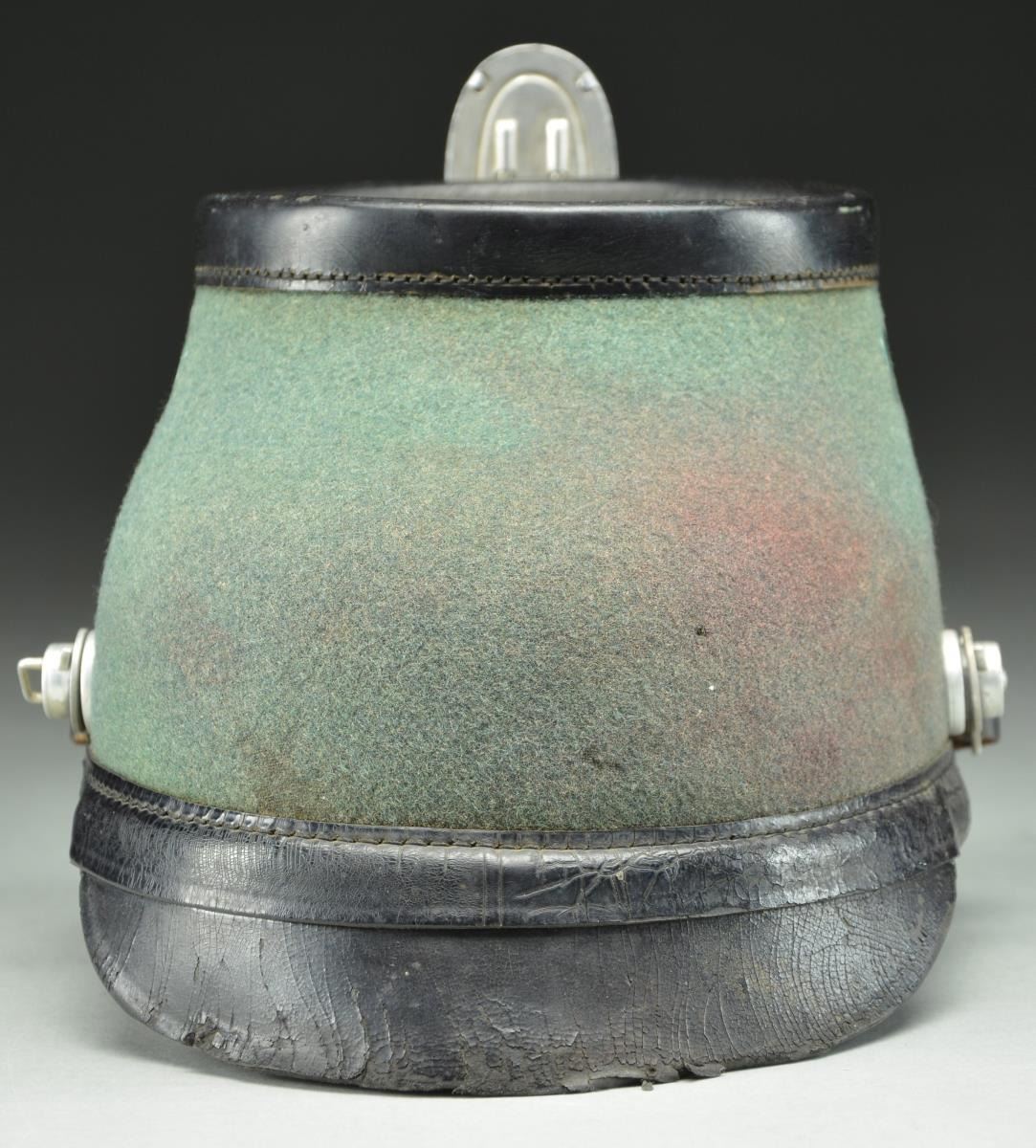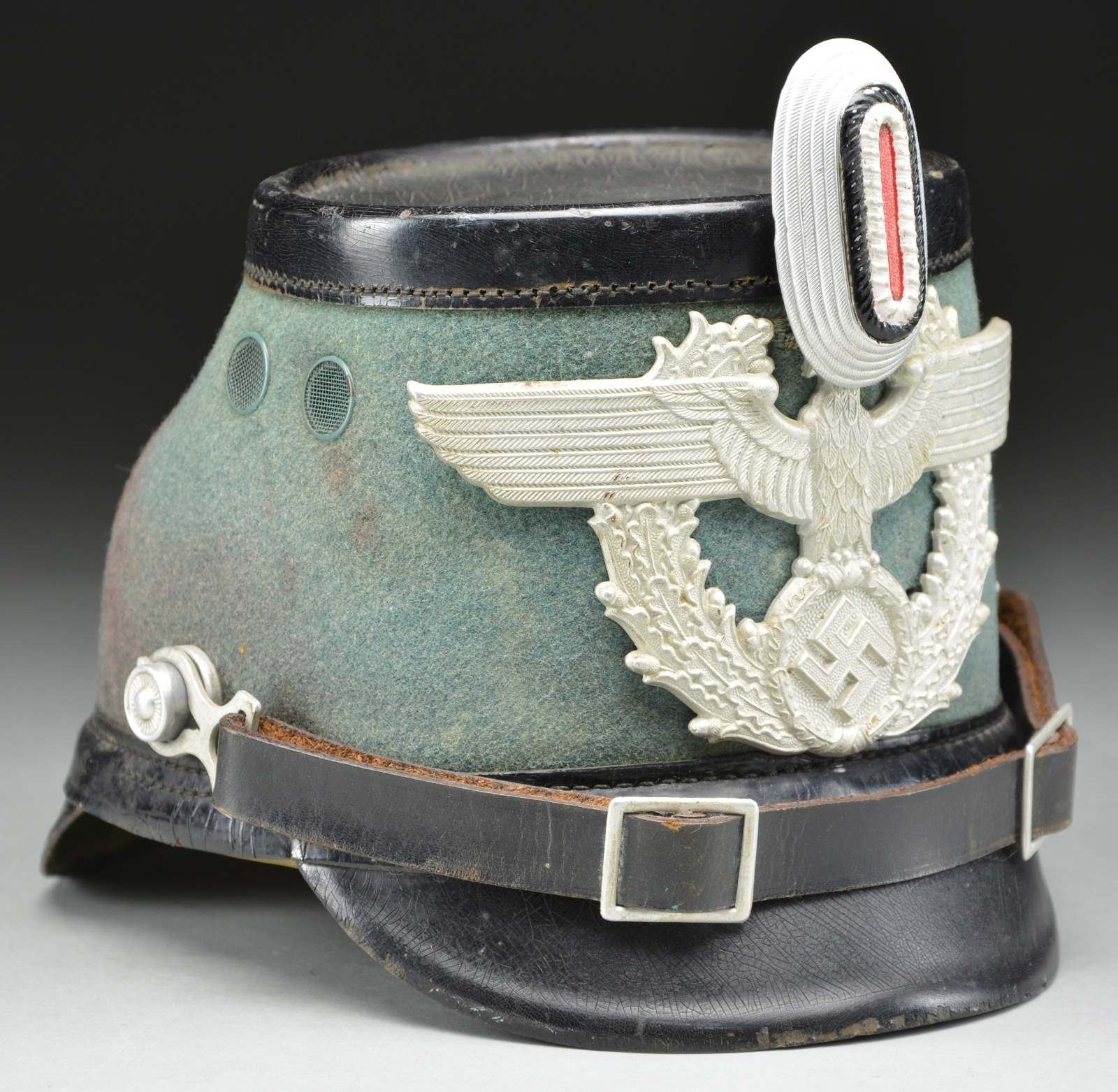 A good example of a standard issue shako worn by the enlisted ranks of the German police. This shako has a green felt covered leather body with black leather crown, visors & trim. There are 2 vents on each side and a large aluminum police eagle on the front. The shako is complete with its large elongated national colors cockade on the top. Black leather chinstrap attaches to aluminum side posts. The interior of the visors are green. The tan liner/sweatband is of 9-finger design. The interior crown has a label that reads “HANS ROMER Echt Fiber-Tschako Neu-Ulm (Donau)”. CONDITION: the green felt has some staining in the rear. The rear visor shows moderate wear. The interior is quite sound. PROVENANCE: From the Lifelong Collection of Glen E. Mattox. (02-18266/BF). $500-700.