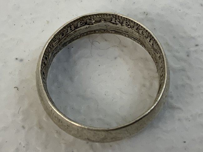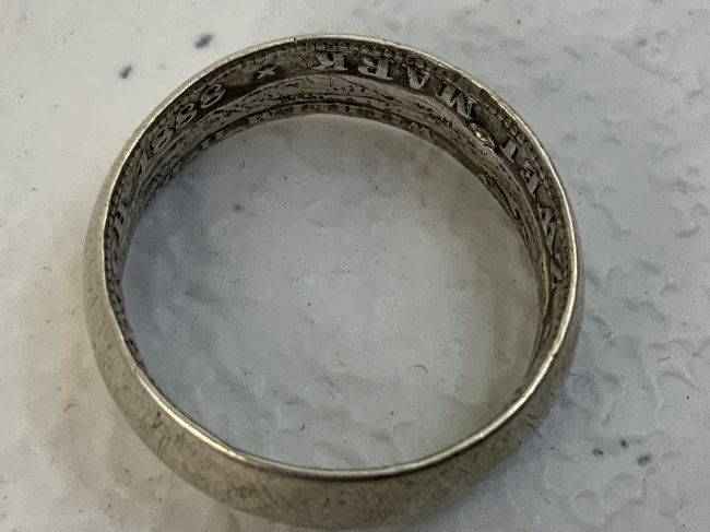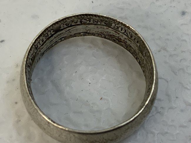 WWII GERMAN SILVER RING MADE FROM WWI GERMAN SILVER COIN . MID SIZE 8 RING MADE FROM 2 MARK 1888 SILVER COIN.