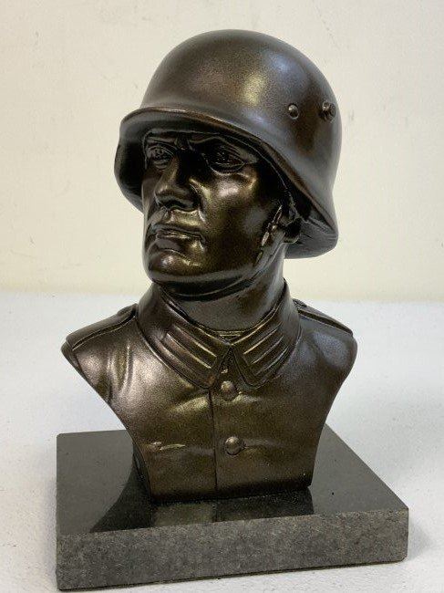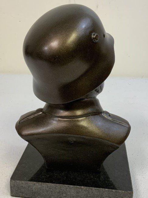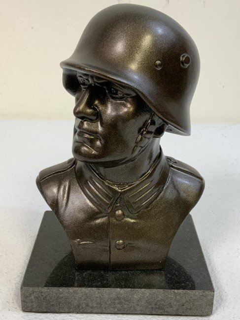 WWII GERMAN SOLDIER TABLE BUST DECORATIONS. POST WAR PRODUCED . CAST METAL ON STONE BASE. GREAT DECORATOR.
