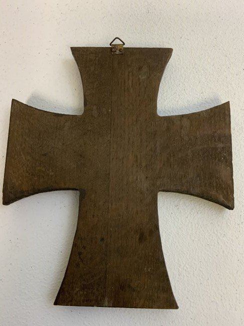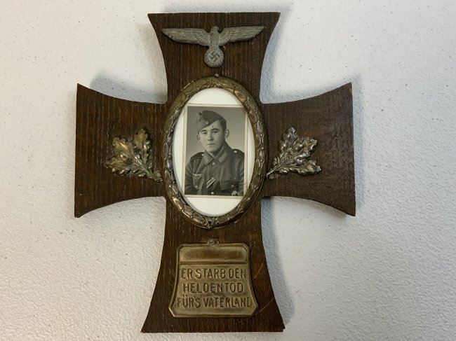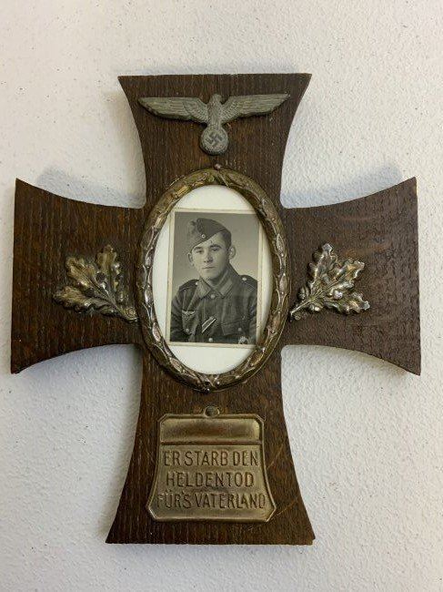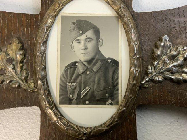 WWII GERMAN SOLDIERS PICTURE IN IRON CROSS DECORATED WOODEN FRAME . GREAT CONDITION . HANGING LOOP ON THE BACK . GREAT DECORATOR . 8 x 7