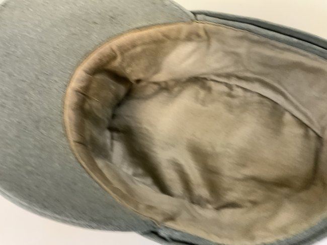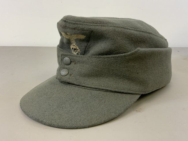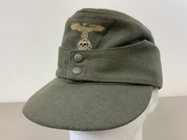 WWII GERMAN SS EM/NCO M43 LATE WAR FIELD HAT CAP . NICE LATE WAR EXAMPLE WITH LATE VERSION EMBROIDERED ONE PIECE INSIGNIA ZIGZAG STITCHED. WELL WORN BUT IN GREAT CONDITION . SIZE 59 FAINTLY INK STAMPED INSIDE . NICE DESIRABLE CAP