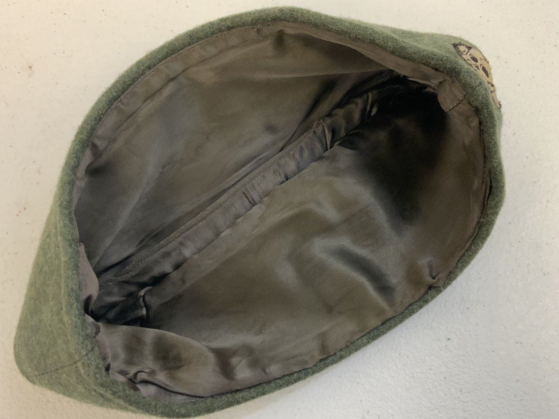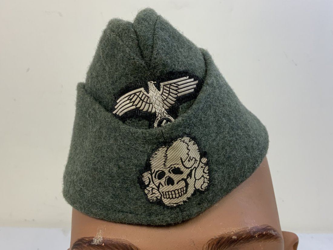 WWII GERMAN WAFFEN SS OVERSEAS CAP . GREAT NEAR MINT CONDITION WITH VERY LITTLE WEAR. GREAT CONDITION WOOL BODY WITH BEVO STYLE INSIGNIA SEWN. GRAY SILK LIKE TYPE MATERIAL LINING WITH INK STAMP THAT IS HARD TO READ. SIZE ABOUT 57
