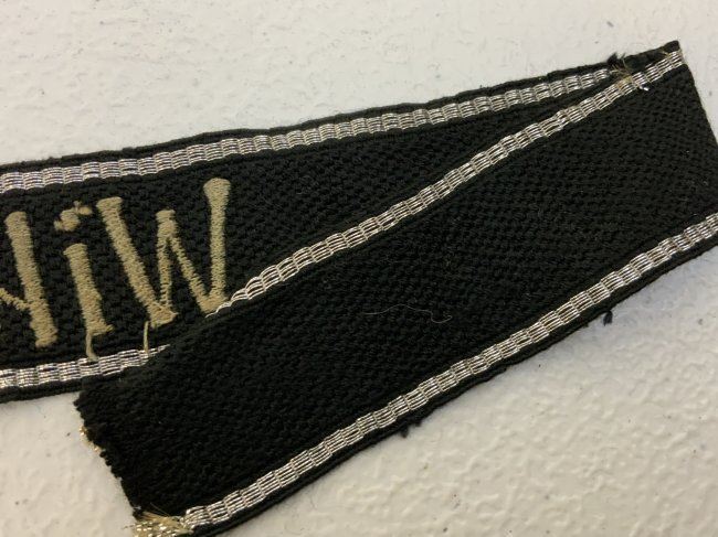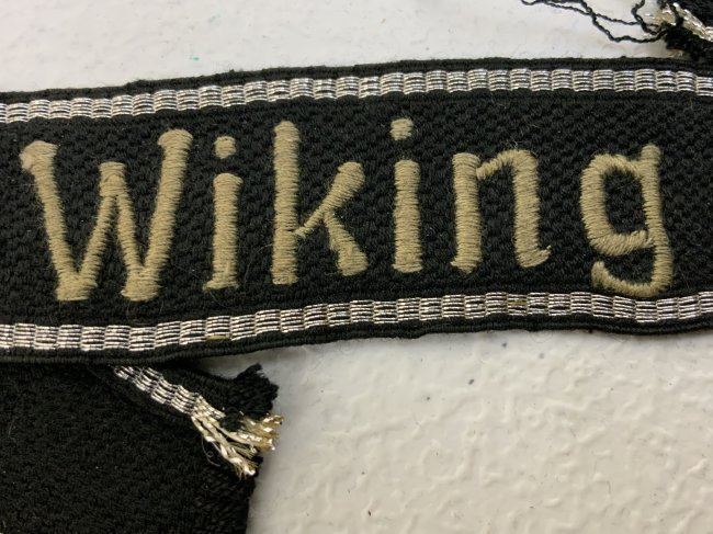 EM/NCOs cufftitle of the 5th SS-Panzer Division - Wiking. Machine woven, RZM pattern, black rayon cufftitle with machine embroidered script: "Wiking" in silver-grey cotton threads . This textbook cufftitle is bordered at the top and bottom edges in horizontally woven, seven strands in bright silver - aluminum threads. 14.5" long