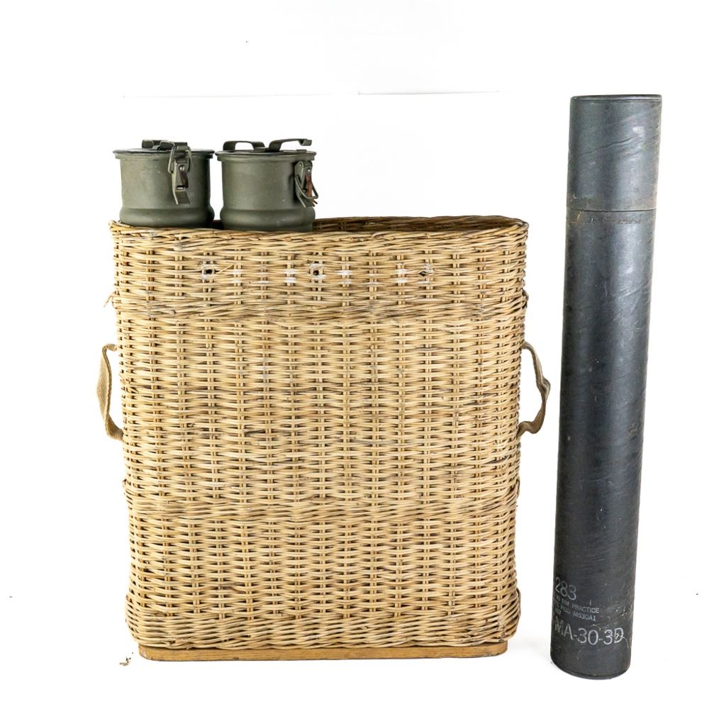 This lot of 2 transit wicker baskets is complete with 6 shell canisters. One wicker basket has wooden brackets to hold the shell canisters in place and the other is missing the bracket. There is a bit of a debate about when these were made. It is our opinion, this is from the post WWII period and may be shared Swiss and or German production. Many of these baskets have been converted to home decor use in more recent times. Baskets are unmarked and canisters as well. Also included is 90mm US transit tube from 90mm M371 practice round.