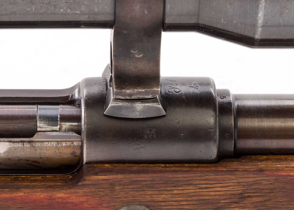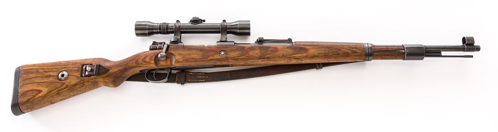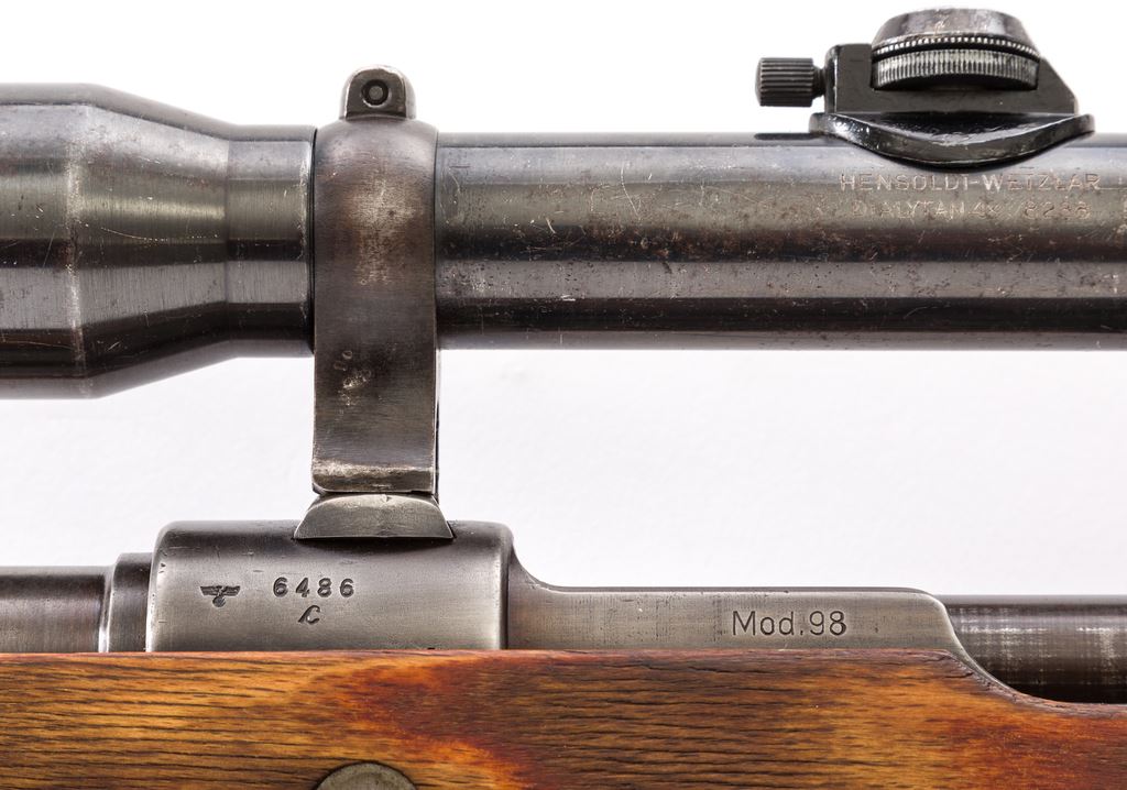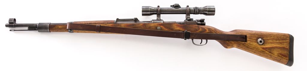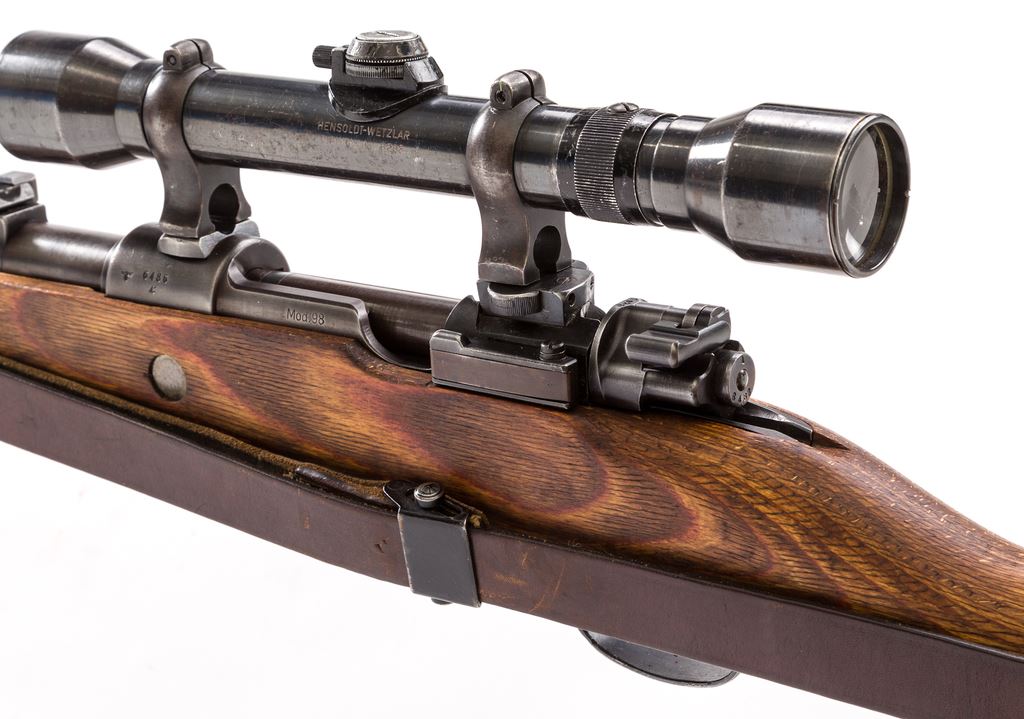 WWII German Double Claw Sniper Rifle, by J.P. Sauer, #6486c, 7.9x57mm cal., 24'' barrel, blue finish, laminated walnut stock, with one correct WWII era brown leather sling. Topped with a Hensoldt Dialytan (Wetzler) 4x scope numbered 8288, with standard German three-post reticle. Rifle features all visible matching numbers. Scope shows only its own serial number. Condition is fine retaining approx. 85% evenly thinning blue. Stock is excellent. Scope optics are clear, action is smooth, bore is fine. Est.: $6,000-$8,000. (C&R)