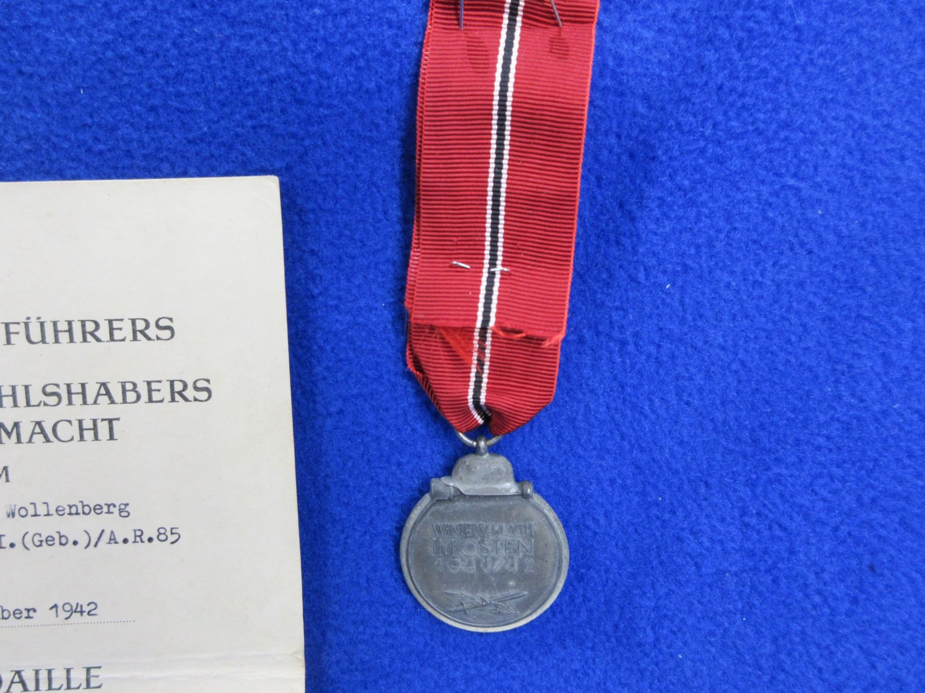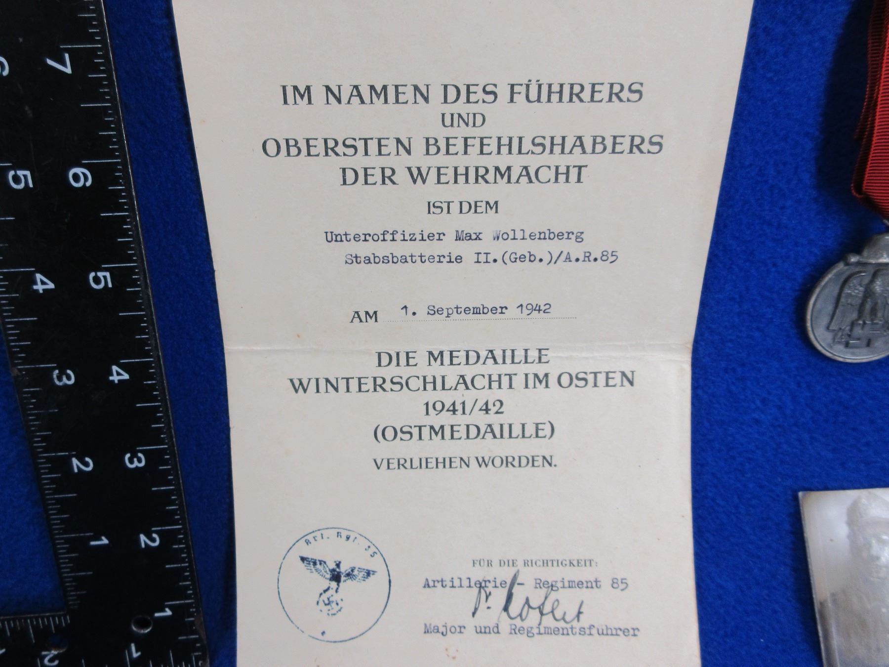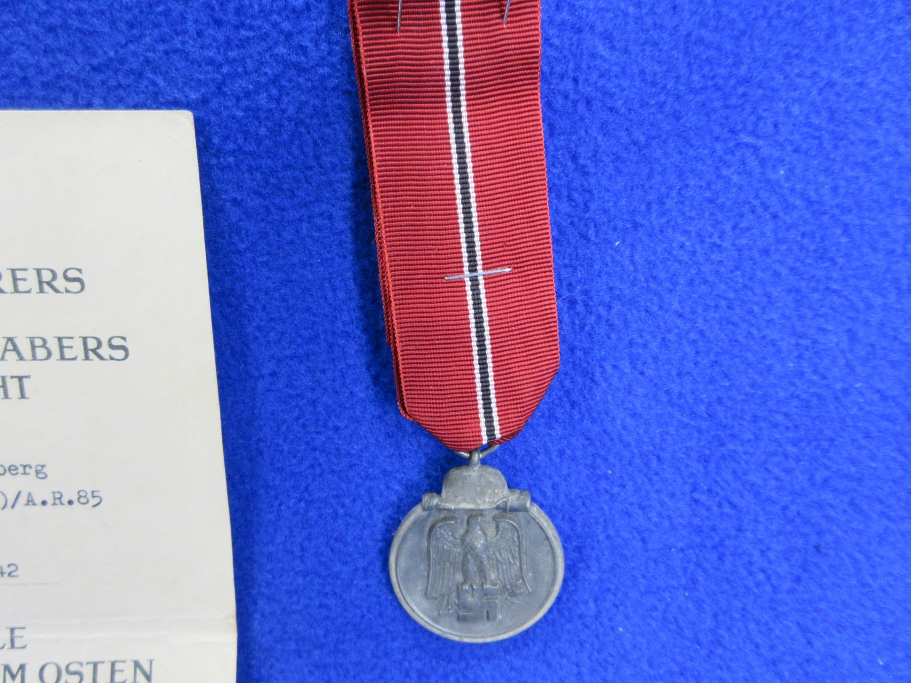 WWII German Eastern Front Medal with Ribbon (Marked Winterschlacht Im Osten 1941/42), Original Certificate (Dated September 1, 1942) and a Picture of the Recipient