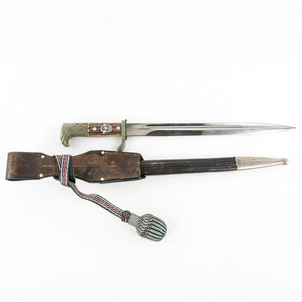 *NO RESERVE* This matching bayonet has "B" proof and "7" on blade spine and "7" on scabbard throat. Has Ewald Cleff- Solingen and has matching numbers identified possibility to Oppeln District. Tip is good and blade is bright with some minor spotting/discoloration and shows normal in/out wear and age. Has green felt crossguard washer. Grips have no chips or cracks. The black frog was dyed from brown and the back is still brown and has marker mark that starts with L but the rest is hard to read. Also marked "E38". Black leather scabbard is in decent condition with no dents to ball tip. Shows much age and wear.