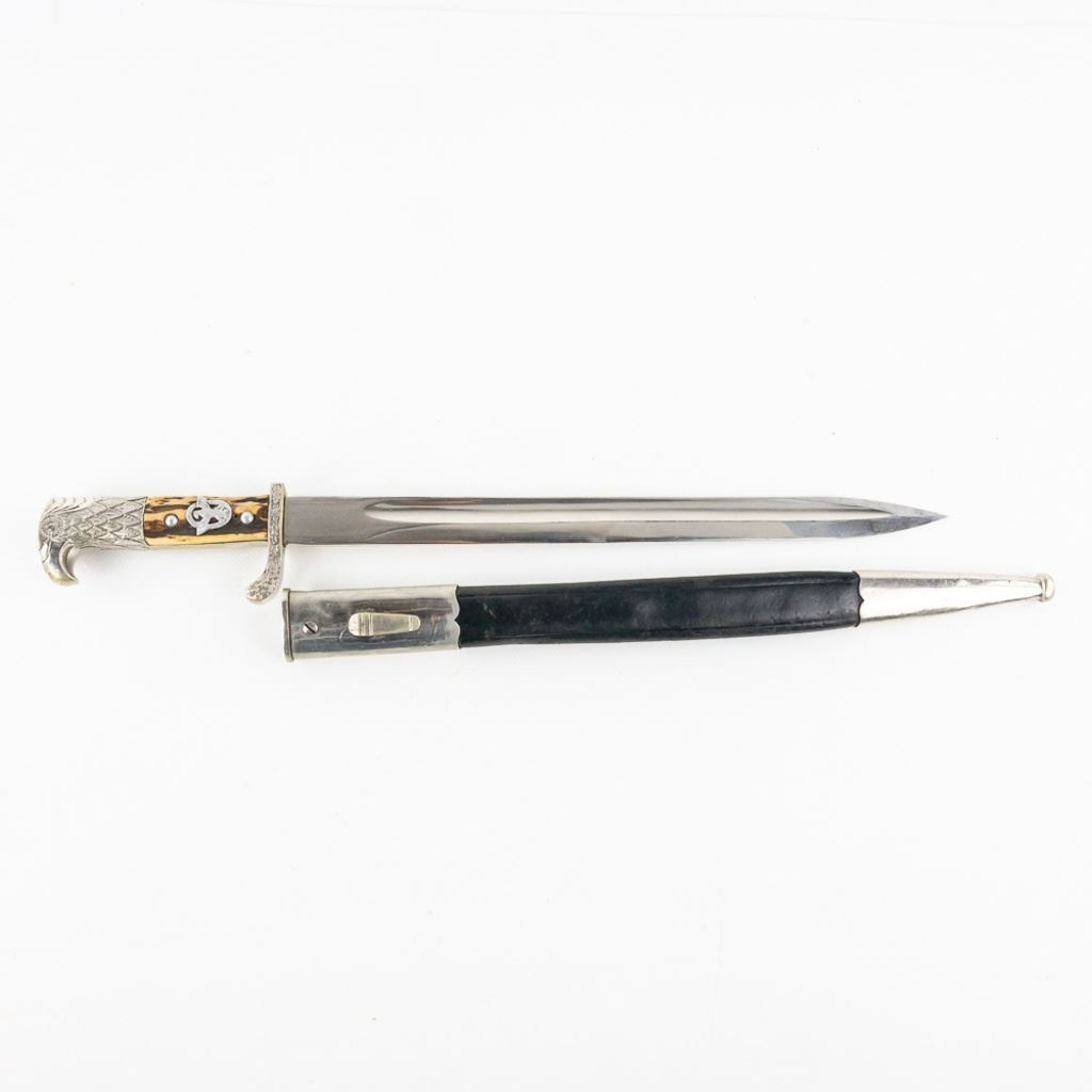 *NO RESERVE!*This matching bayonet has unique number on tang spine "M407" and on blade spine. Has early Eickhorn logo and matching numbers identified to the Muenster police school. Tip is good and blade is bright with no spots or discoloration. Shows normal in/out wear and age. Has no leather crossguard washer. Grips have no chips and cracks. Black leather scabbard is in decent condition with no dents to ball tip. Shows much wear and age from where frog once was. Police school bayonets are rarer than most.