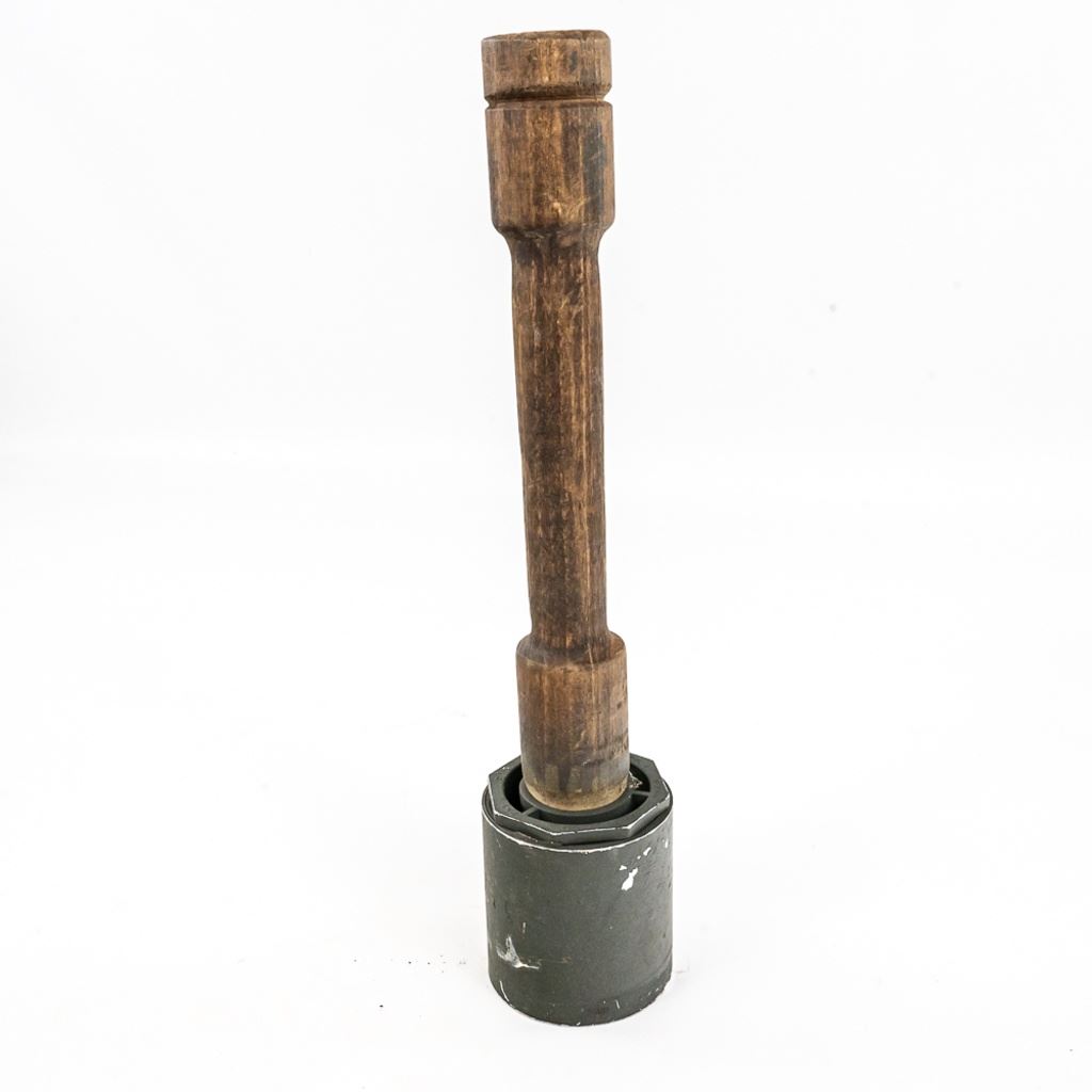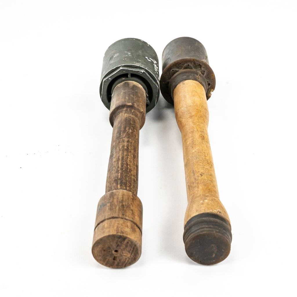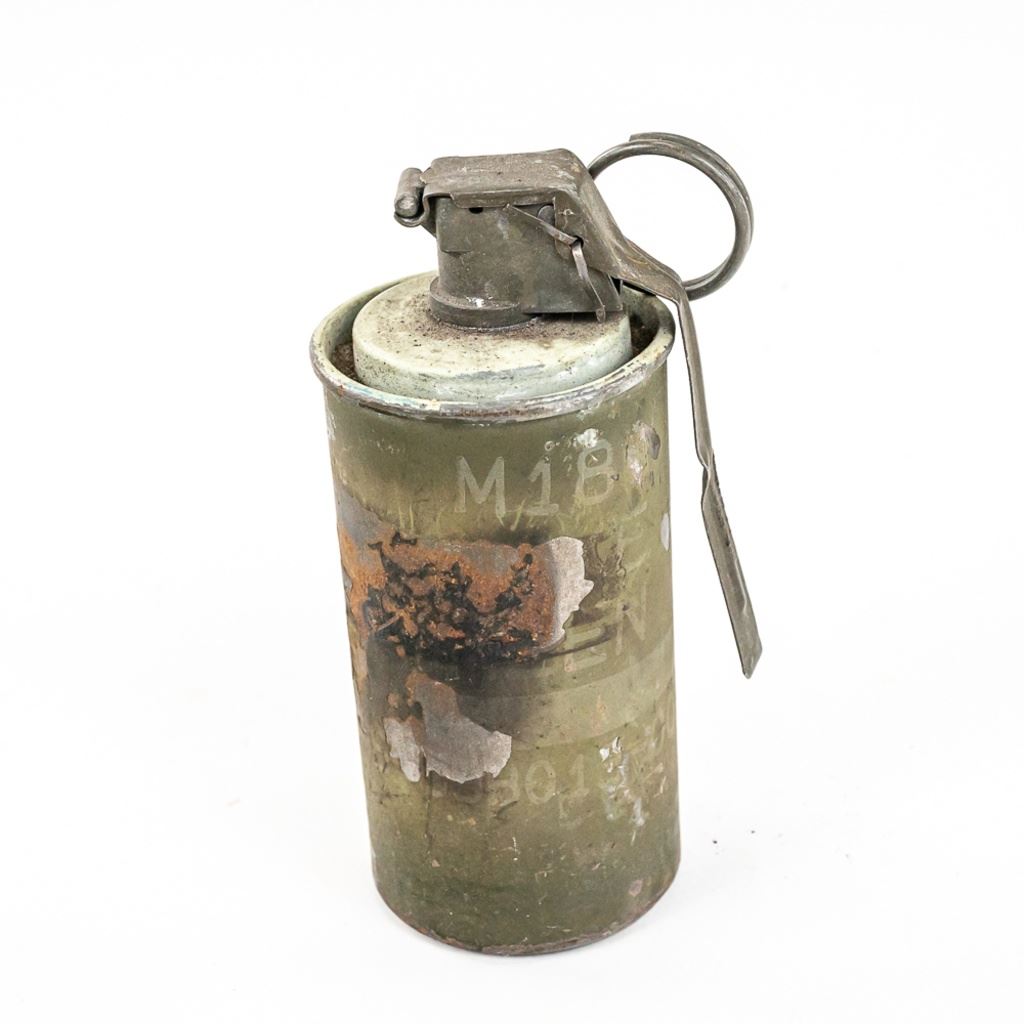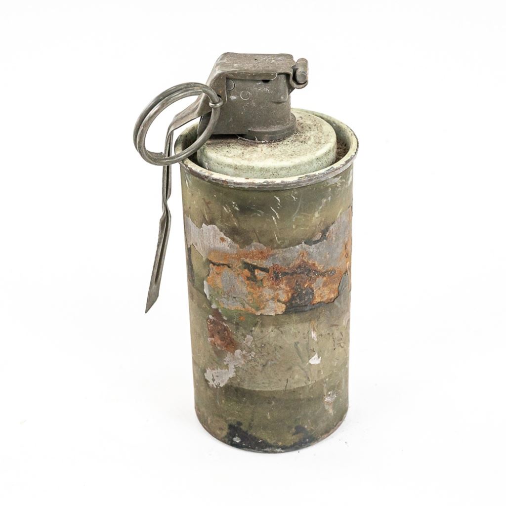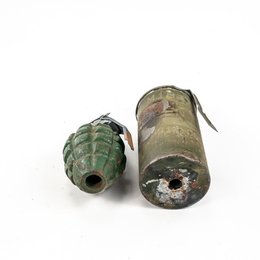 All items are inert and safe. This is from the famous prop house MTS Armorer FX owned by Matthew Stratton. His props were used in many movies and TV shows in the Chicago area and nationally. This lot of 4 includes 1) Very real looking German stick grenade with wood stick and rubber cap and head. Crude pyrotechnic German stick grenade made from wood and PVC pipe, 3) US pineapple grenade practice type marked RFX and has US practice fuse and 4) US M18 Smoke grenade. All items should much wear and age. Rubber grenade is in very good condition.