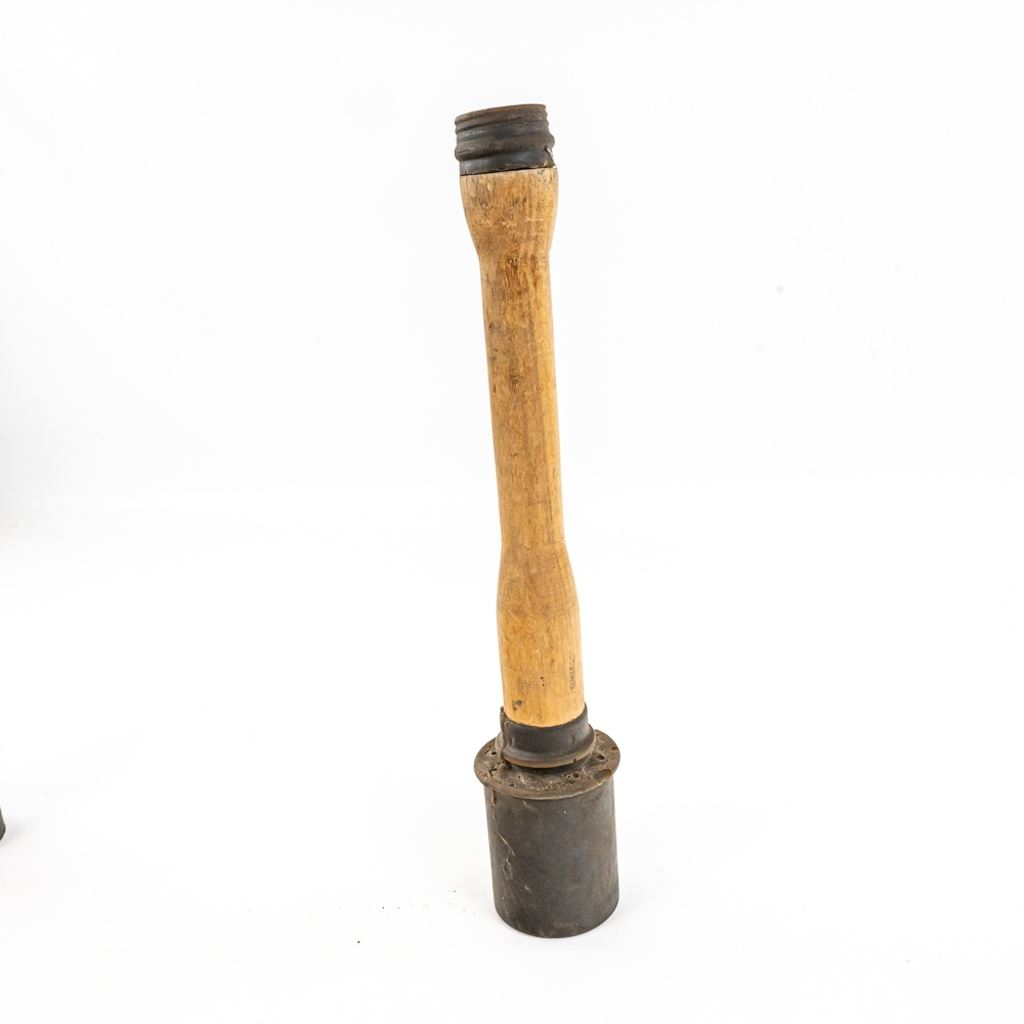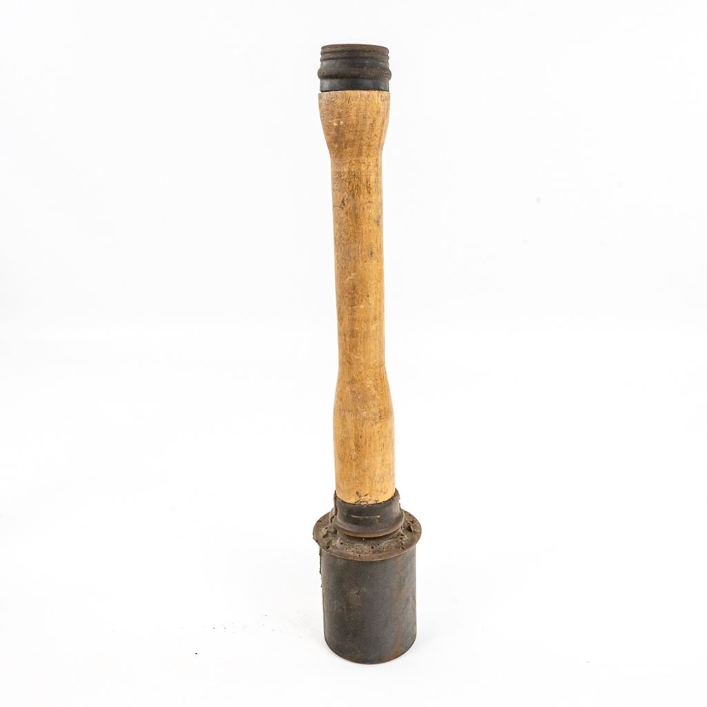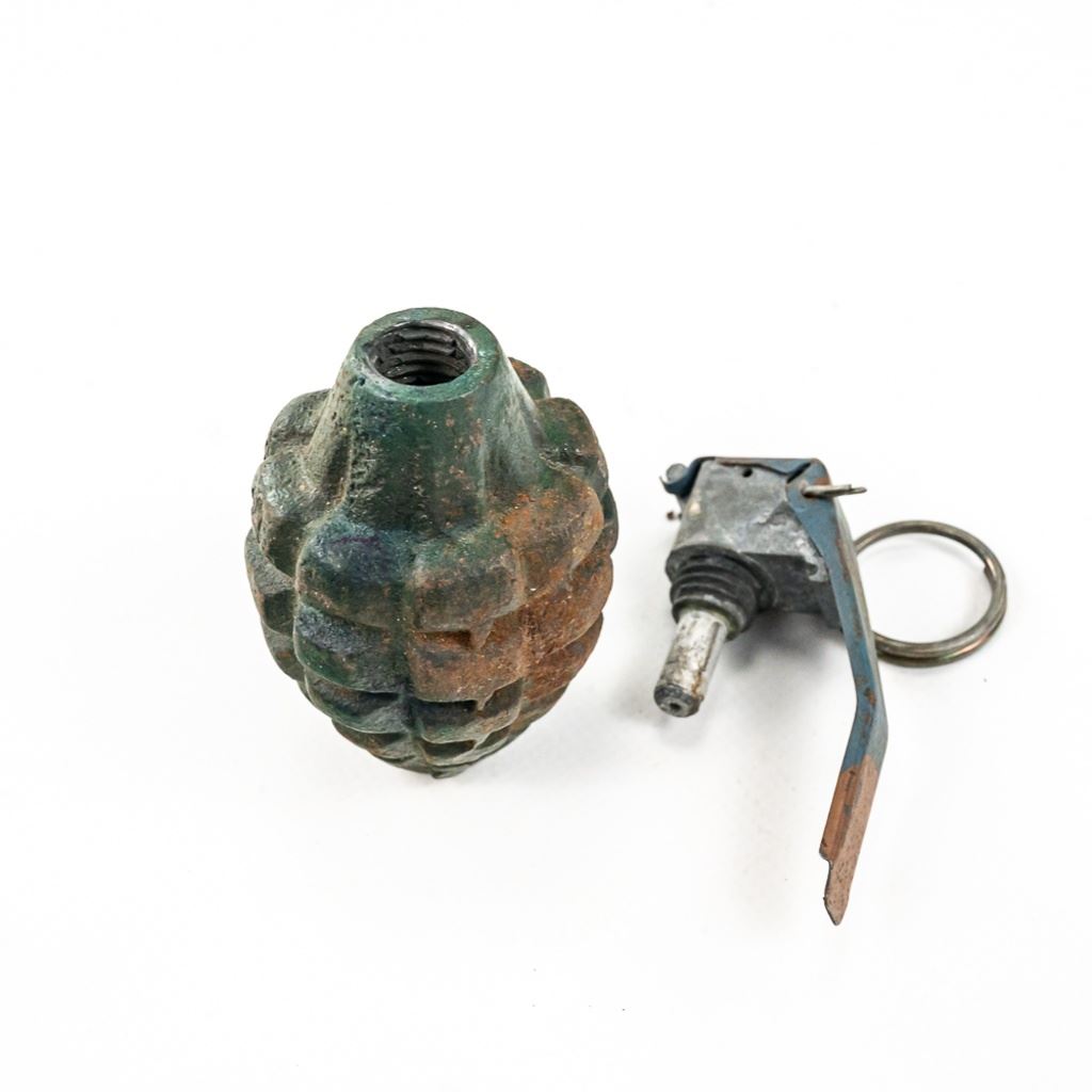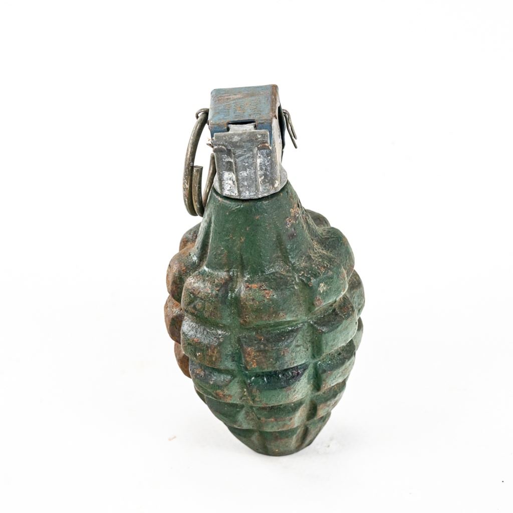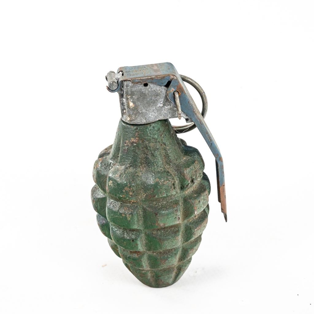 All items are inert and safe. This is from the famous prop house MTS Armorer FX owned by Matthew Stratton. His props were used in many movies and TV shows in the Chicago area and nationally. This lot of 4 includes 1) Very real looking German stick grenade with wood stick and rubber cap and head. Crude pyrotechnic German stick grenade made from wood and PVC pipe, 3) US pineapple grenade practice type marked RFX and has US practice fuse and 4) US M18 Smoke grenade. All items should much wear and age. Rubber grenade is in very good condition.