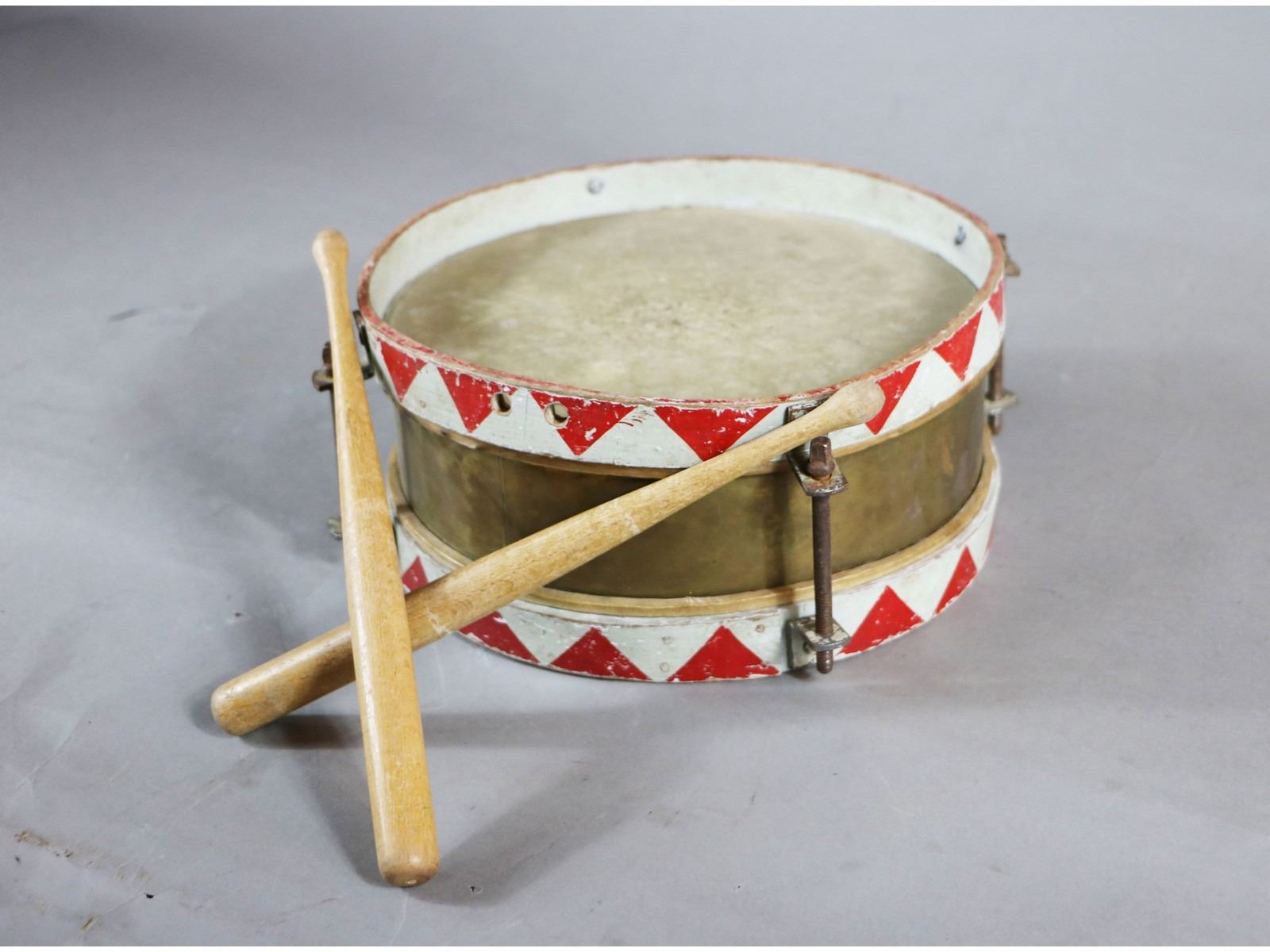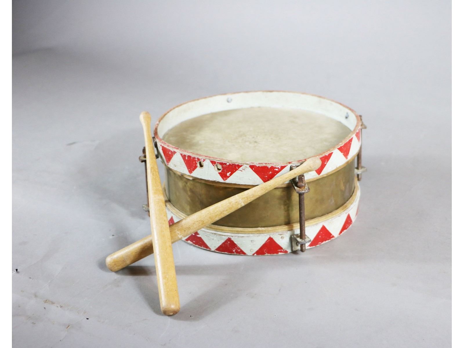 WWII ear Hitler Youth drum and drum sticks. Hitler Youth was an organization for young boys between 14 and 18. The drum was used during parades and other activities. Paint is worn around the edges and the coloring is slightly faded. Drum has no cracks in the wood or skin. Still works and sounds great. See photos.