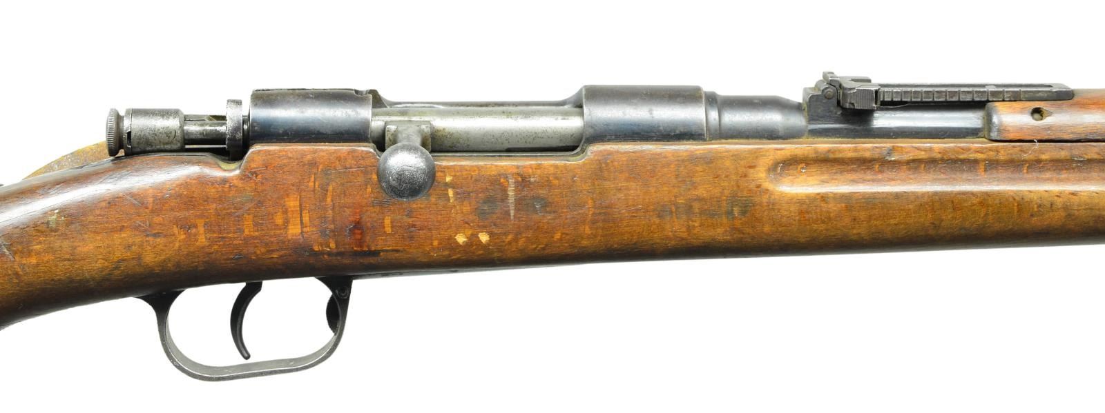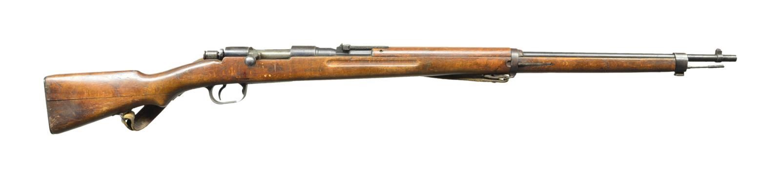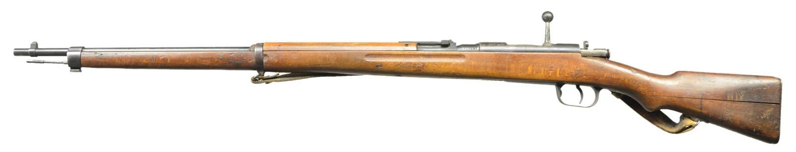 RIFLE. Cal. 6.5mm. S# F2343. Bbl. 30 3/4". Bbl. is marked only w/ S#. These rifles were produced in Italy for Japan & research indicates they were acquired by the Japanese Navy as the Army took almost all of the domestic production. The Italian production was accomplished between the years 1937-1939. Several Italian government arsenals cooperated in the production of parts for these rifles. The rifles used the basic Italian Carcano action but w/ Japanese features such as the 2 piece stock construction, magazine rear sight, plus bayonet attachment. Ladder rear sight graduated to 2400 meters. Inverted V front sight. Straight bolt handle. Cleaning rod is present. Hardwood stock set has 2 piece construction w/ bottom swivels. Period Japanese leather sling. CONDITION: stock set has moderate wear, staining & handling marks. Buttstock joint is notably open. Left side of butt has "HIX" carved in cheek area. Rear sling swivel screw is not present. Metal has traces of blue, turning gray w/ patina plus traces of oxidation & very fine pitting. Worn bore turning dark in grooves. PROVENANCE: From the Lifelong Collection of Glen E. Mattox. (23-98/RW). CURIO. $300-400.